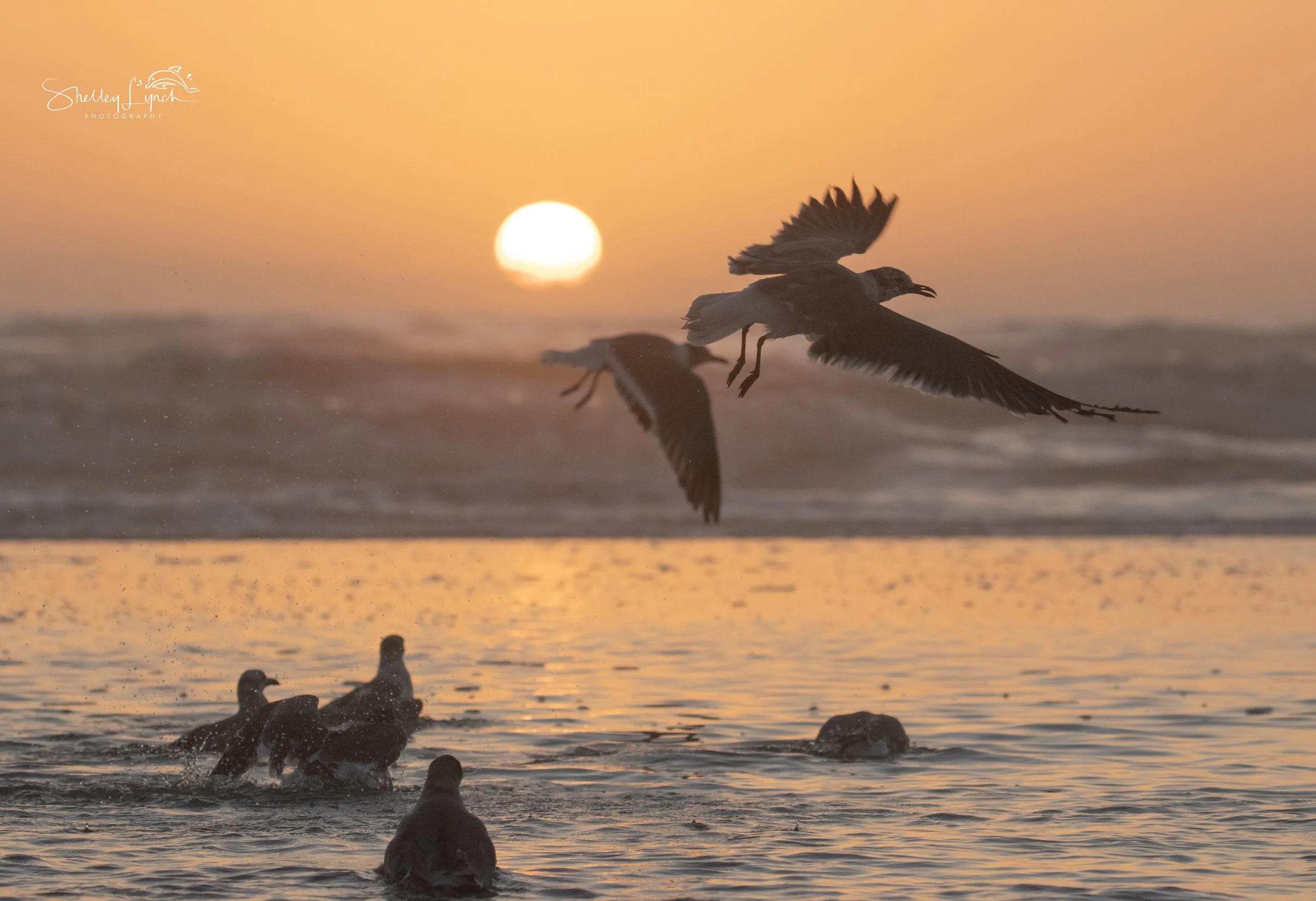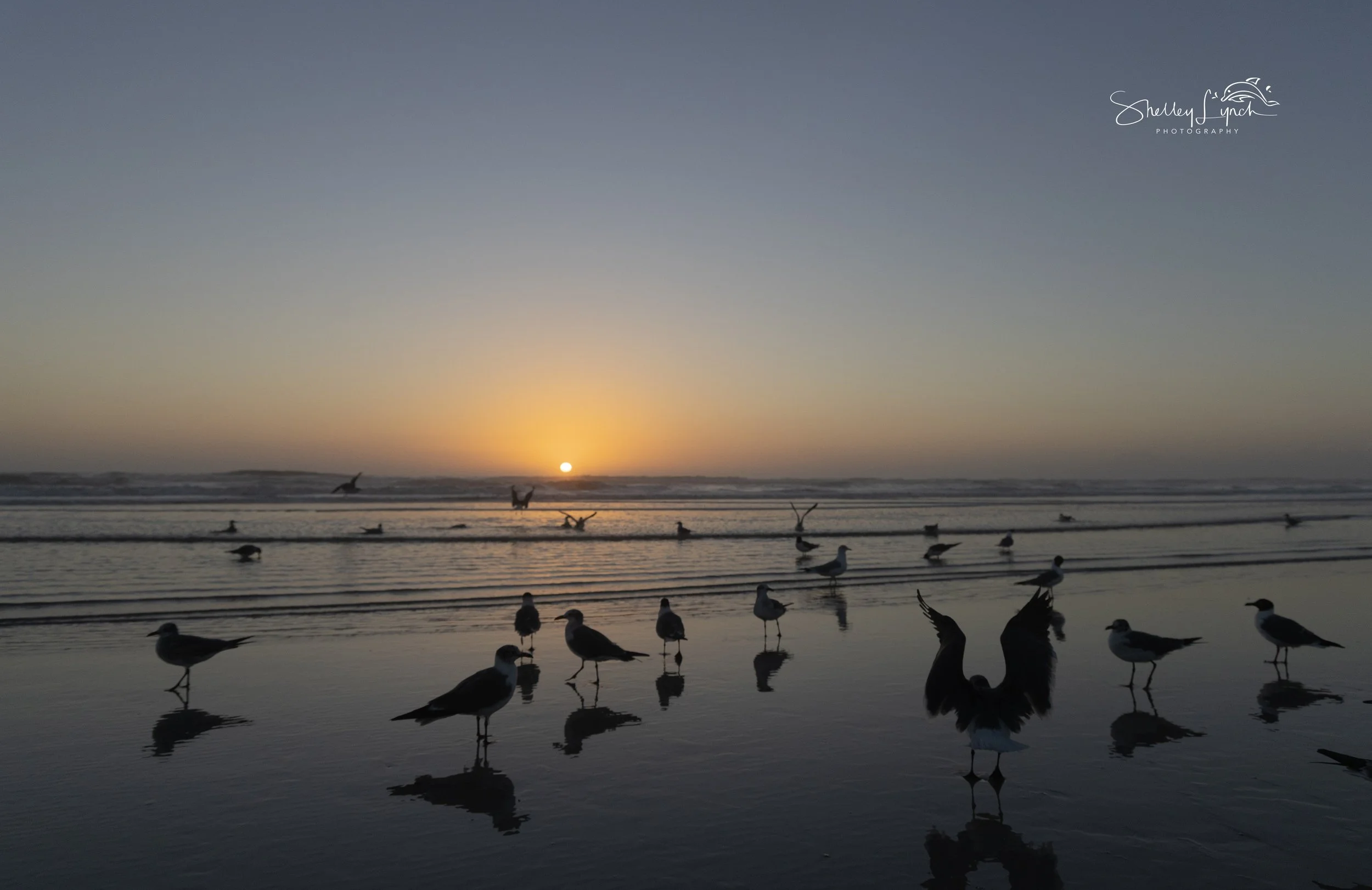 As my feet hit the sand the sky was filled with a soft copper glow in anticipation of the sunrise. The flock was easily spooked by a beach ball left behind, darting off and back before settling down to enjoy our daily bath time.