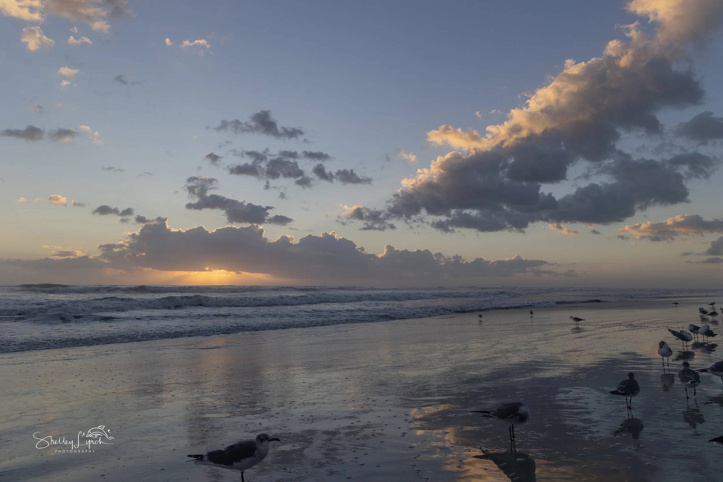 With rain approaching, Mother Nature was able to squeeze in a sunrise before the rain. The chatty flock of gulls, terns and sand papers were already at the edge of the ocean ready to get squeaky clean.
