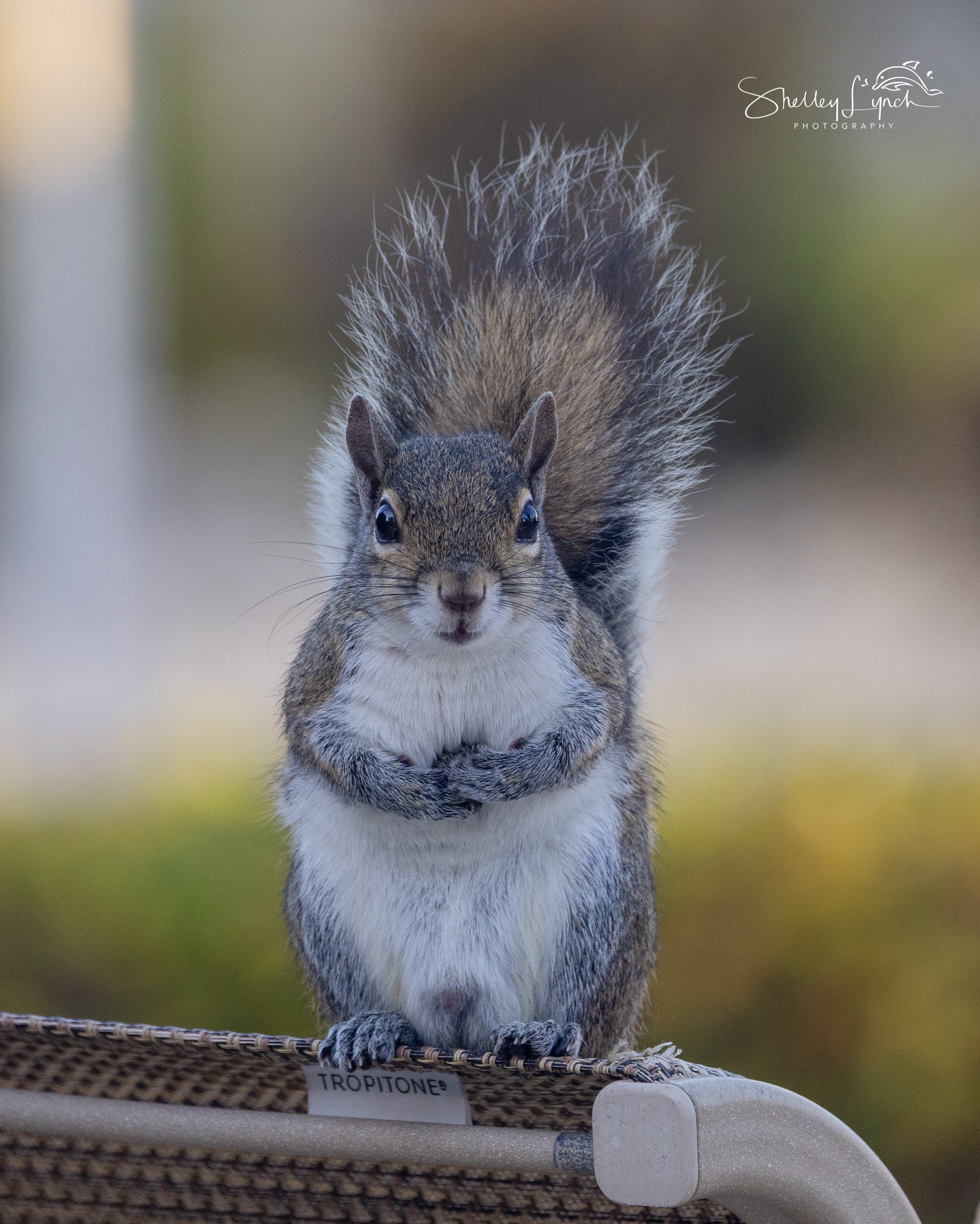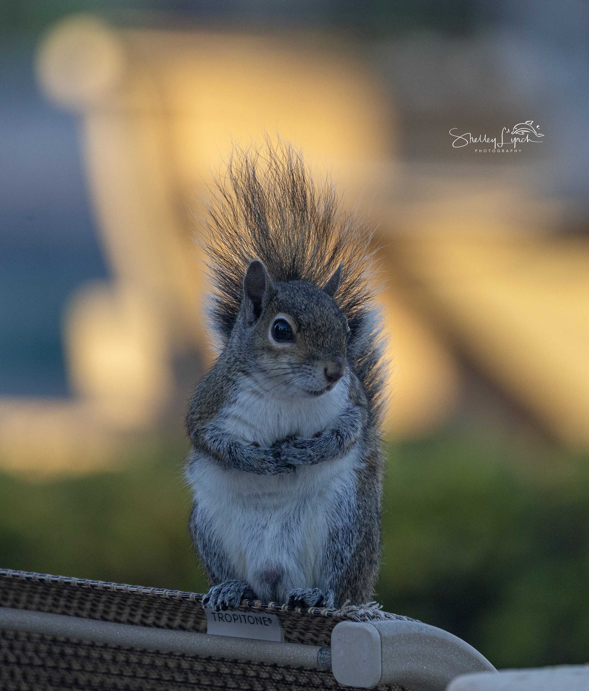 After sunrise, a squirrel with his tail up stopped me in my tracks.