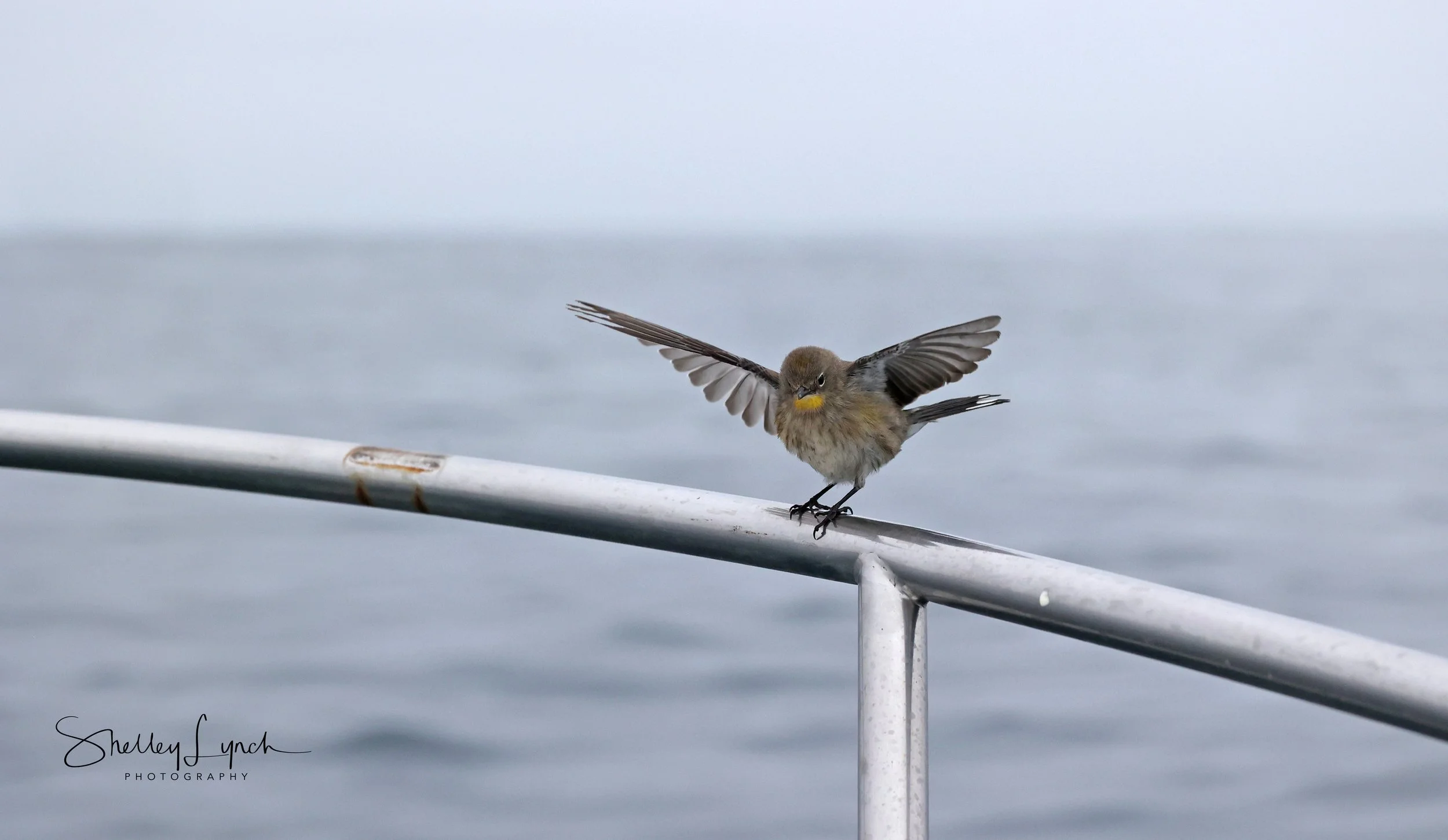 On this chilly and overcast day, we were 6 1/2 miles off shore, nothing around, when this cute little warbler came to join us on our whale journey. The railing was slippery but this nugget knew how to keep his wings out until he was steady.