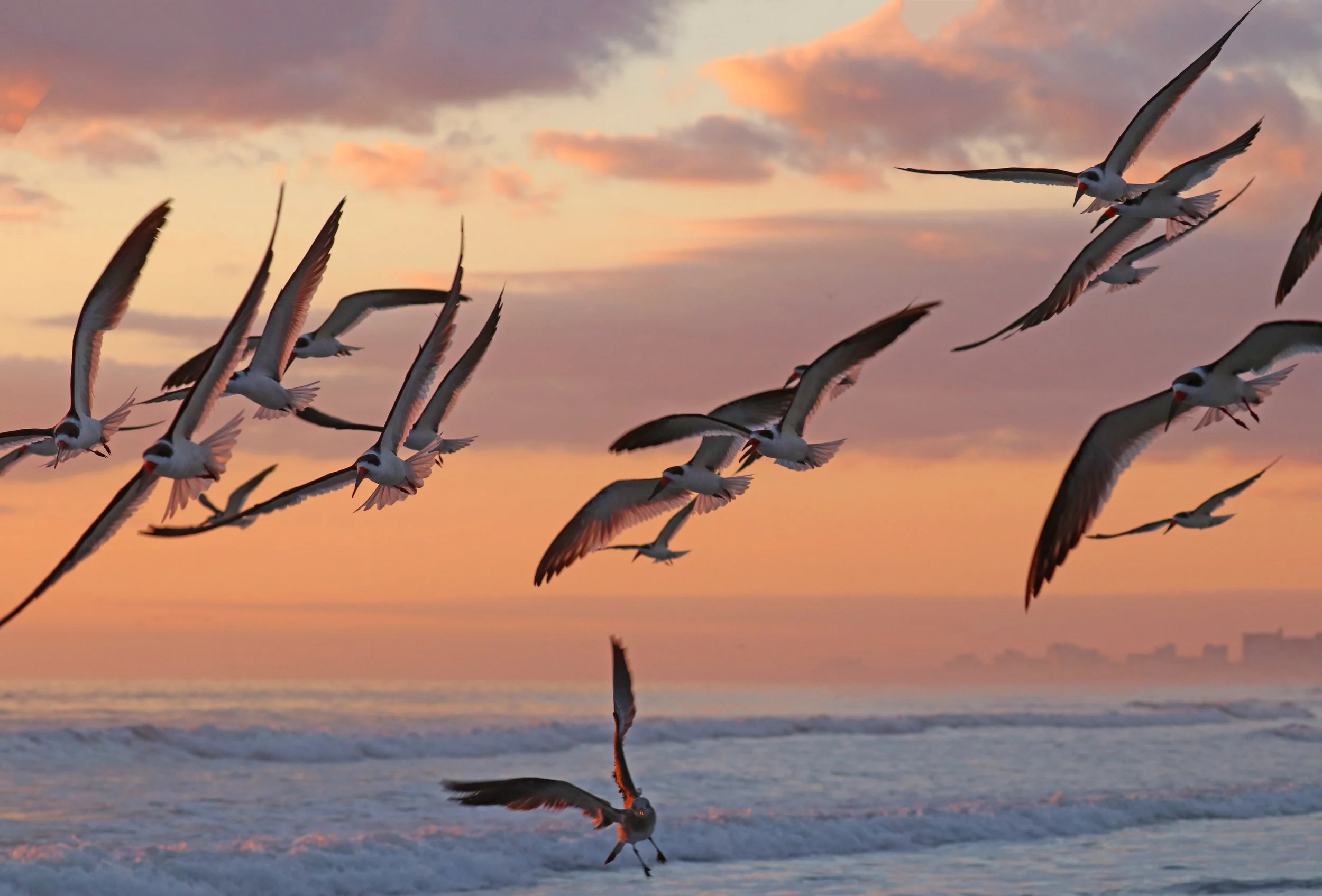 The light and color show was exquisite today. Beautiful pink, orange, and reds were glistening on the calm ocean. The flock of seagulls flew in before the sunrise and just a few minutes later hundreds of skimmers joined in. We have a theme today, a message of connection from many.