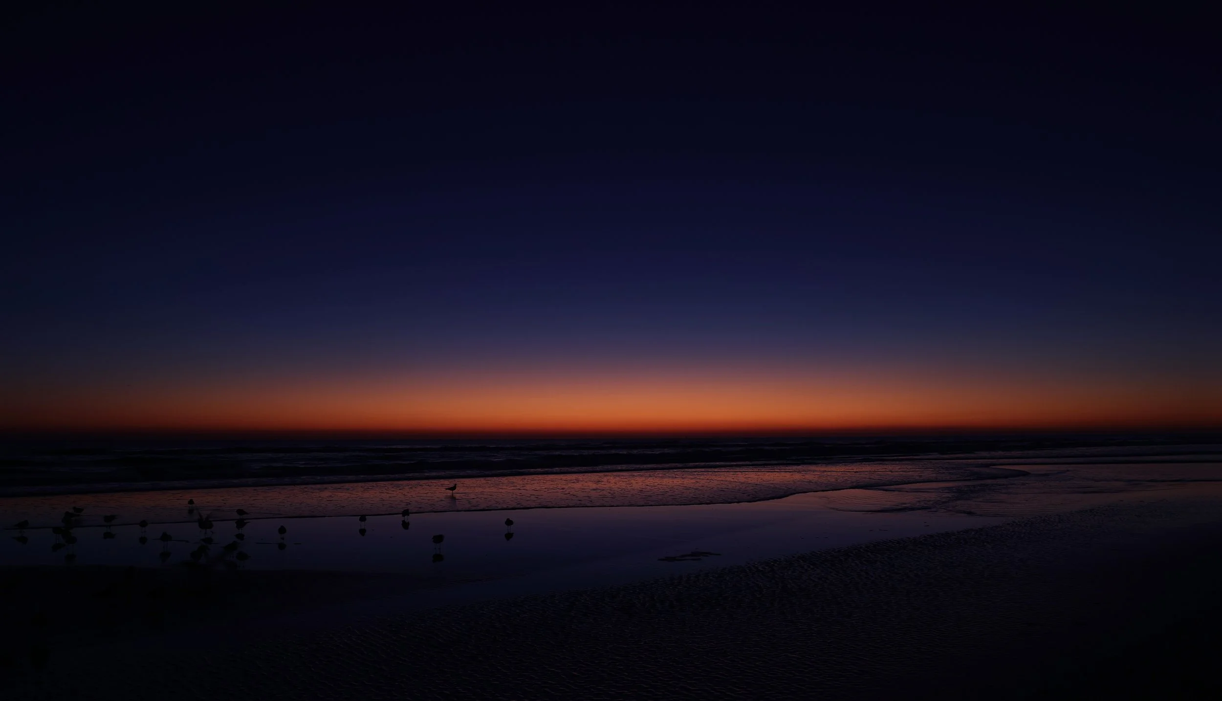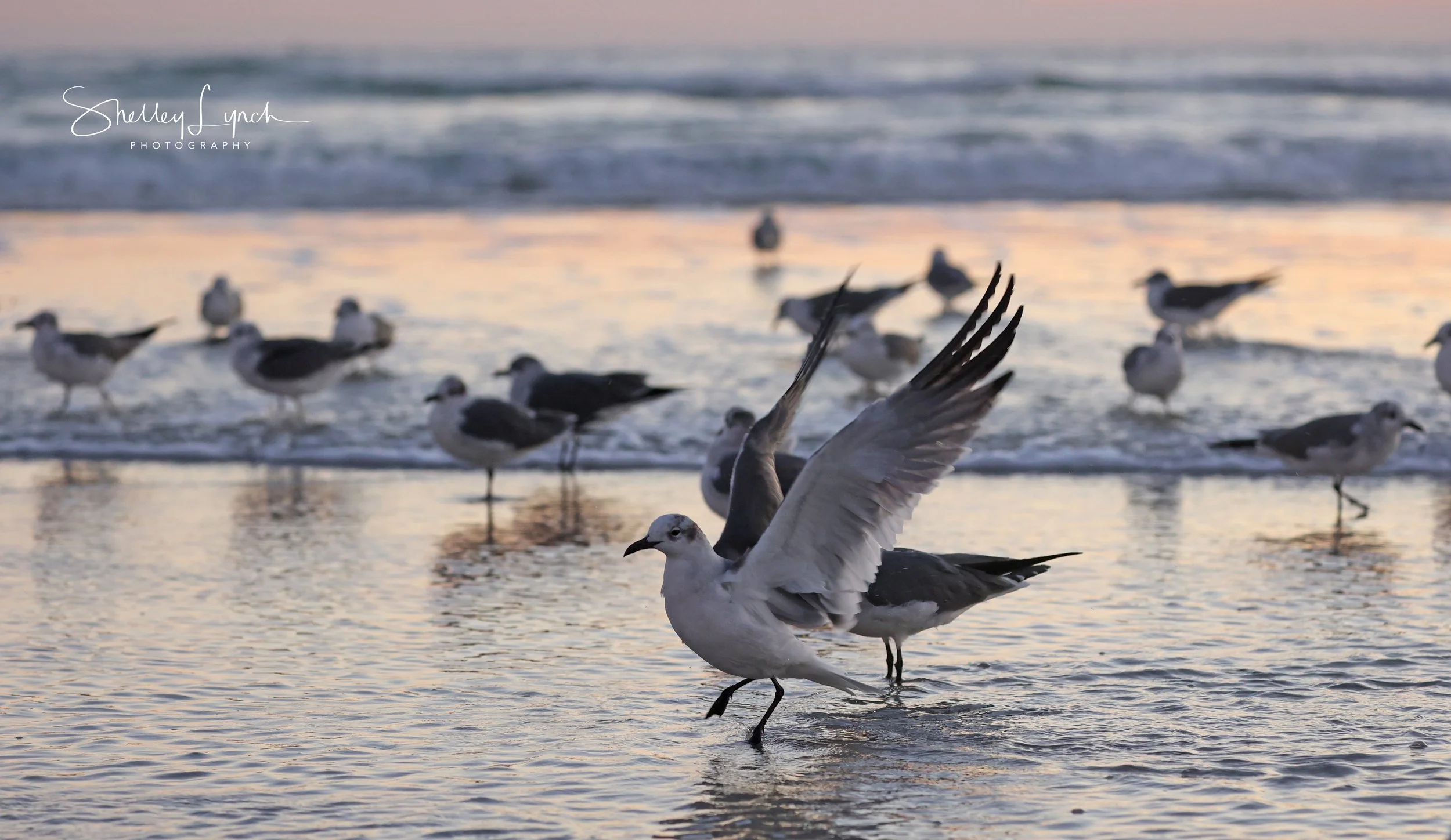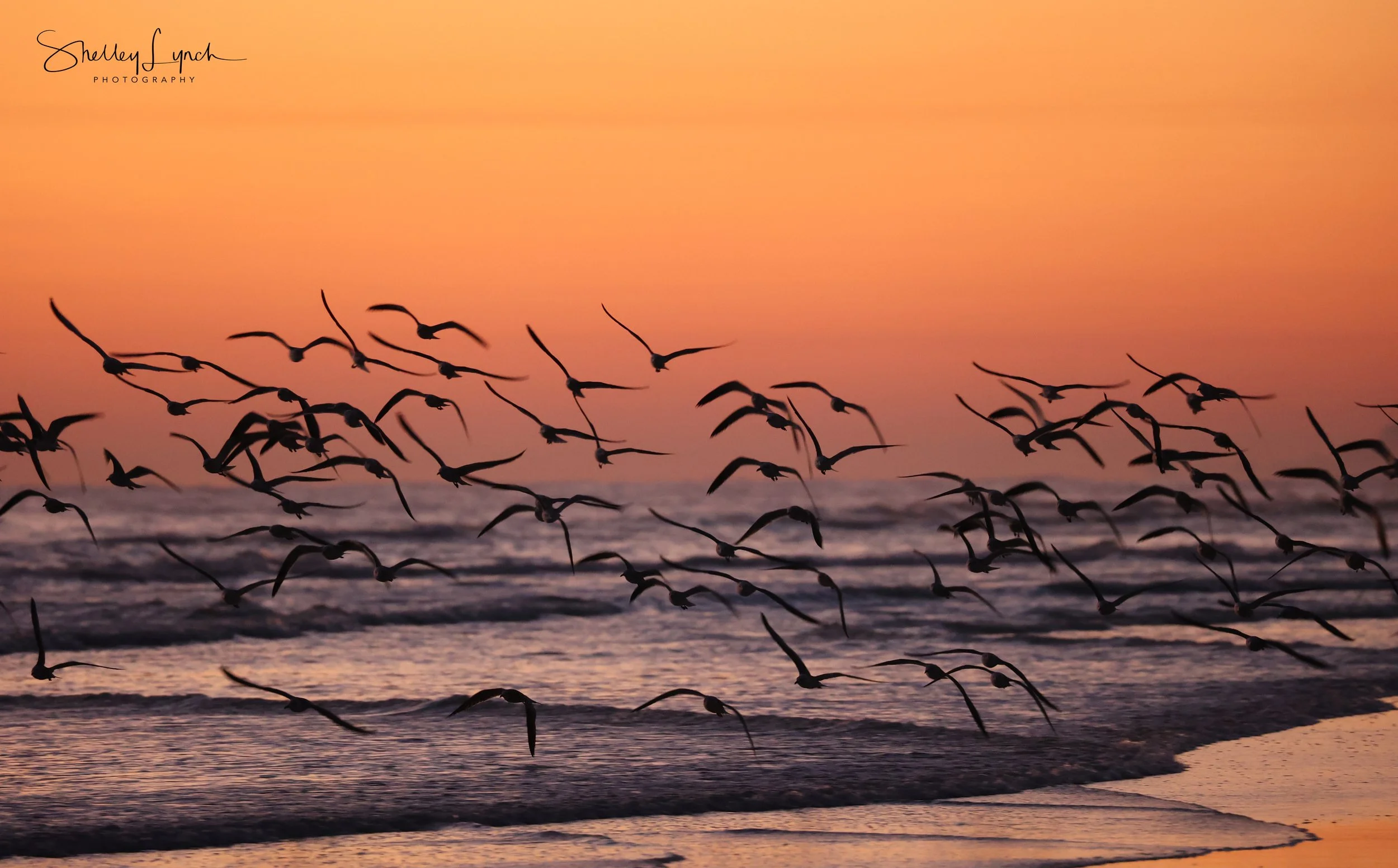 The morning was cool and crisp with a wide open cloudless sky. The orange glow was bright long before the sun came up to greet the day. The flock of gulls could be seen coming down the beach in perfect form.