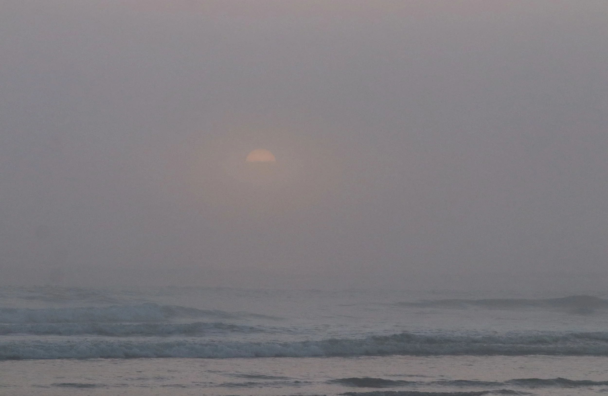 The fog was even heavier this morning bringing us an almost black and white sunrise with a dash of golden and pink. The ocean was calm for the first time in weeks adding to the serenity of the morning.