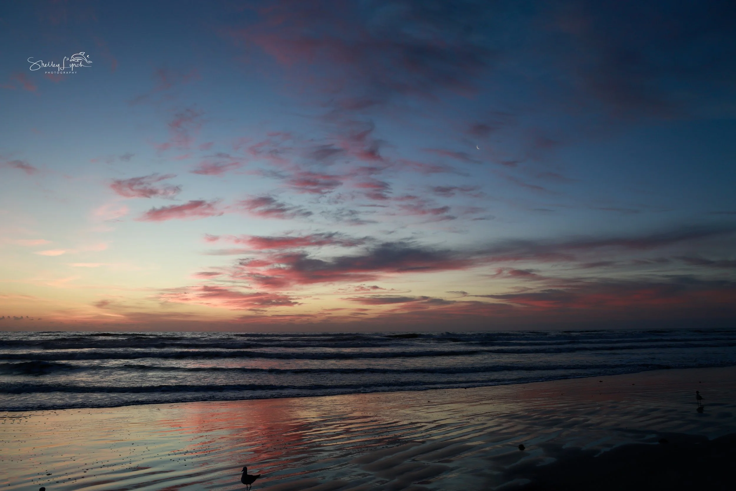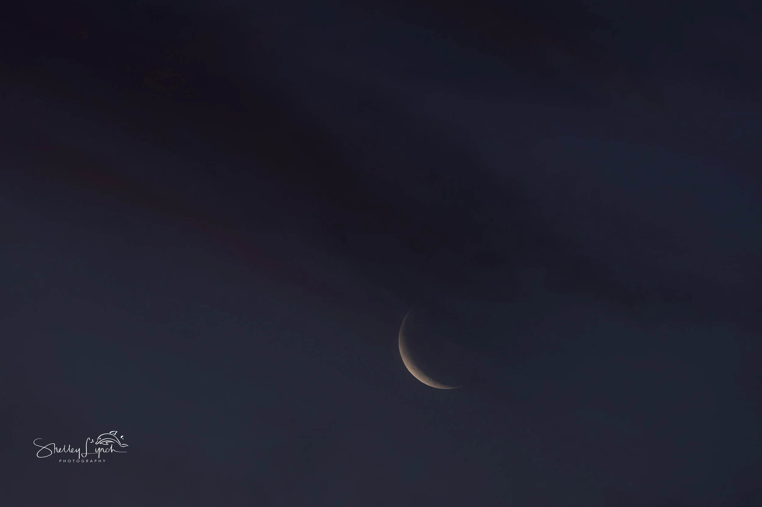 First light filled the horizon with deep pinks and purples. A delicate sliver of the waning moon lingered, wrapped in soft, wispy clouds, as the sun began its slow rise to greet the day.