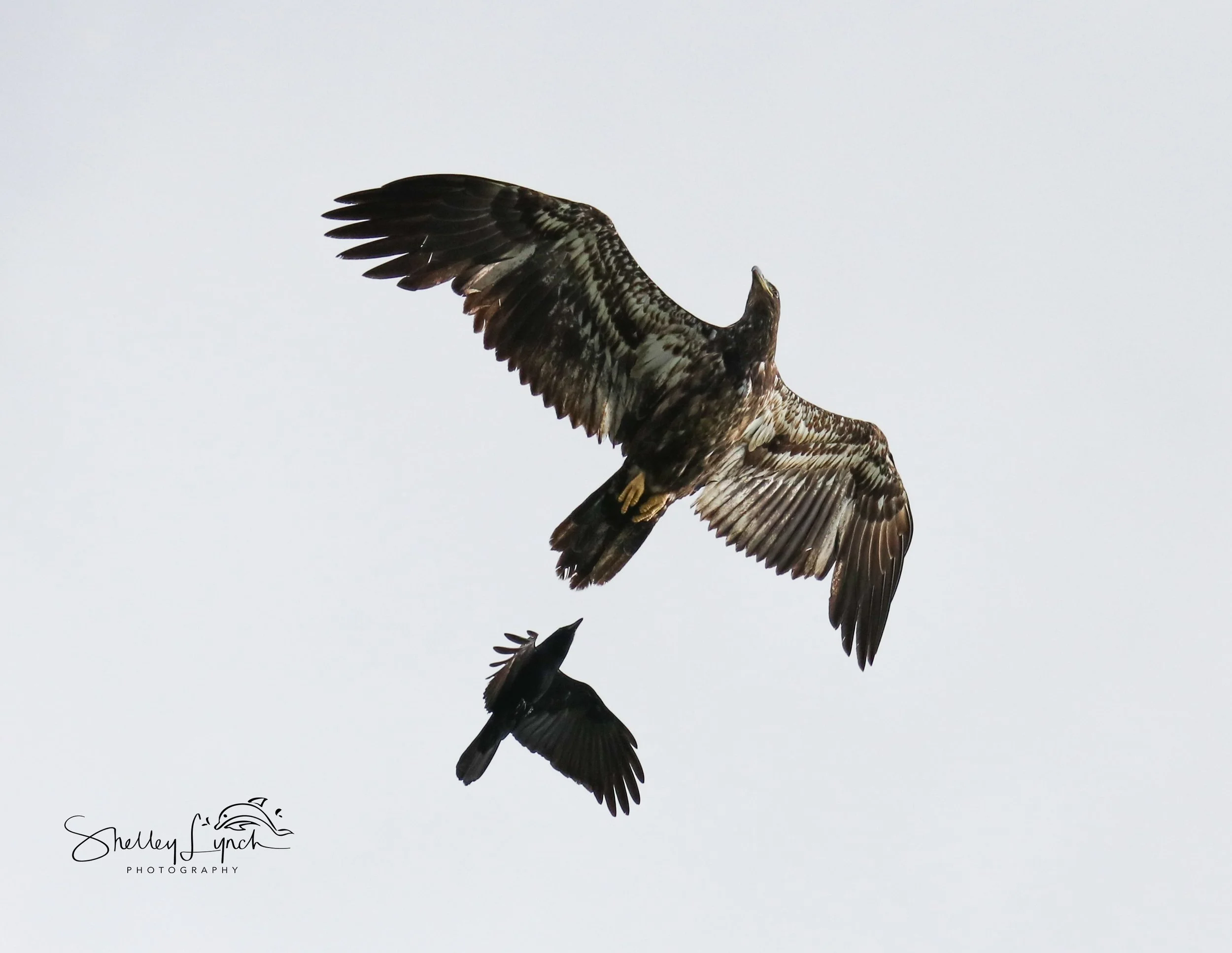 On my way off the beach, I heard the call of a bald eagle. Looking up, I saw an immature bald eagle being chased by a crow not even half the size of the regal predator.