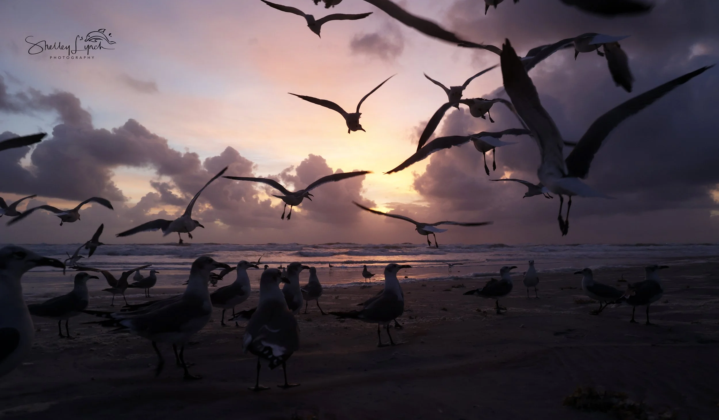 Mother Nature mixed several colors, giving us a unique color palette. Waves rolled in, sending salty foam flying in the wind. The flock flew in, using the wind to hang in place. Pixar the laughing gull hung overhead to connect.