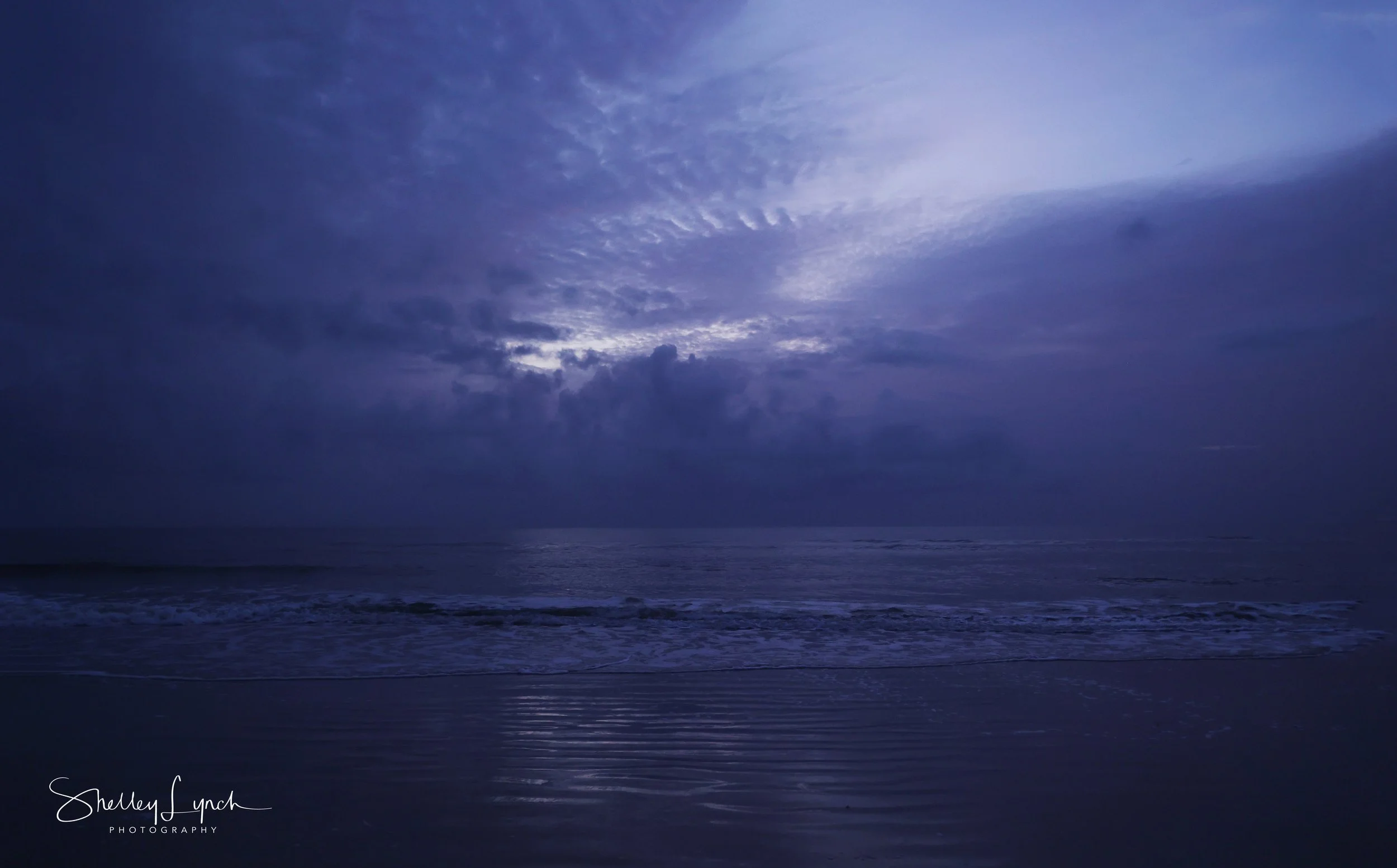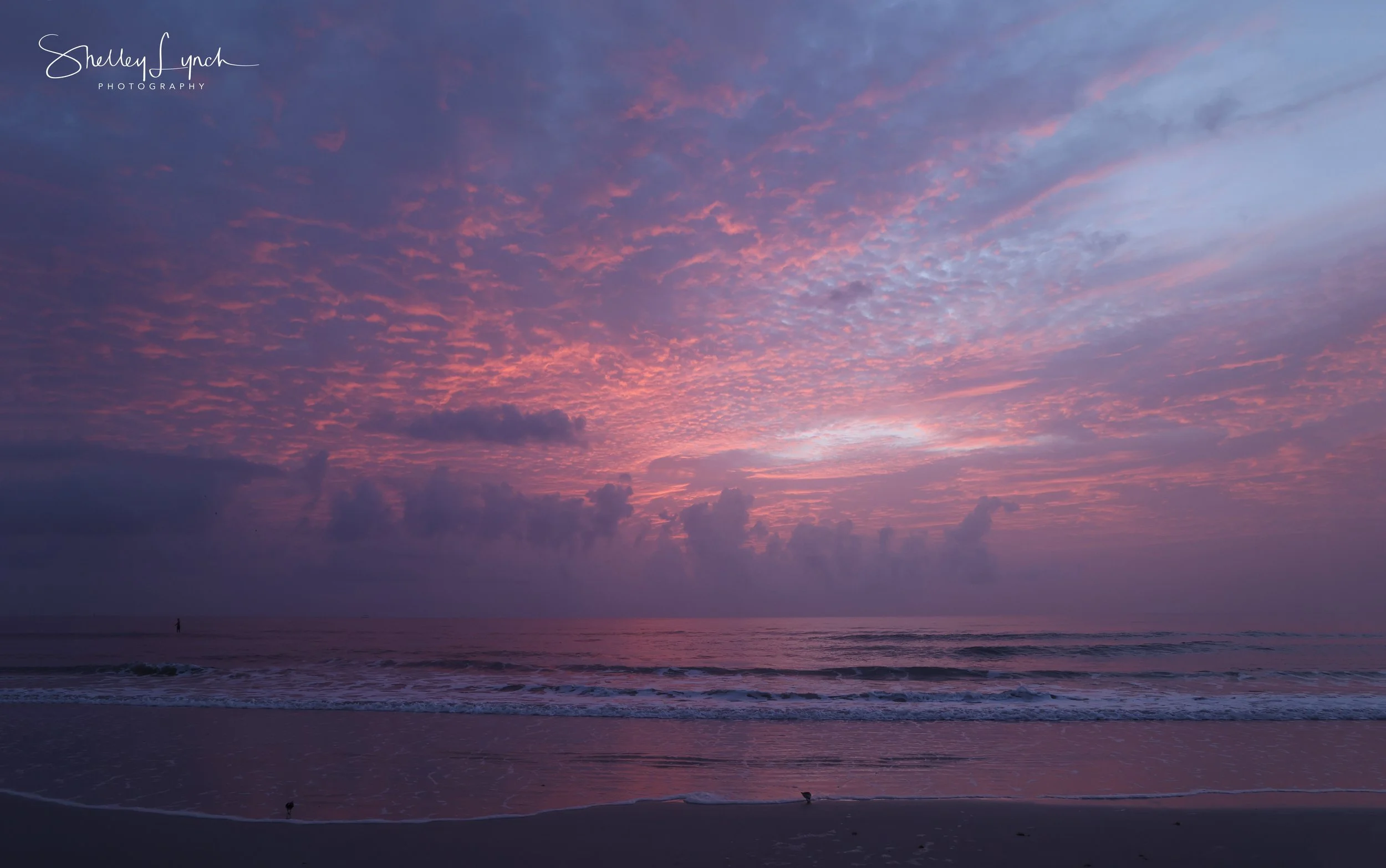 Mother Nature brought us a cozy sunrise with fluffy clouds hugging the shoreline. First light was a sultry purple with silver light peeking through. Eventually an intense pink glow filled the sky but only for a few moments before dissipating.