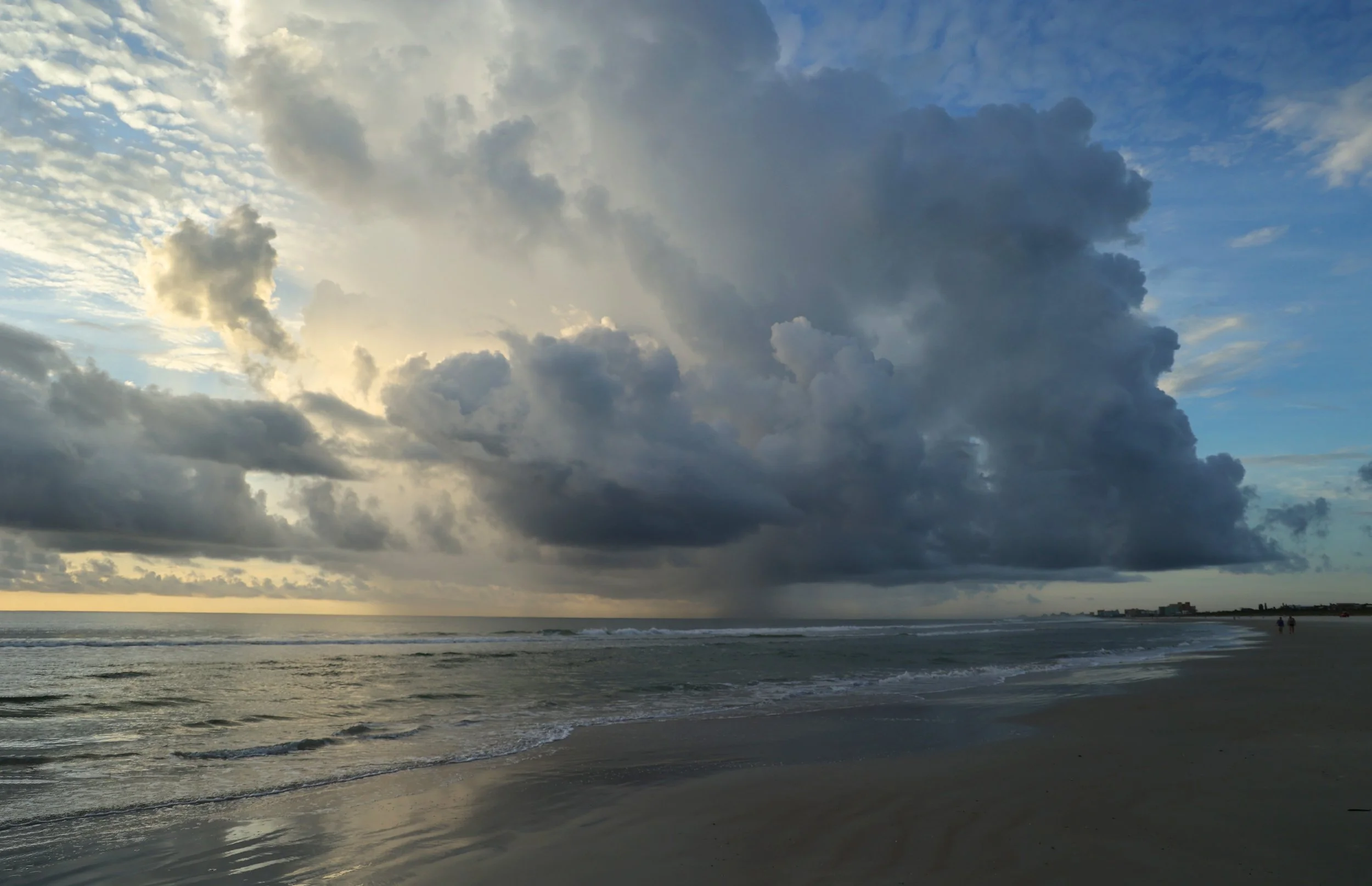 Mother Nature brought us a dramatic sunrise with huge clouds, rain and a dark color palette. The breeze was light and the ocean was calm with some nice surfing waves rolling close to shred. The flock of seagulls flew in very loud and chatty for our usual bath time.