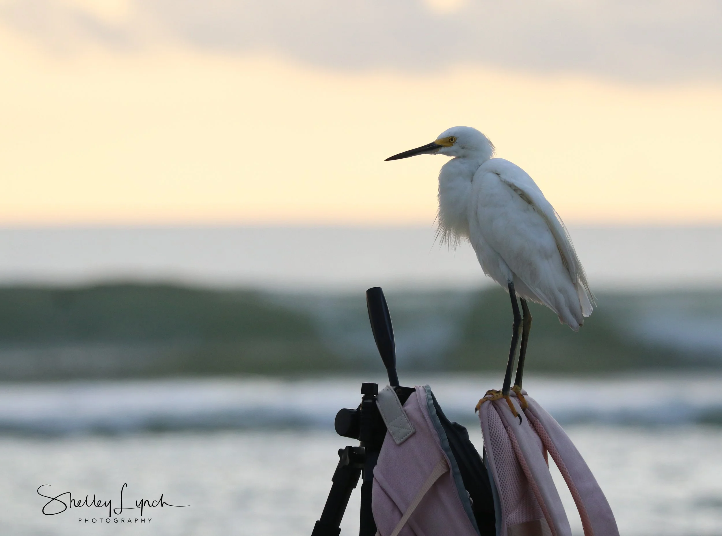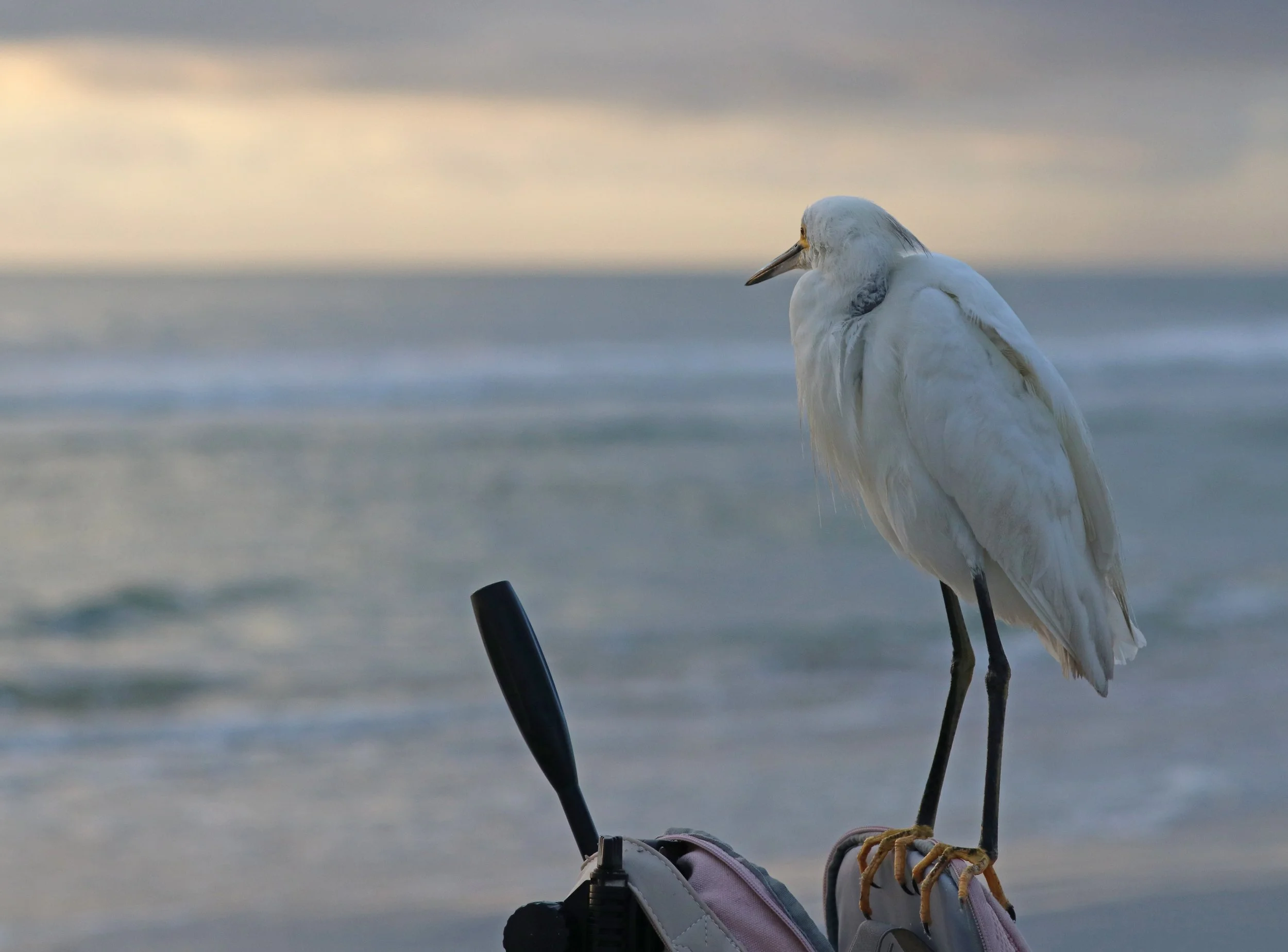 While I was in the water a nice woman stopped to photograph an egret hanging out on my bag. I came out to chat with them both.