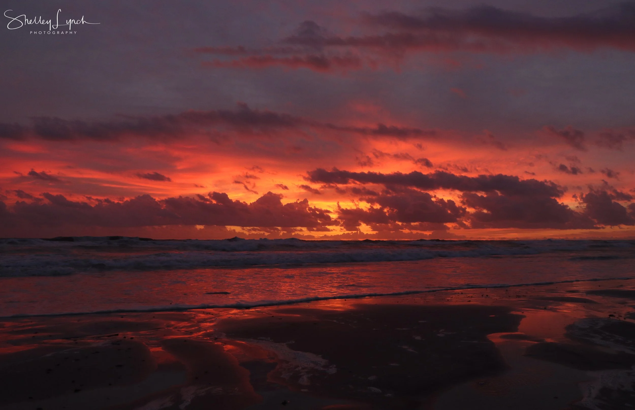 Weeeeeeeee! With a few days of rain not he way, it was a windy and red hot sunrise today! First light was a rich purple and pink color that quickly changed to an intense red.