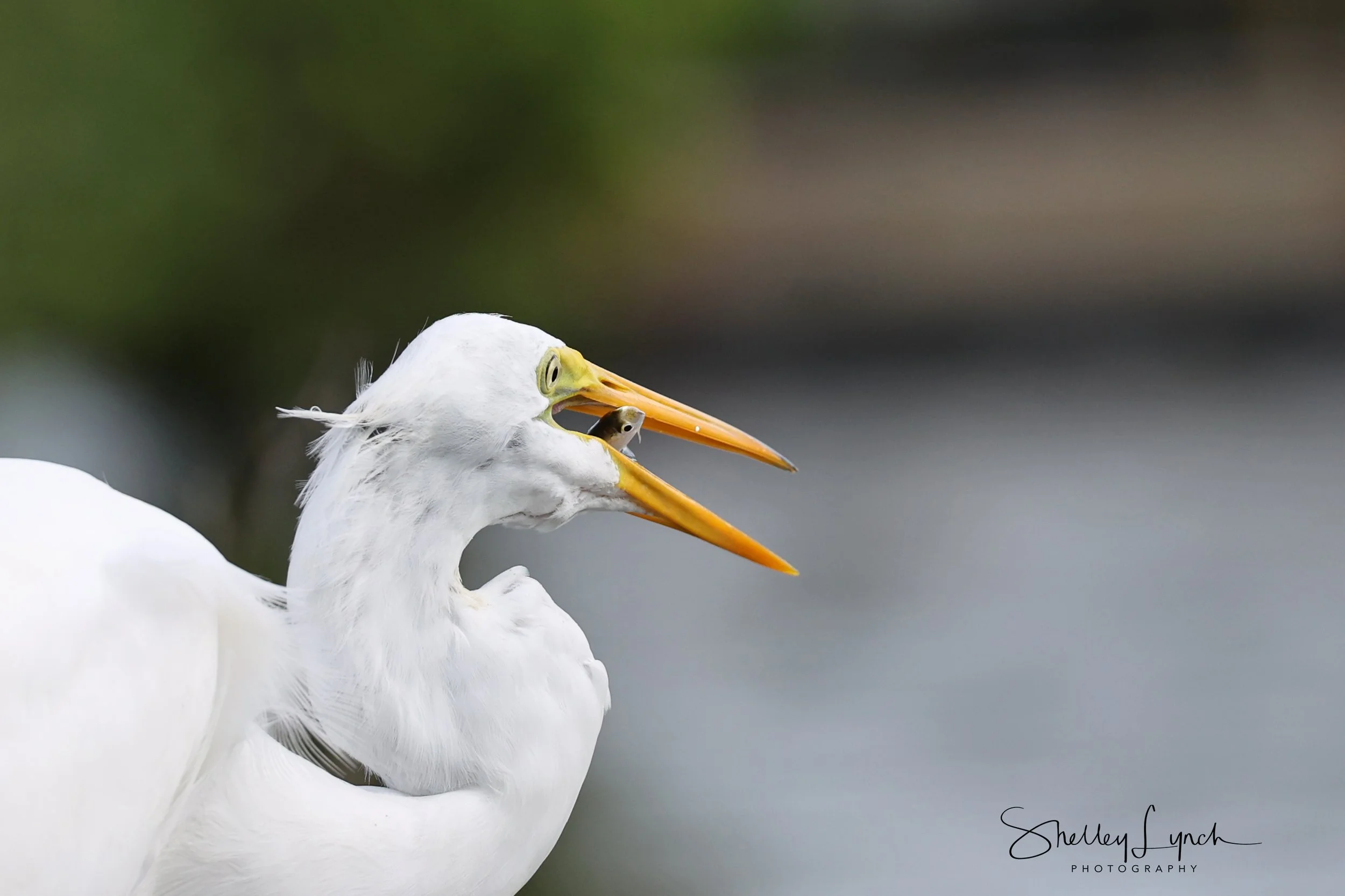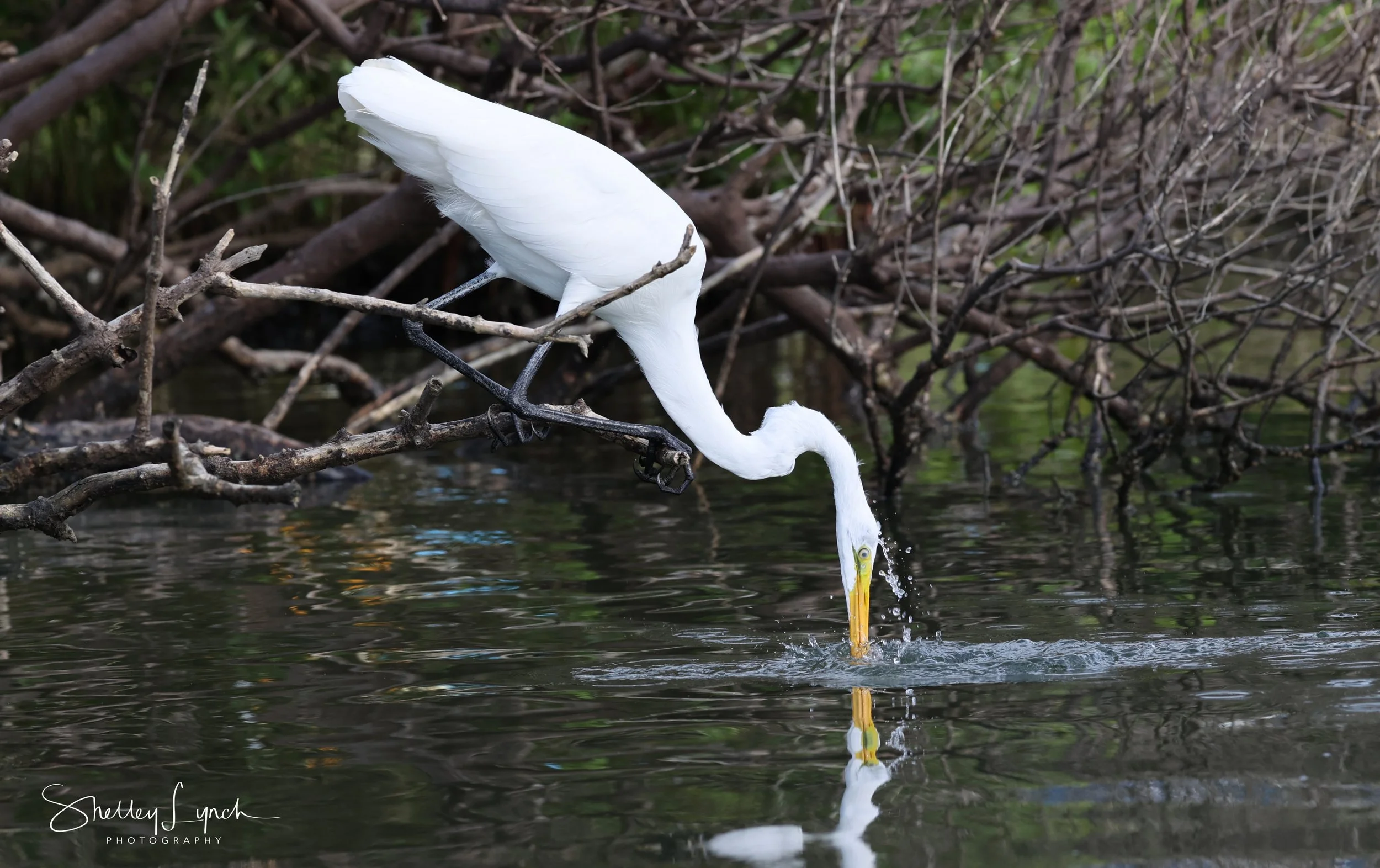 Mikey the great egret was grabbing snacks after sunrise. I asked him about his fishing technique and he said, “I walk out onto the edge of the branch so I can lean into the water to grab the fish.”