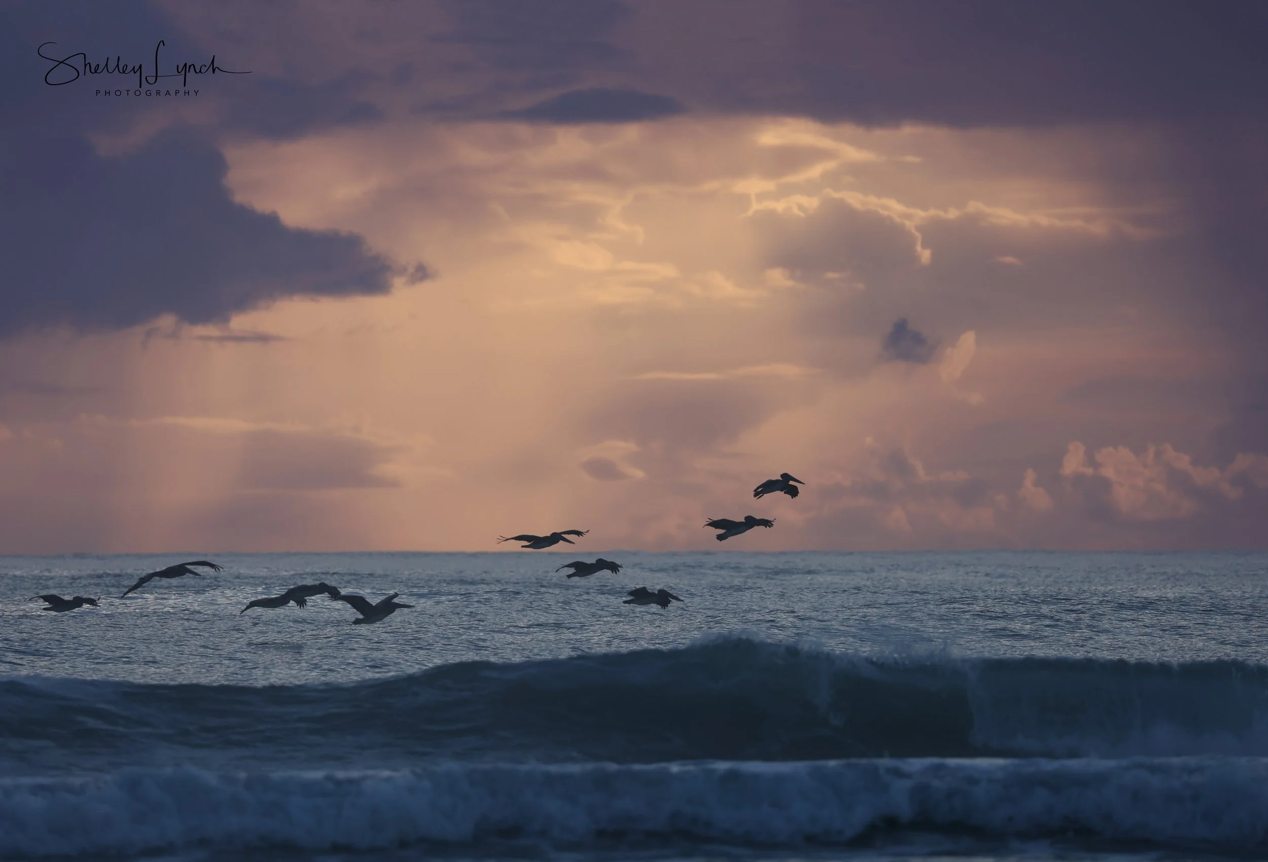 Pelican Highway was jamming flying southbound with the beautiful golden glow behind them. The waves were catching the soft pastel light as they rolled toward shore.