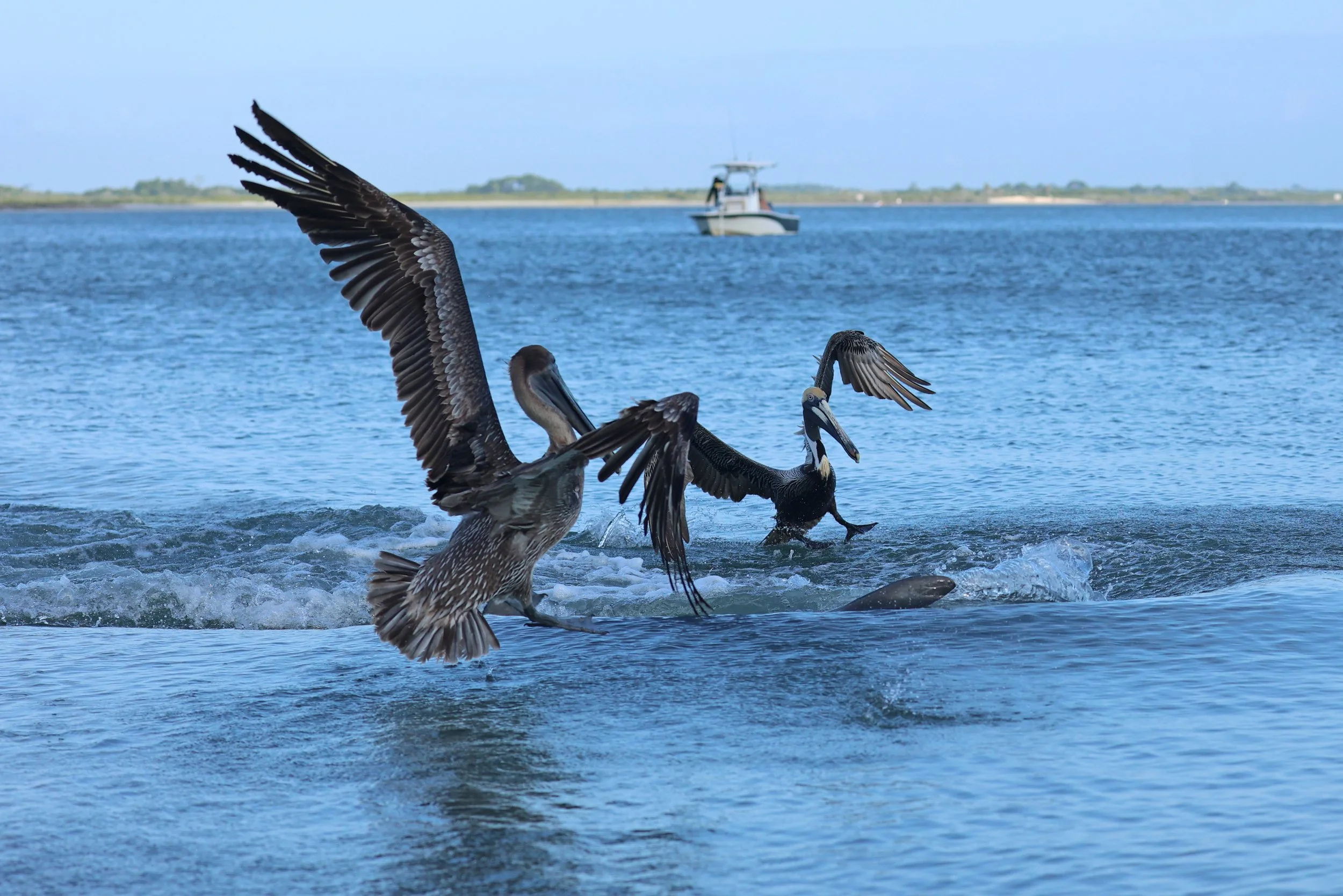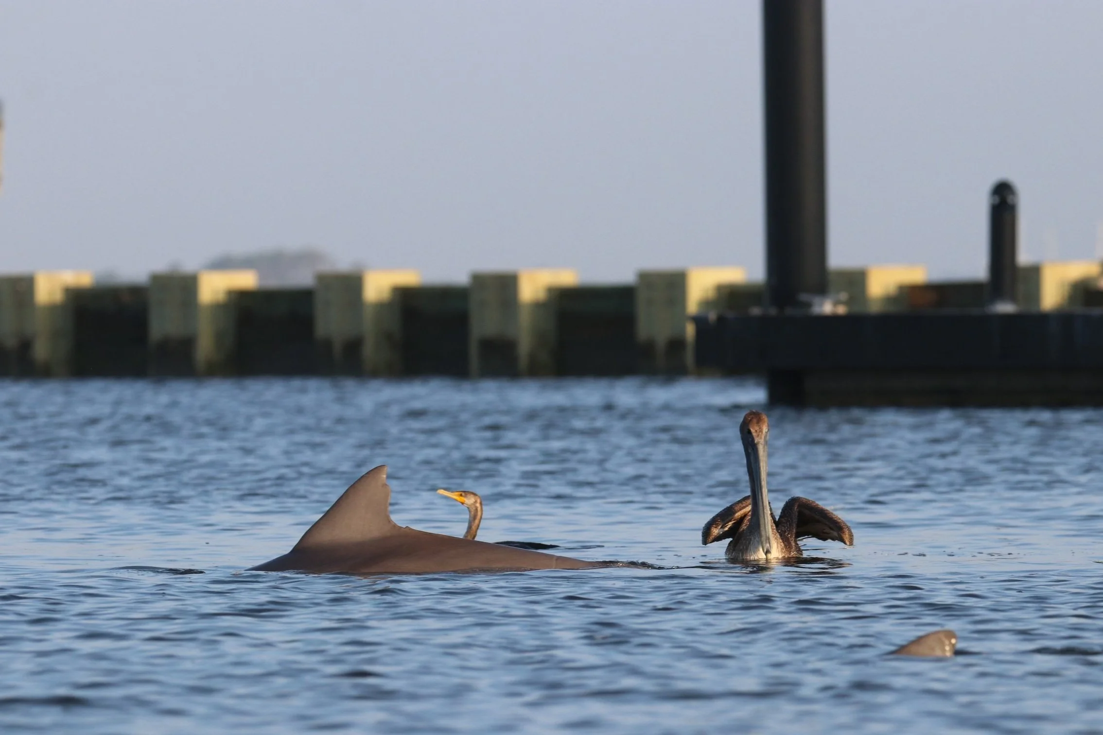 One day I was hanging with Shelley where the dolphin and other pelicans were feeding. She said, Why don’t you go see if the dolphins will toss you a fish.” I tried, but those mature pelicans are a bit intense and scared me so I pooped a lot and got out of the mayhem! I've learned only to hang out with the mom dolphins and their kids, it tends to be less crazy.