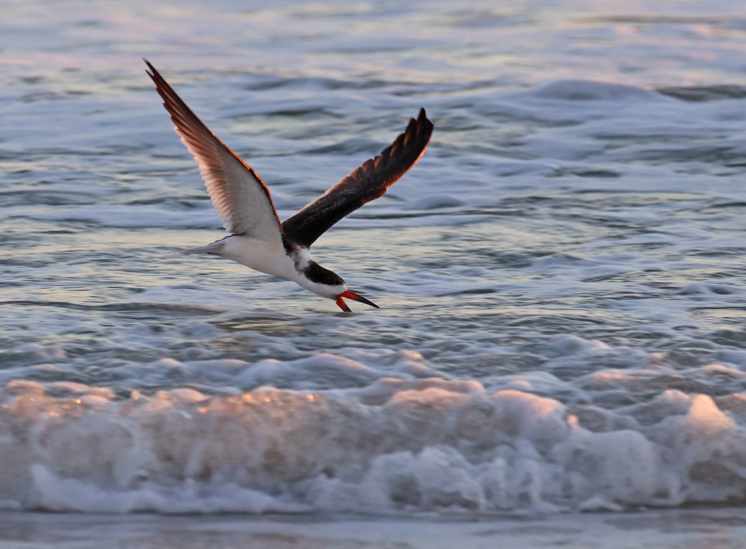 The pre sunrise sky filled with a vibrant orange glow. The wind was chilly and catching the tops of the perfect waves as they rolled toward shore. The flock of seagulls flew in just before the sunrise and much to my surprise a huge flock of skimmers joined the seagulls. Ruddy turnstones, willets, sand pipers and 3 egrets joined in forming a massive flock birds.