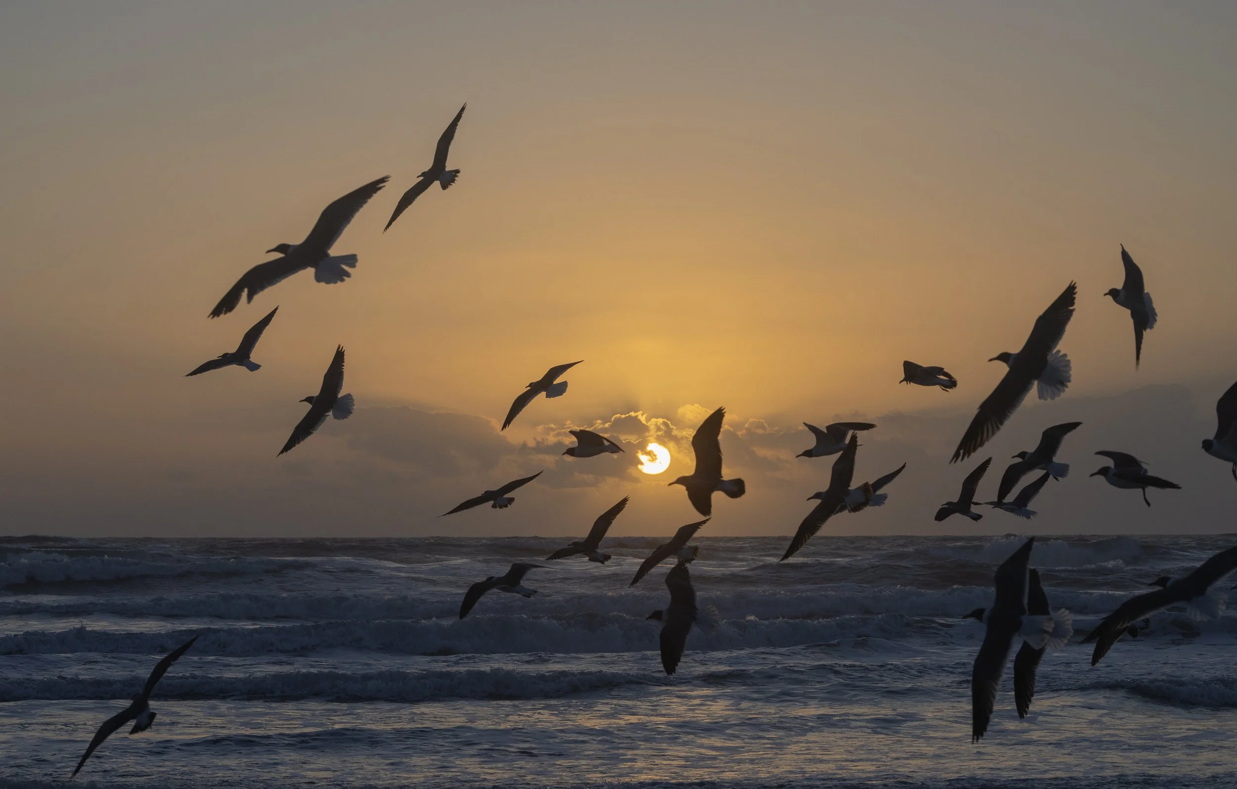 a small flock darting off and back, adding to the lively energy.