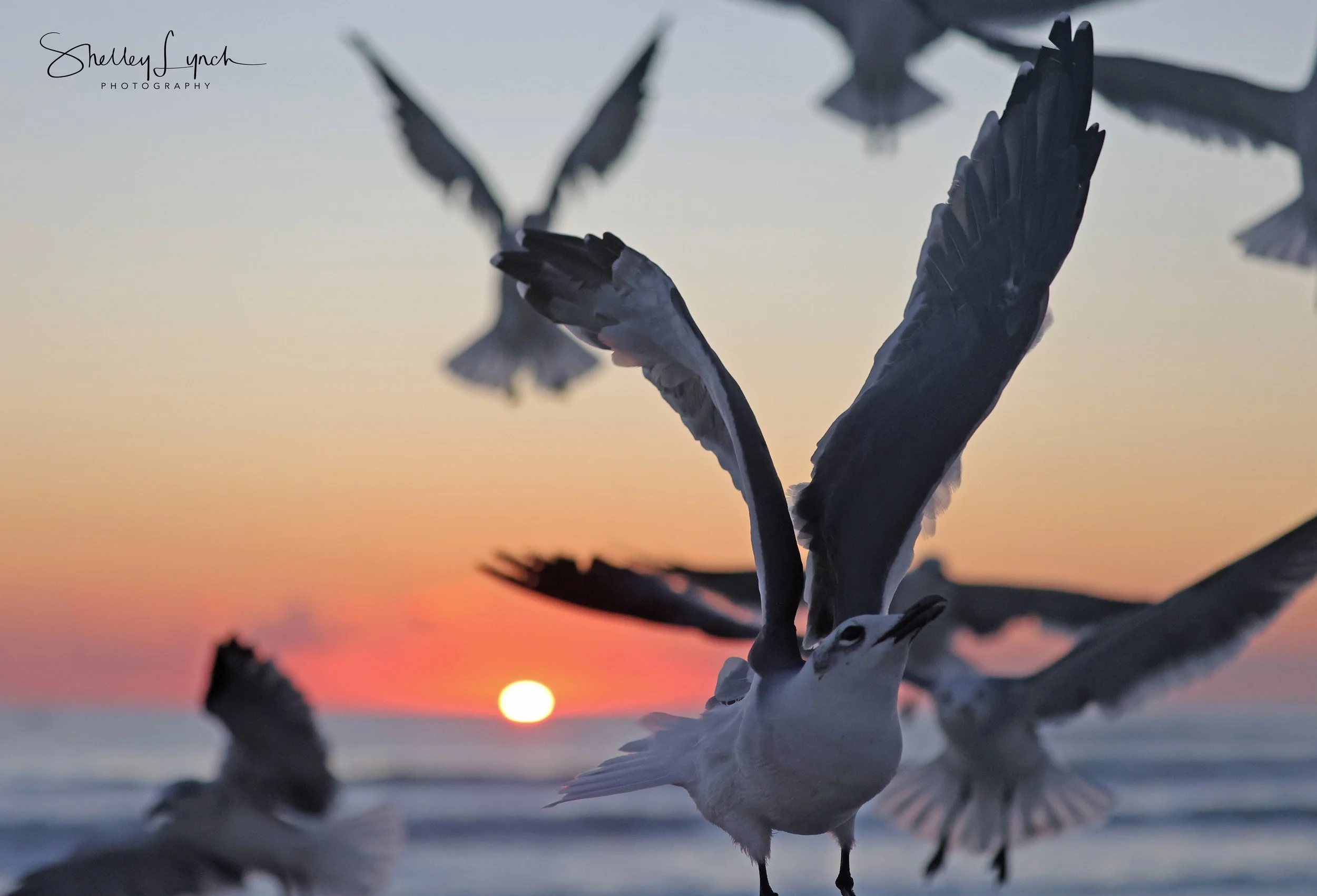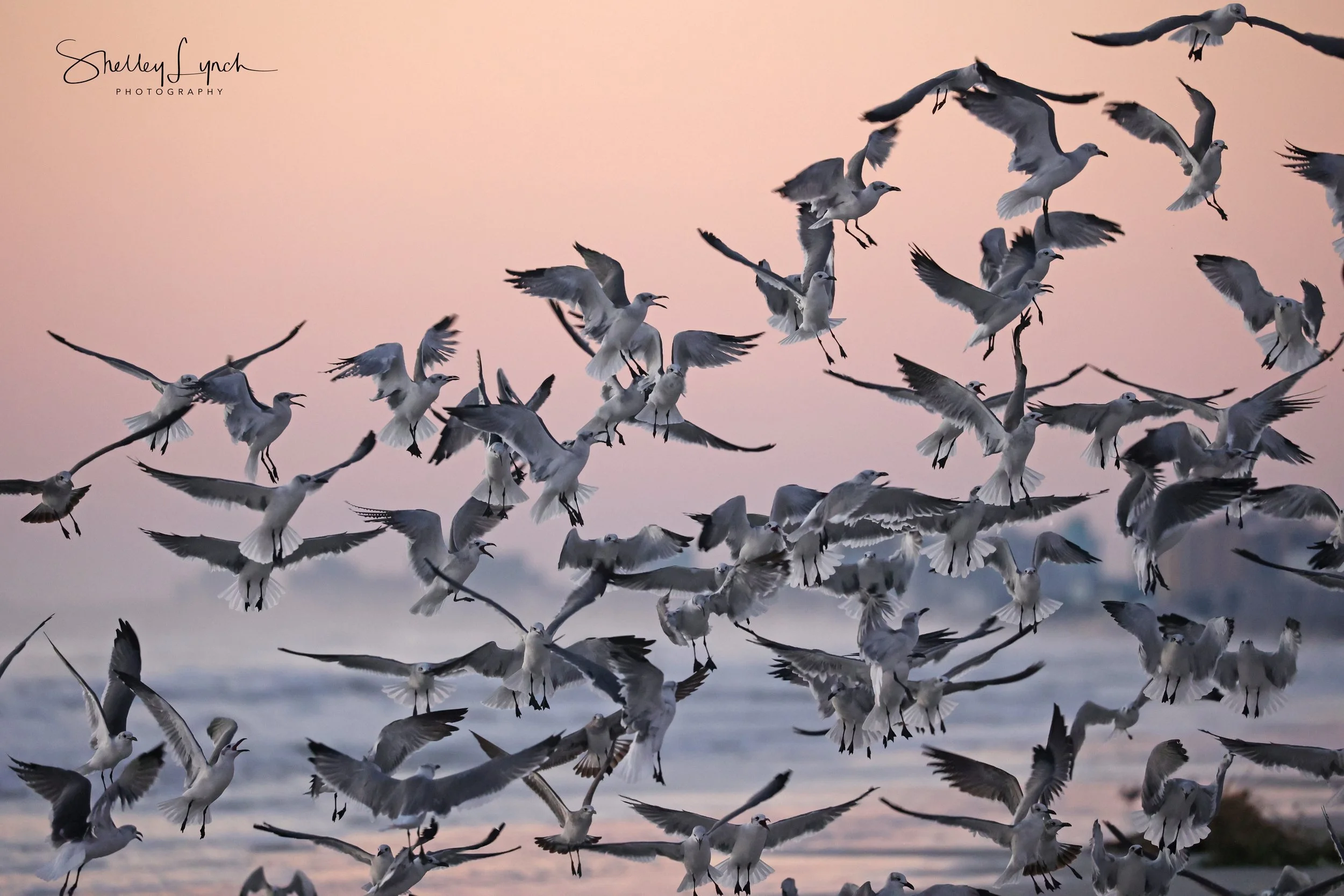 Good Morning! Ahhhh, a fall kind of sunrise with a cool breeze and a deep pink and orange color show. The flock of laughing gulls were so loud flying in a regular sunriser called the flock “An All Gull Choir.”