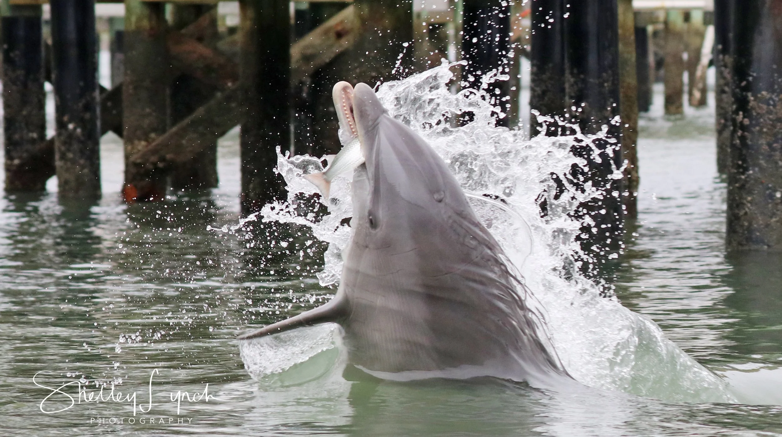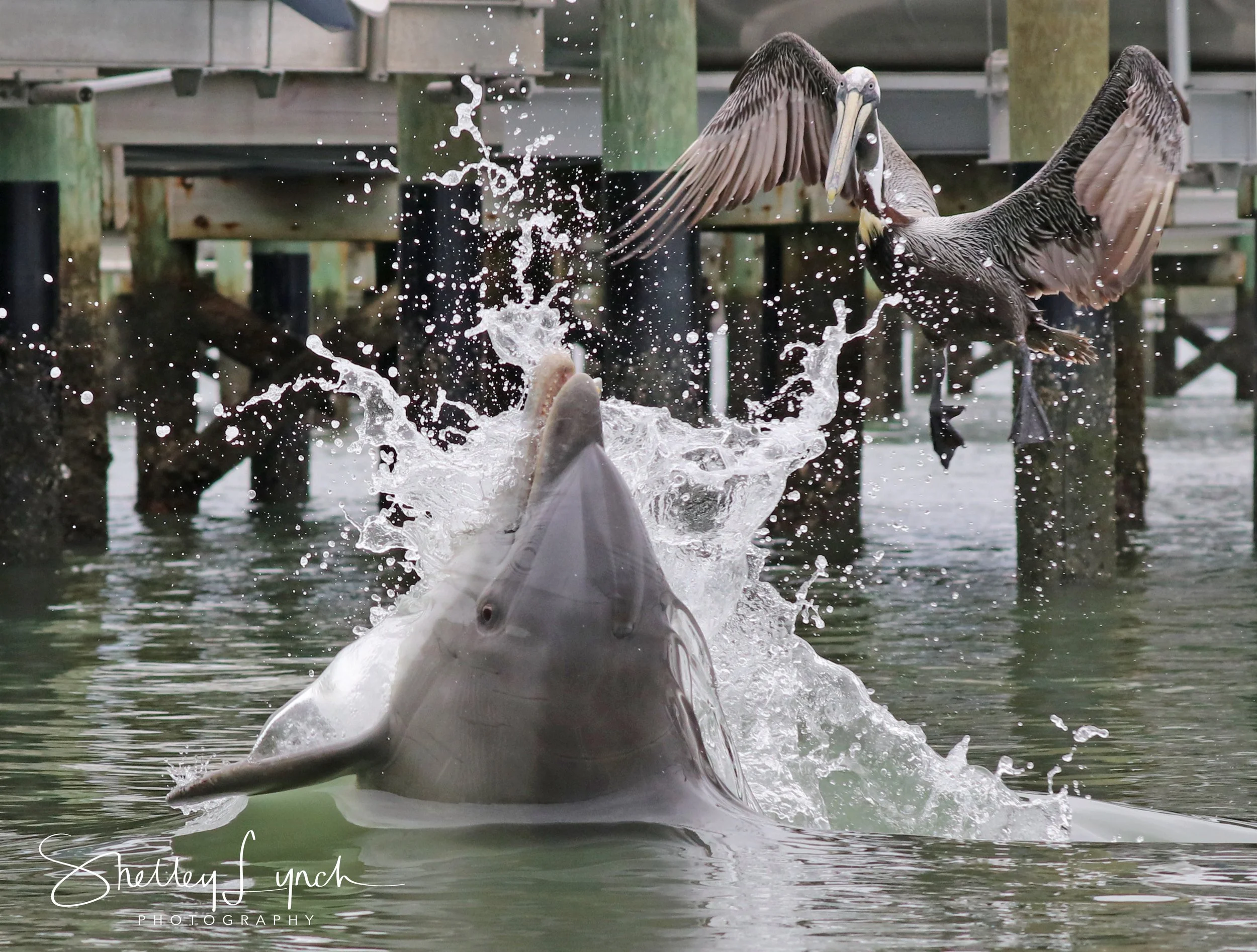 3 dolphins, 2 adults and a youngin' briefly came into the lagoon after sunrise. One of the adults grabbed a few fish with a pelican while the momma nursed the baby.