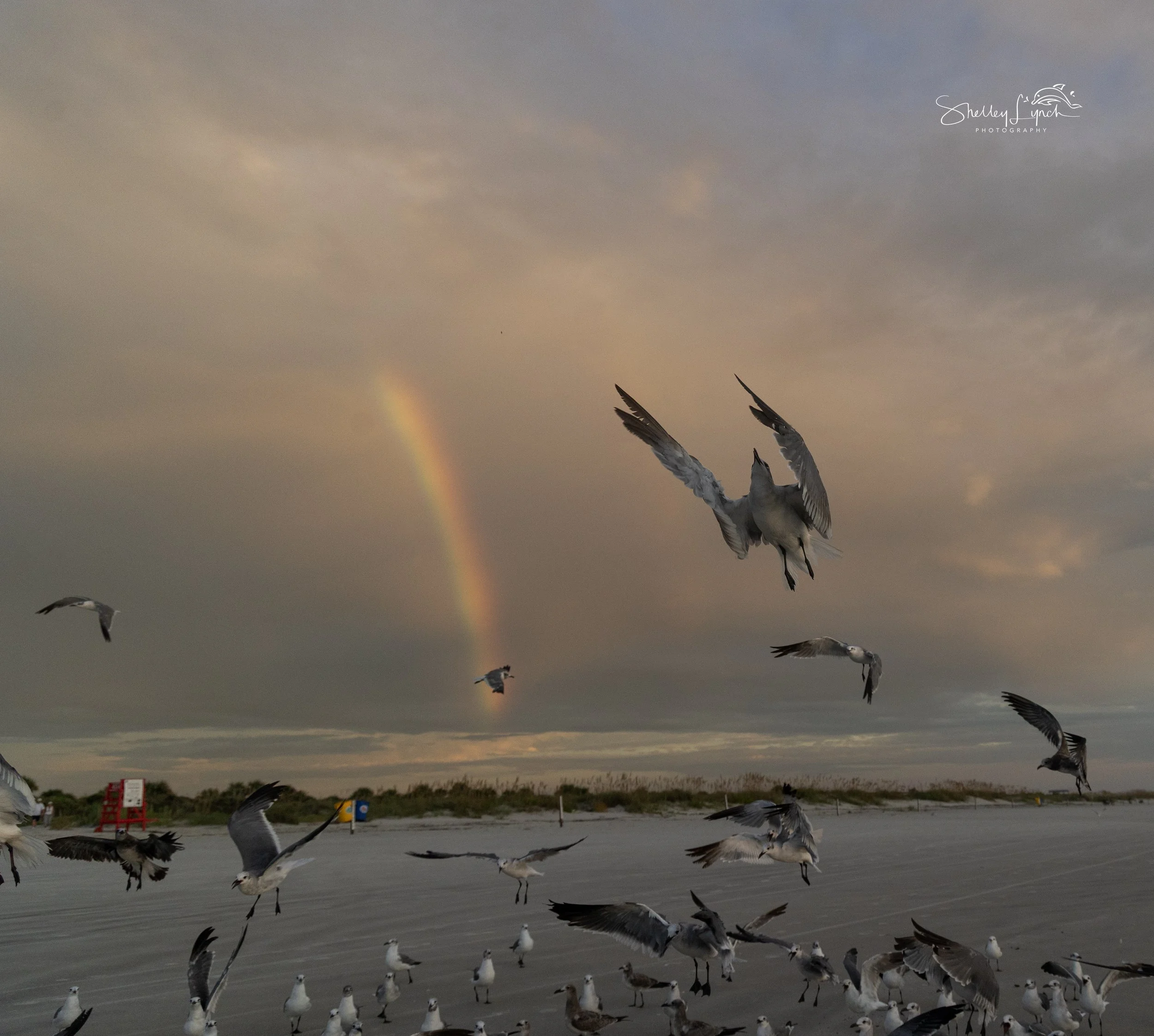 Thanks to a passing bike rider, the flock lifted into the sky, circling around the rainbow and sun with wings and hearts wide open. One gull near the rainbow said, “Keep your wings and heart open to receive all the colors and magic life has to offer.”