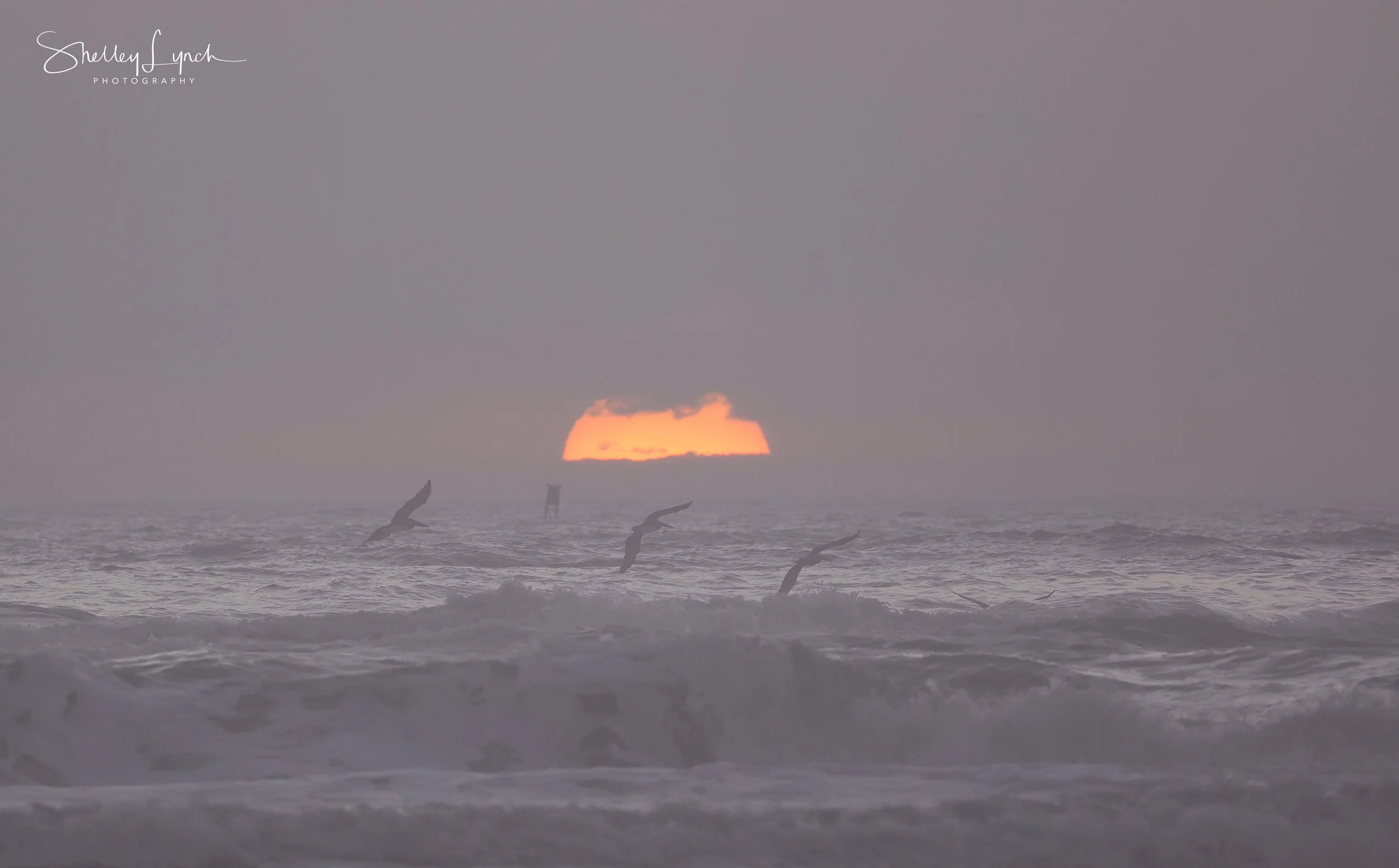 With no breeze and warm temperatures, a layer of fog enveloped the beach giving us a cozy feeling to start the day. The flock of gulls flew in hot and chatty for our usual bath time.