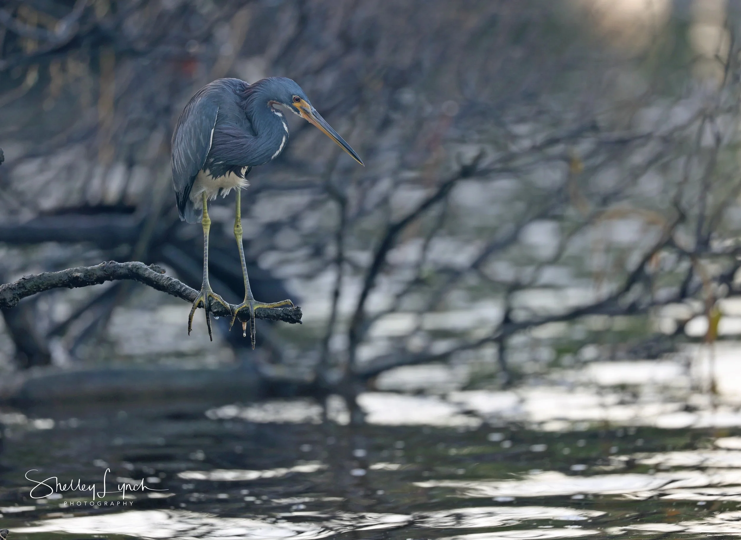 After sunrise I ran into a gorgeous tri-colored heron. He was hanging out on a popular limb for grabbing breakfast. He was barley holding onto the branch bringing us the message of finding a solid foundation by letting go.