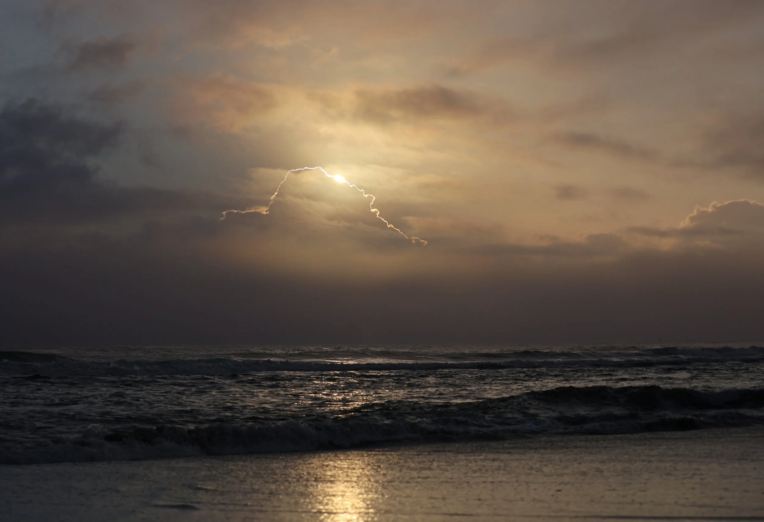 The sun came up from behind a cloud on the horizon with just a golden lining around the cloud at first. As it continued to rise, the light instantly changed to mood to one of hope for a new day. The sun brings the message of letting your light to burn through the fog.
