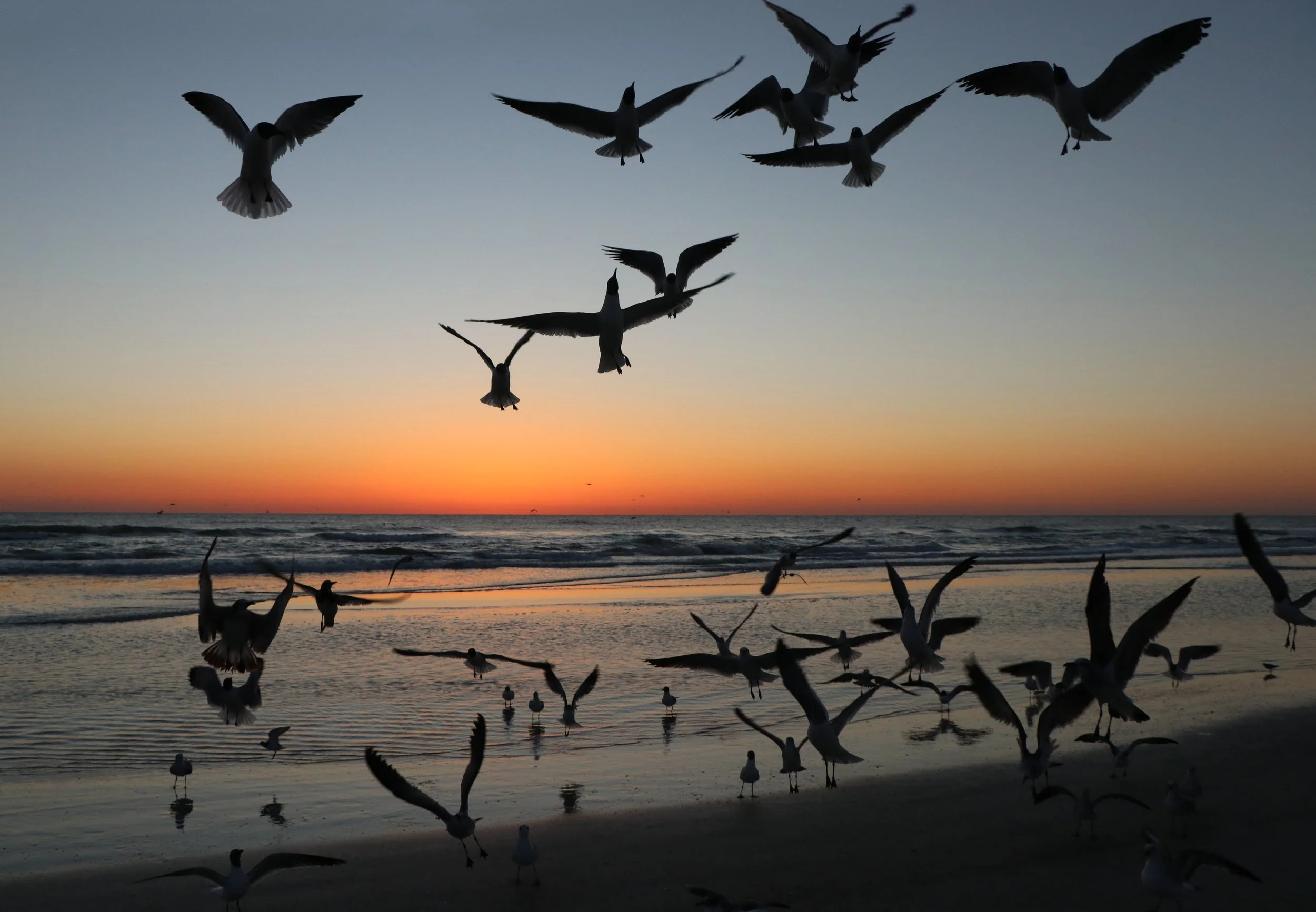 With a brisk wind and clear sky, the sun came up unencumbered bringing with with it a vibrant orange and golden glow. The flock of seagulls is growing in size again! They flew in loud and full of personality. Bath time was pure joy as they flapped around tossing droplets of colored water into the air.