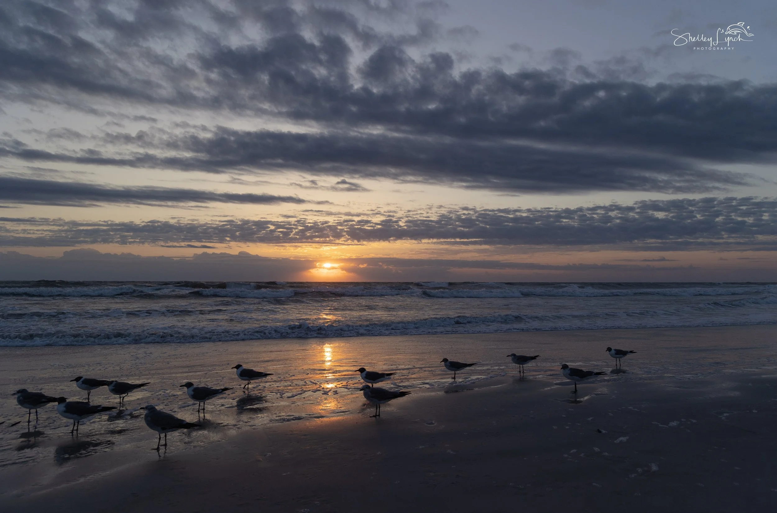 The sunrise was invigorating, with a whipping wind and a churning ocean. Sand danced down the beach, carried by the breeze, creating ever-changing works of art. A chatty flock flew in early, using the wind to hover in place and connect with each other.