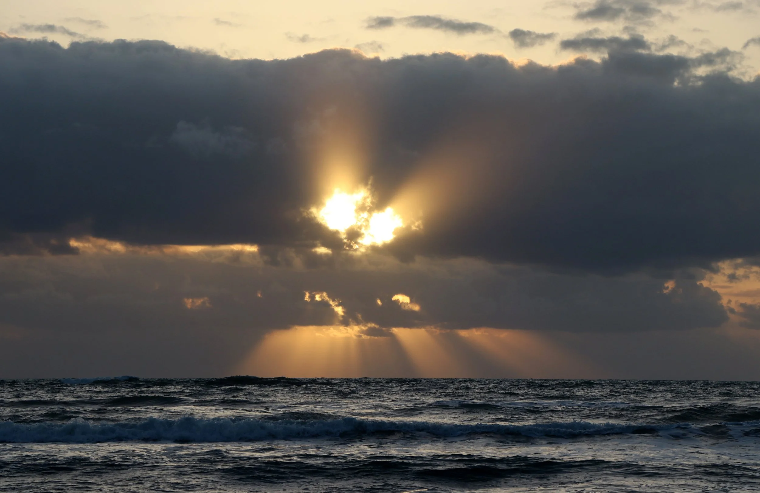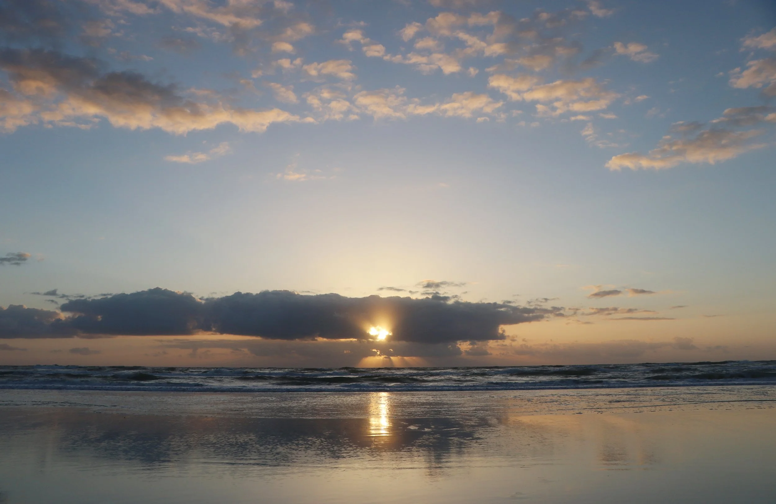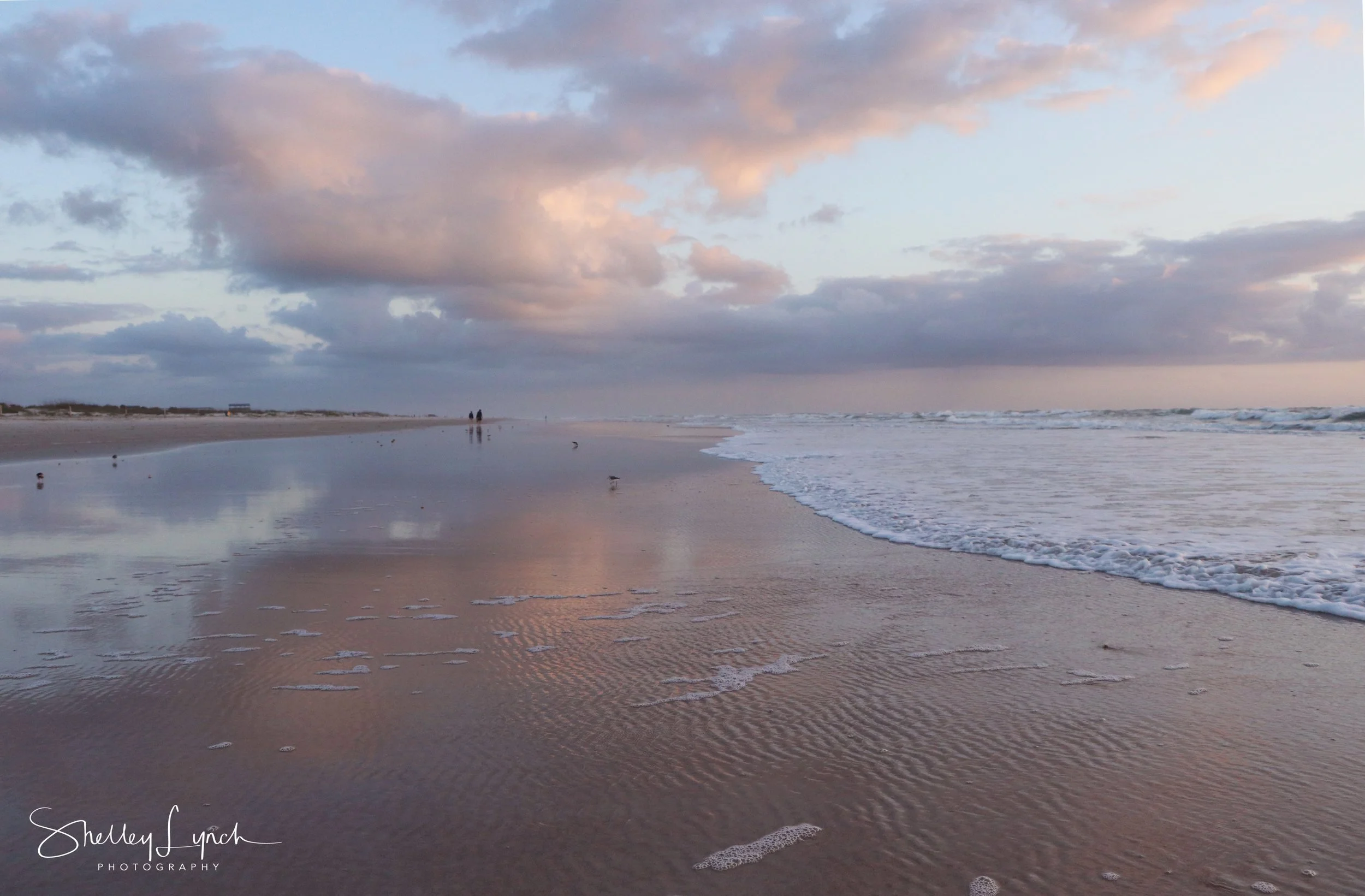 With low tide, the wet sand gave us a mirror image of the sunrise adding to the expansive feeling of the morning. The pre sunrise pink colors were soothing and sweet. It looked like Mother Nature teamed up with Batman using the Bat Ray to stream golden light into the sky giving us a hopeful vibe.