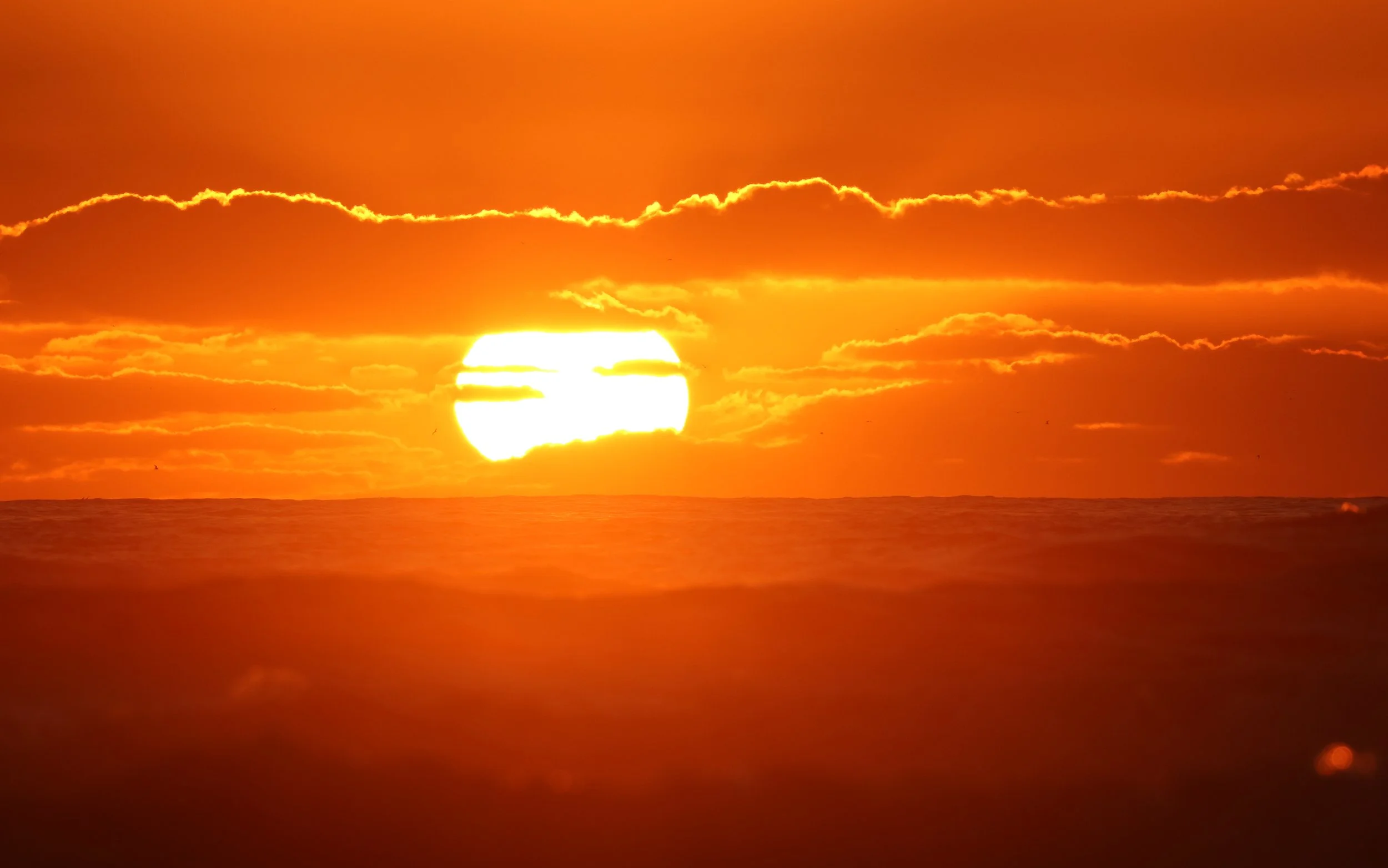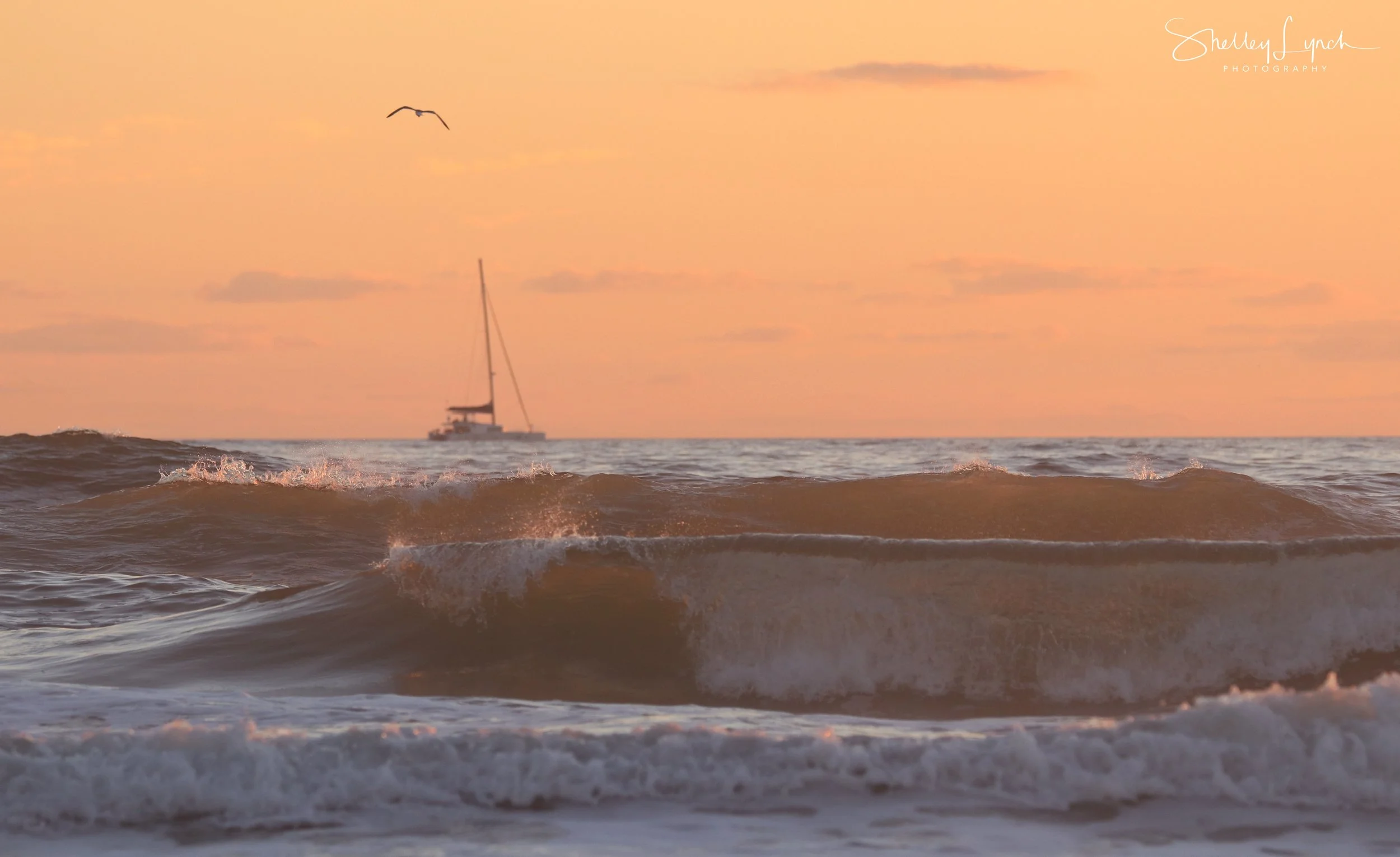 It was a peachy sunrise with a sweet pink and orange color show. As the sun came up, it looked like it was overlooking a mountain range. The warmth and light filled the air, accenting the fog looming over the shoreline.