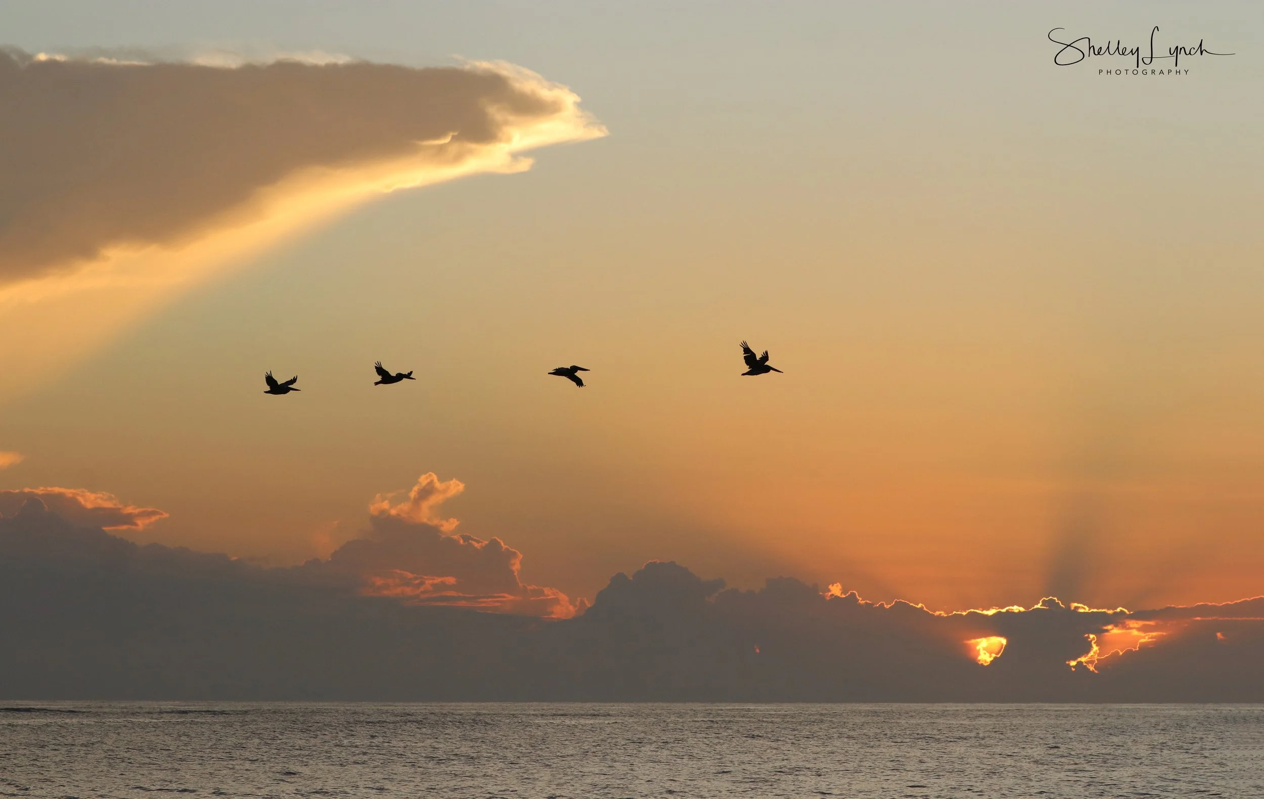 Pelican Highway was flying southbound on the horizon as the sun came up to greet the day. After sunrise 3 egrets and the flock stayed to grab snacks and grab a bath.