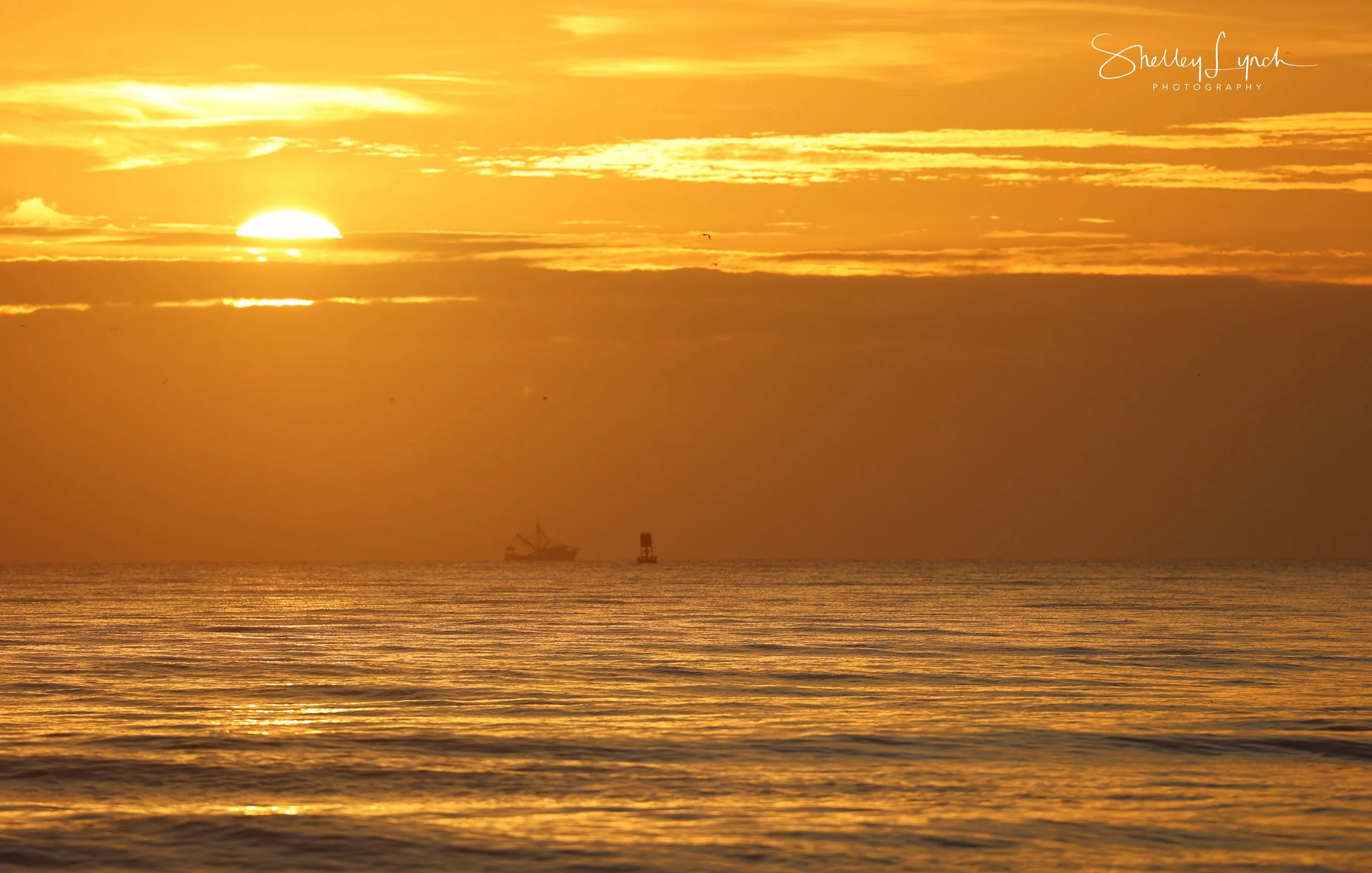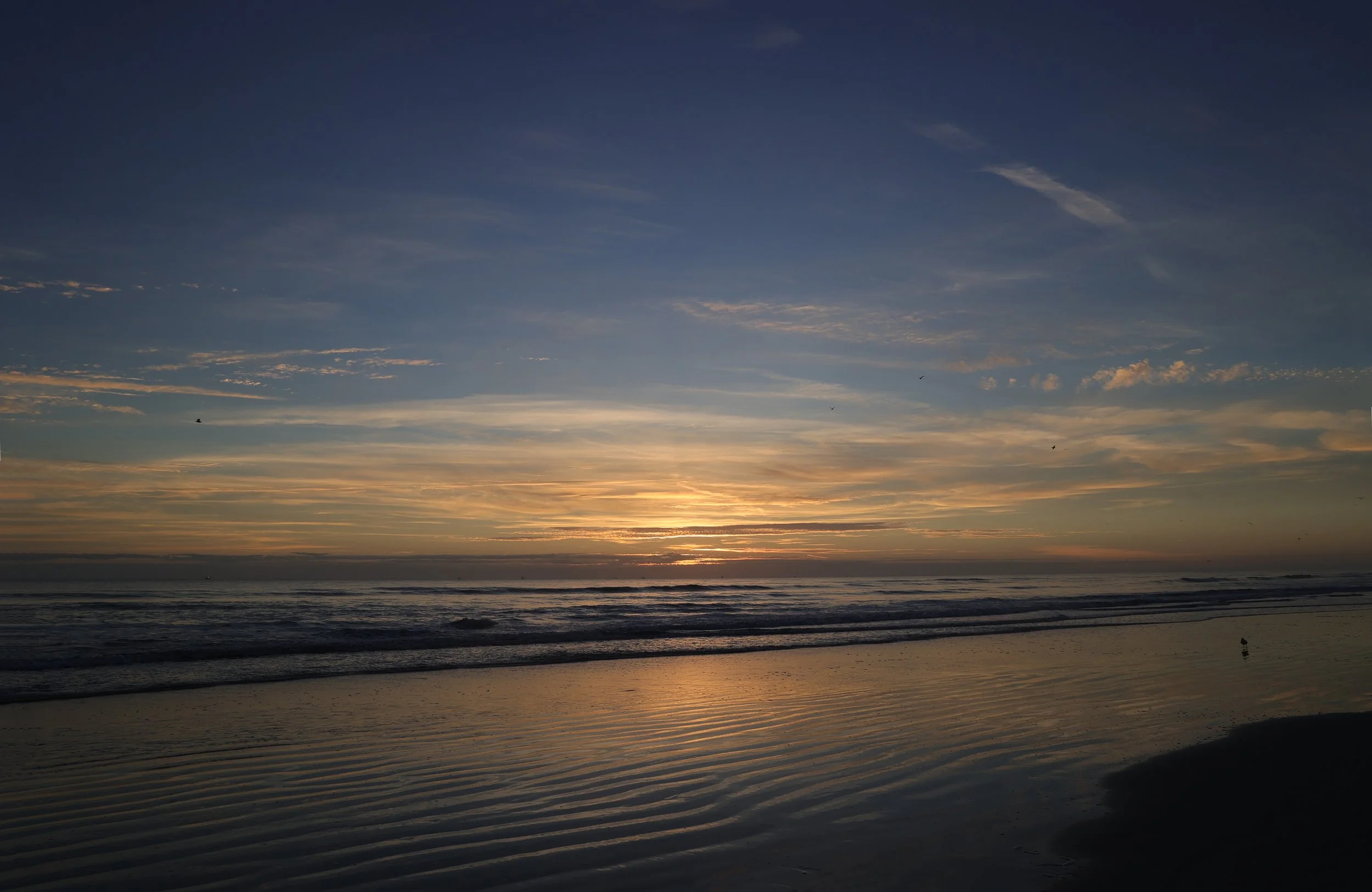 The bright new moon was high in the sky I walked to the beach. Pink swirly clouds filled the sky at first light. The ocean looked more like Lake Atlantic until the sun came up the and the waves began to roll in.