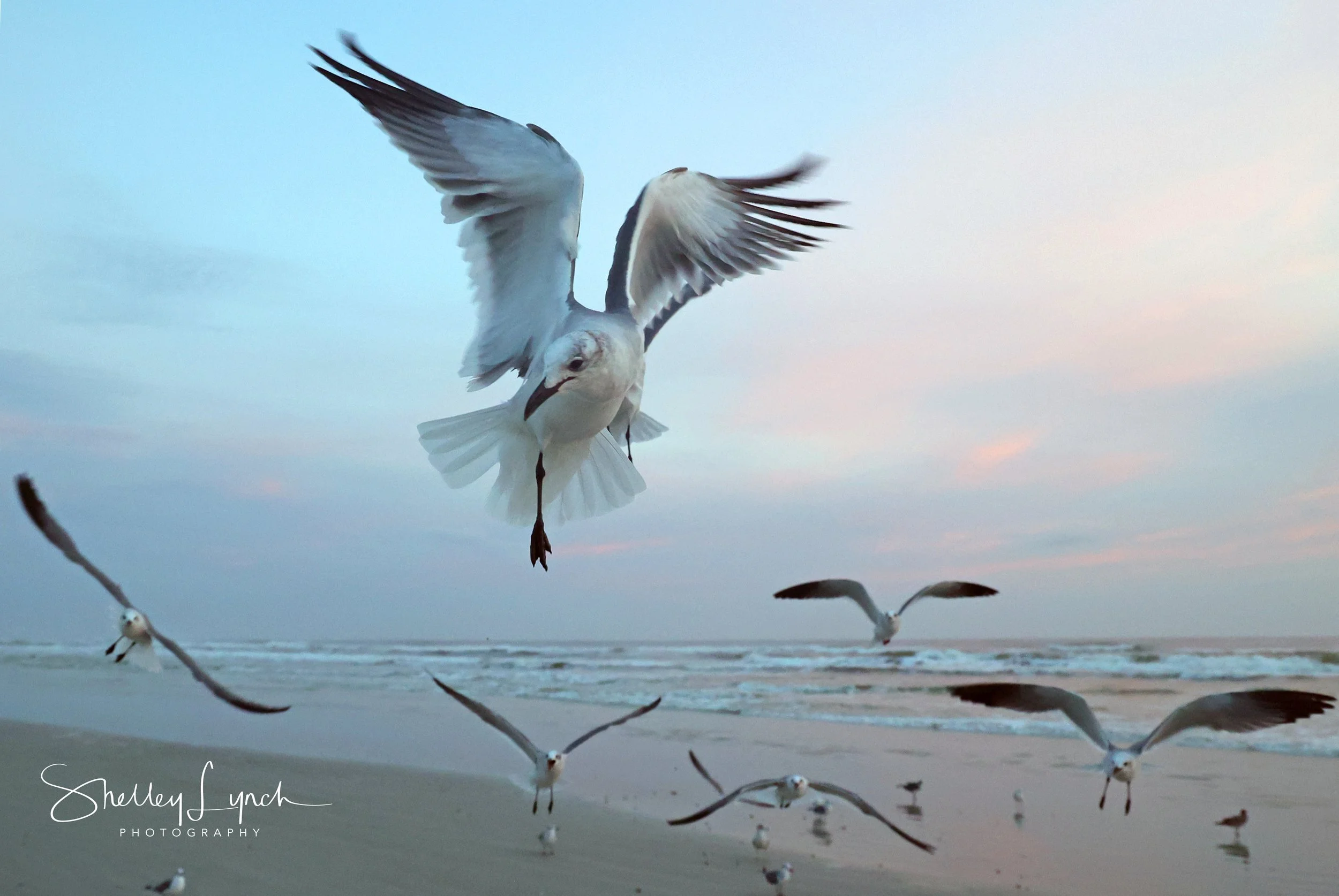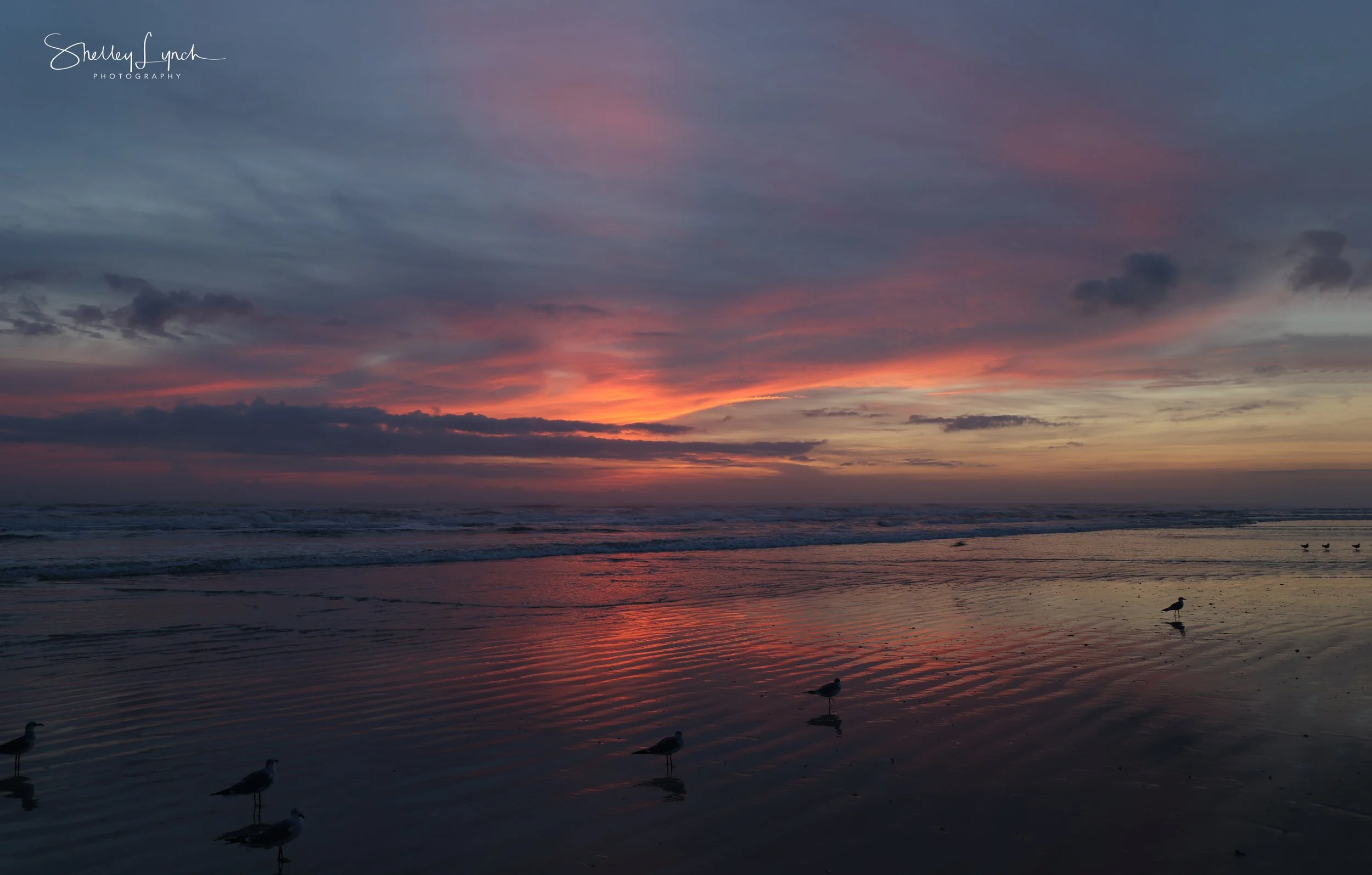 Mother Nature used her swirly paint bush filling the sky with a breathtaking pink and purple color show. The flock of gulls flew in ready for bath time.