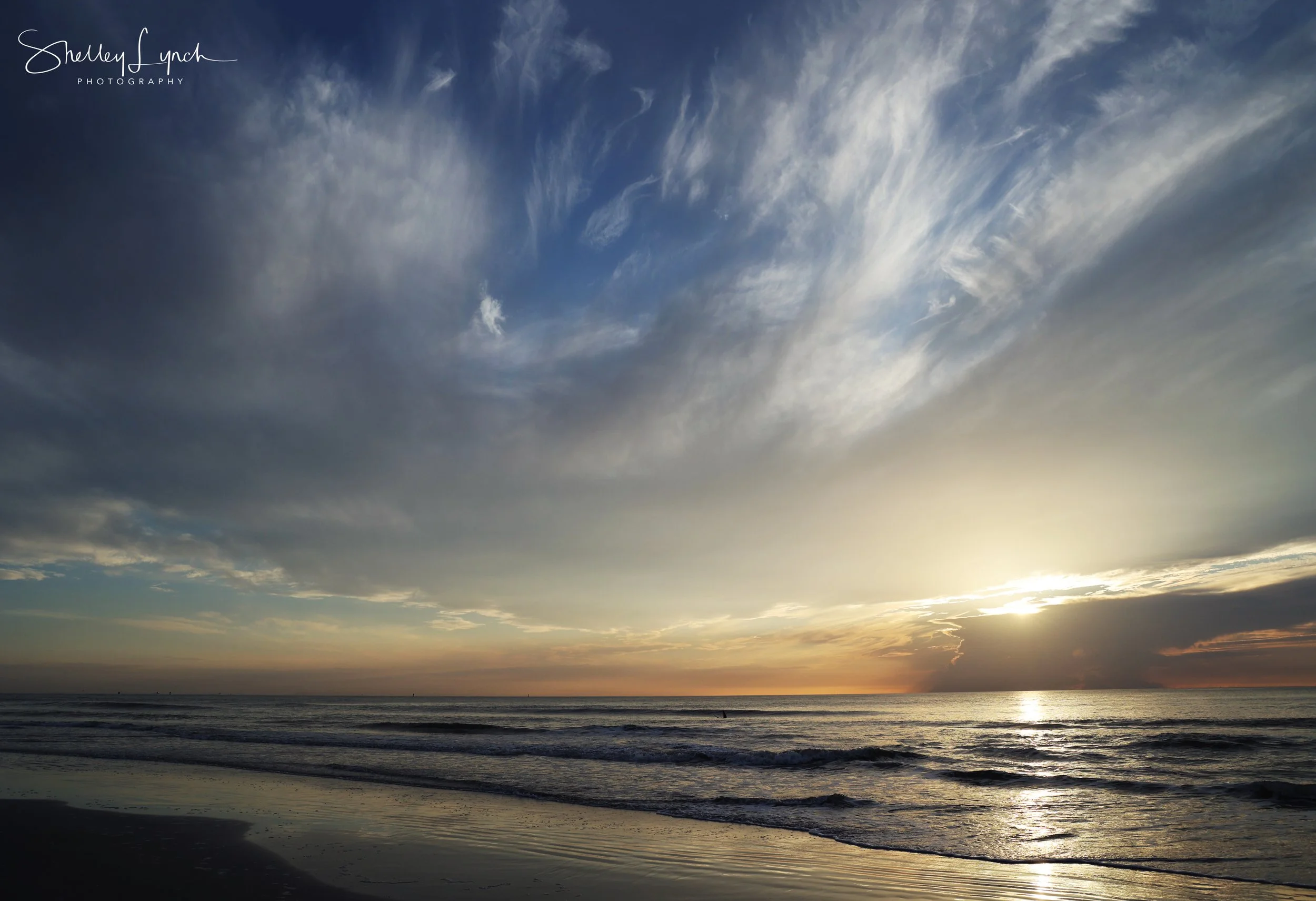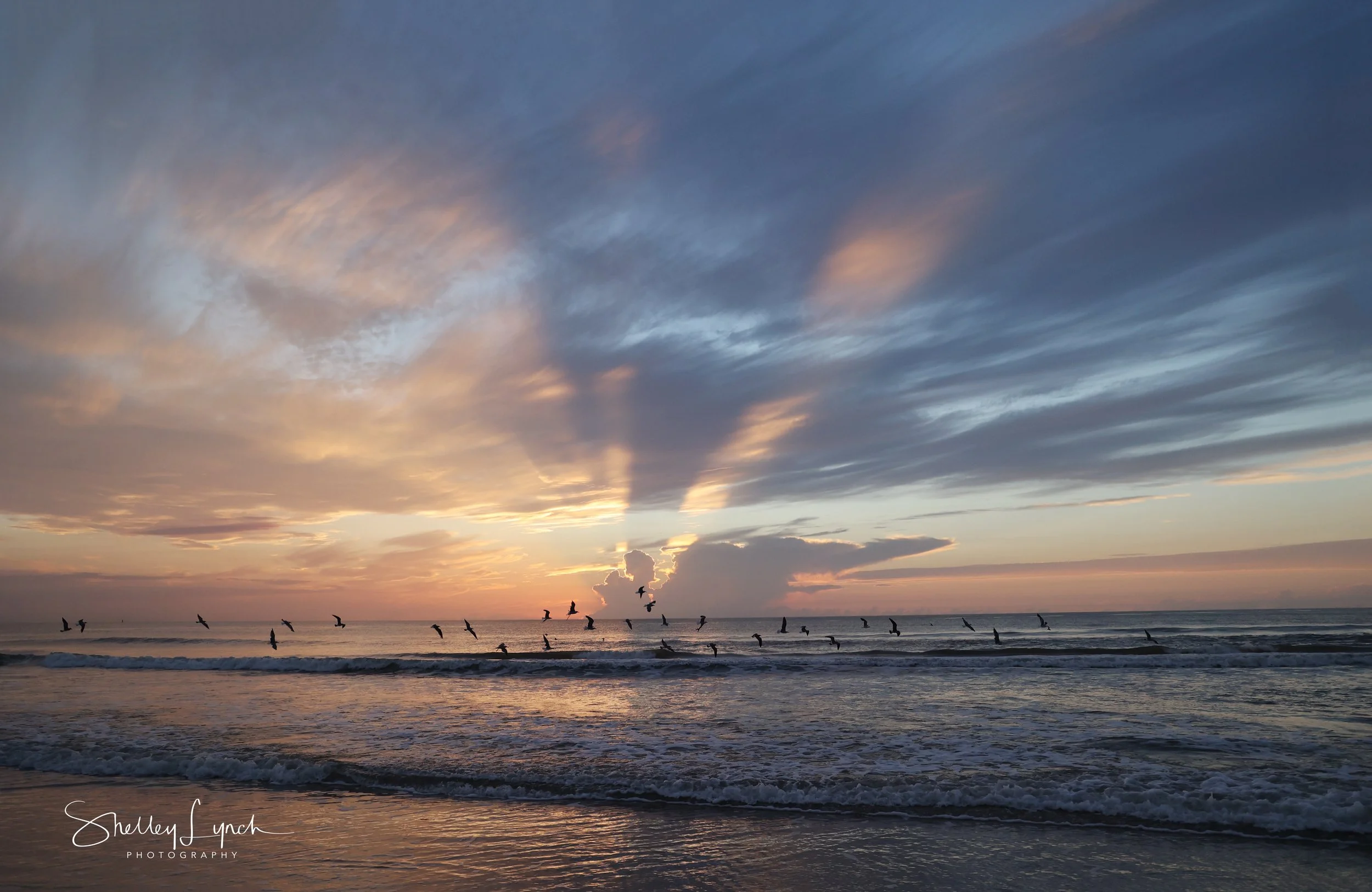 The ocean was calm expect for perfect surfing waves calling out to the surfers and dolphins to come play. The flock of seagulls came in hot and chatty again. They were open winged soaking up the light.