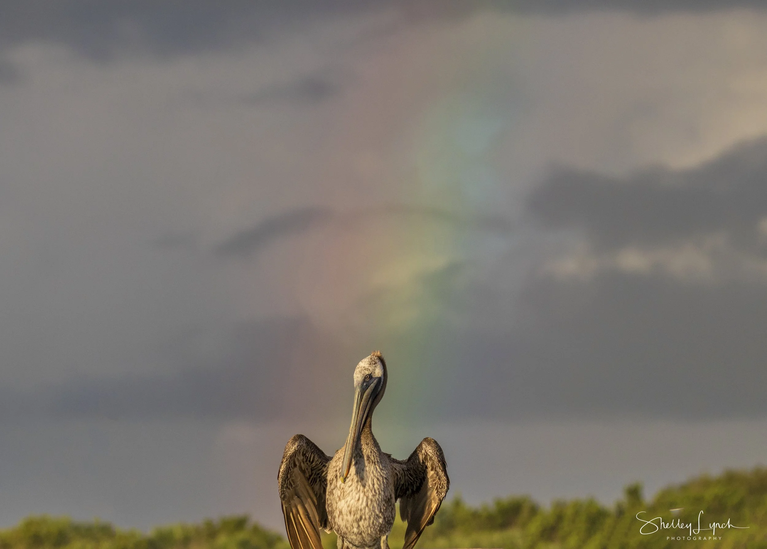 Pelican soaking up the rainbow