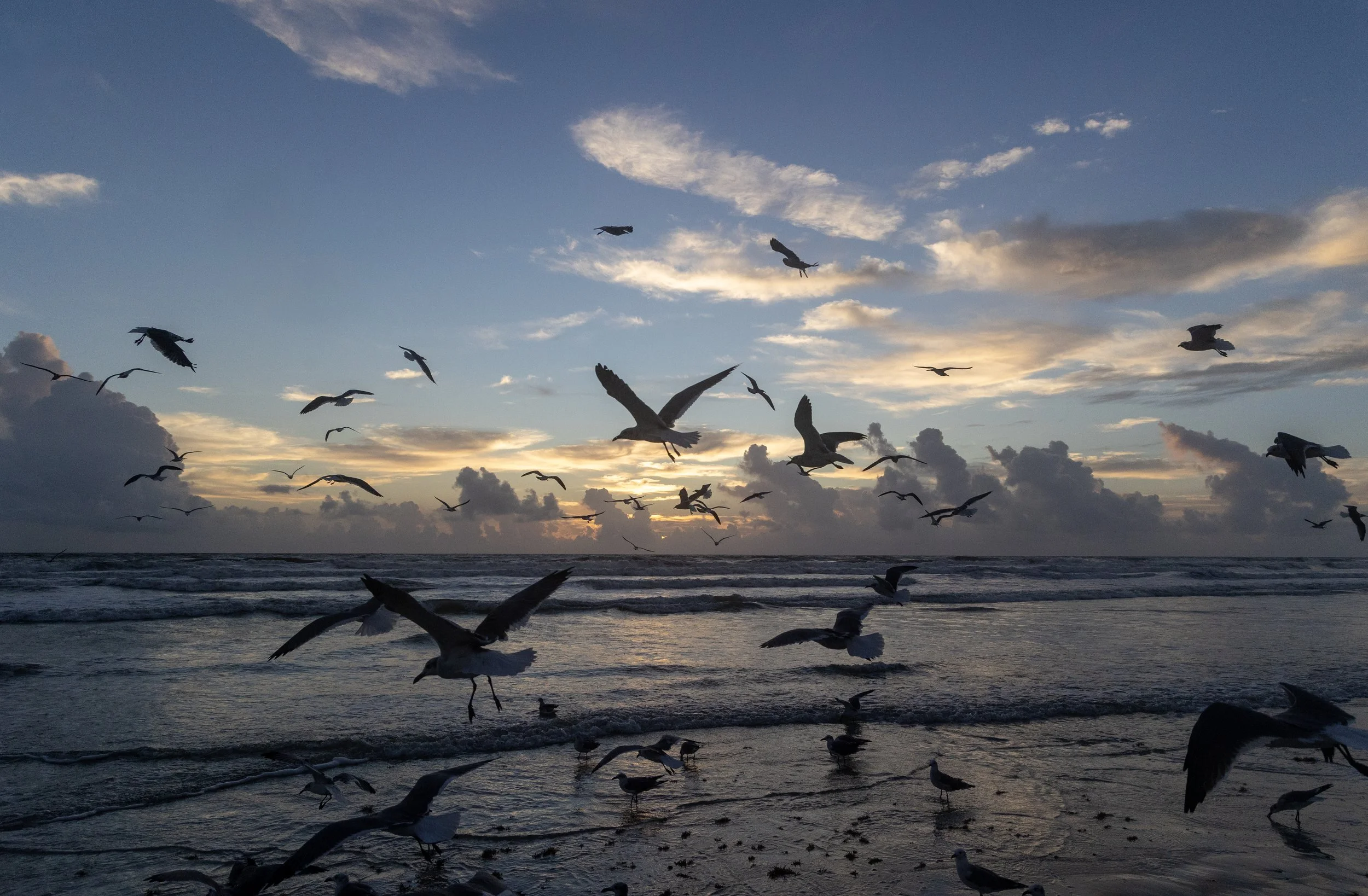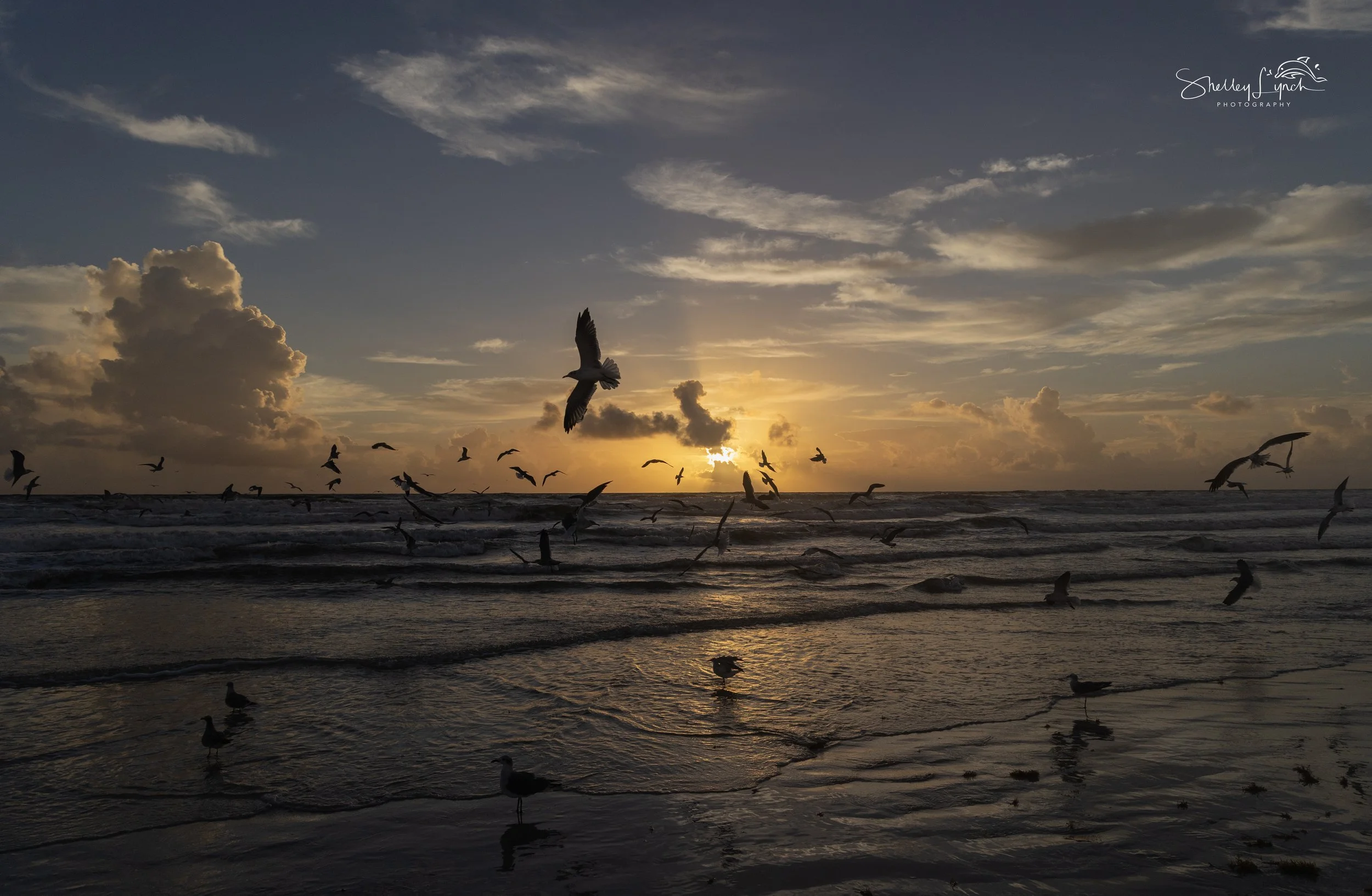 The ocean was churning, sending salty spray into the air, mingling with the scent of seaweed. A flock of gulls flew in just as the horizon turned pink around the fluffy clouds.