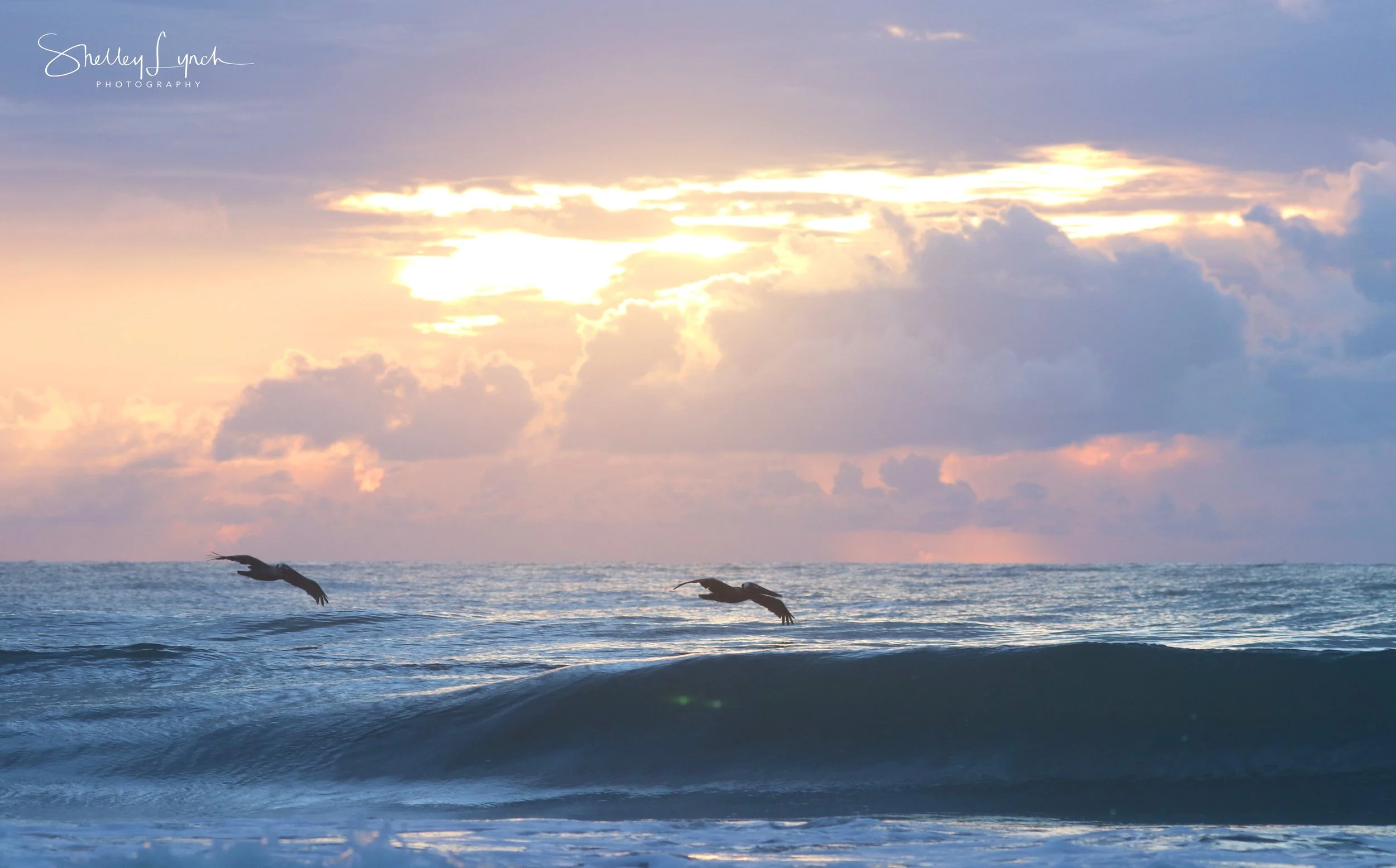 Pelican Highway traffic was flying both south and northbound above the perfectly formed waves. One of the waves looked like it had a pair of green eyes looking out through the water.