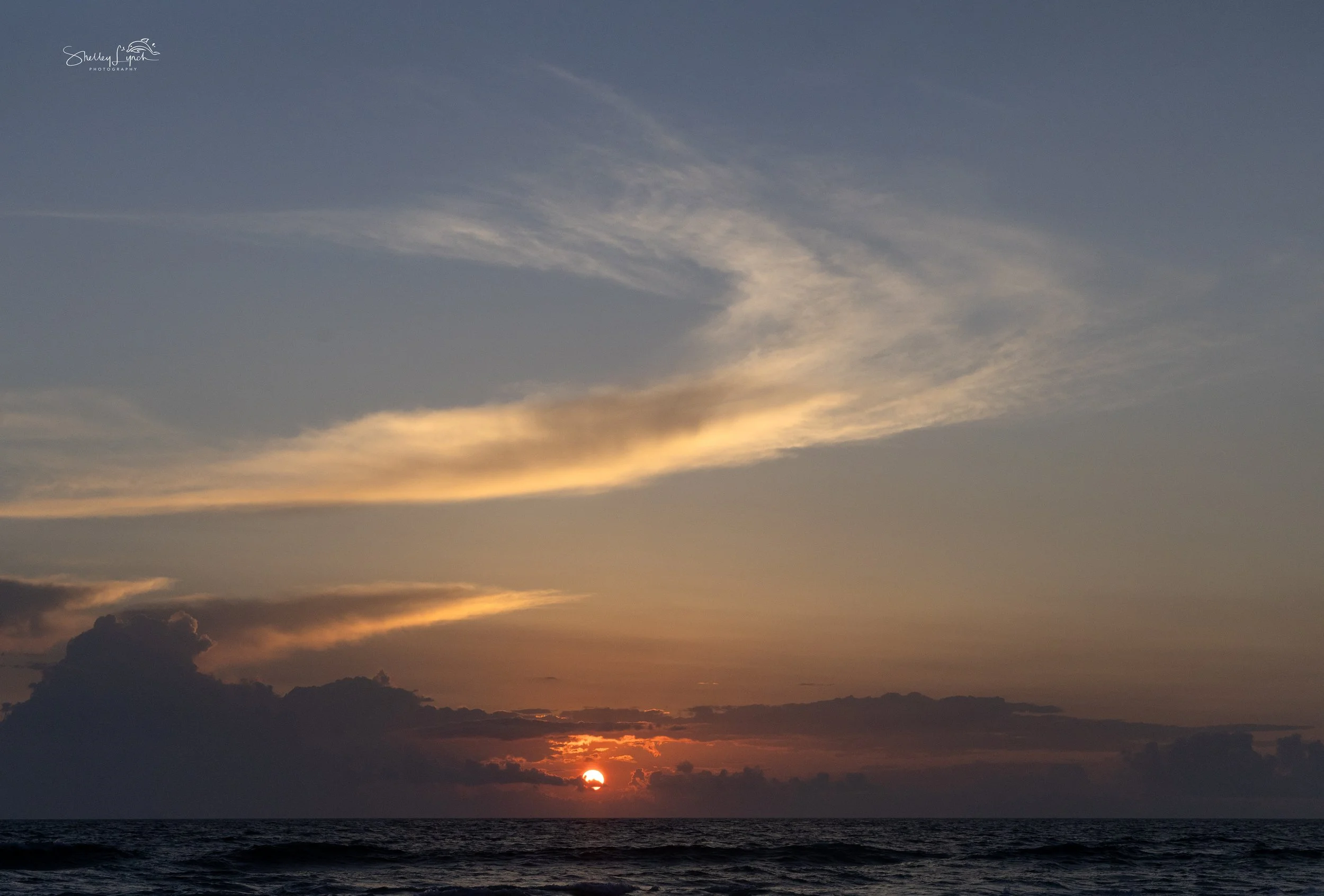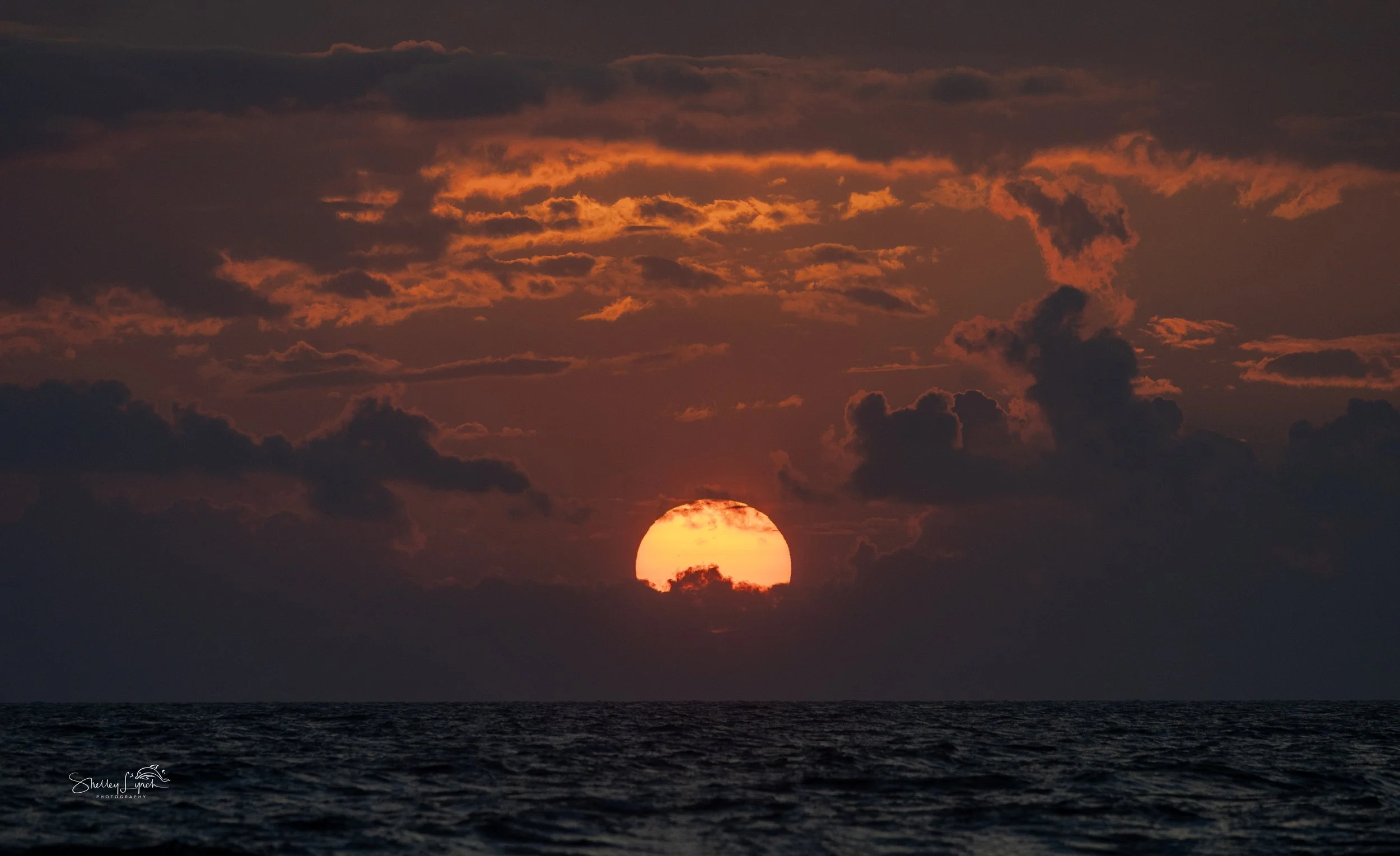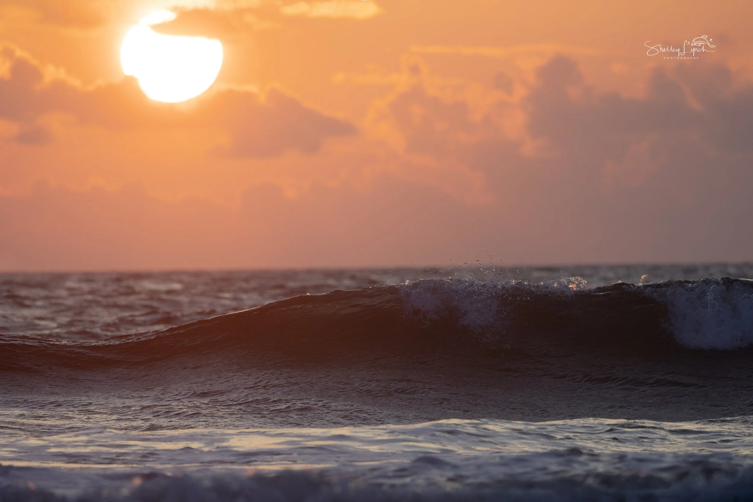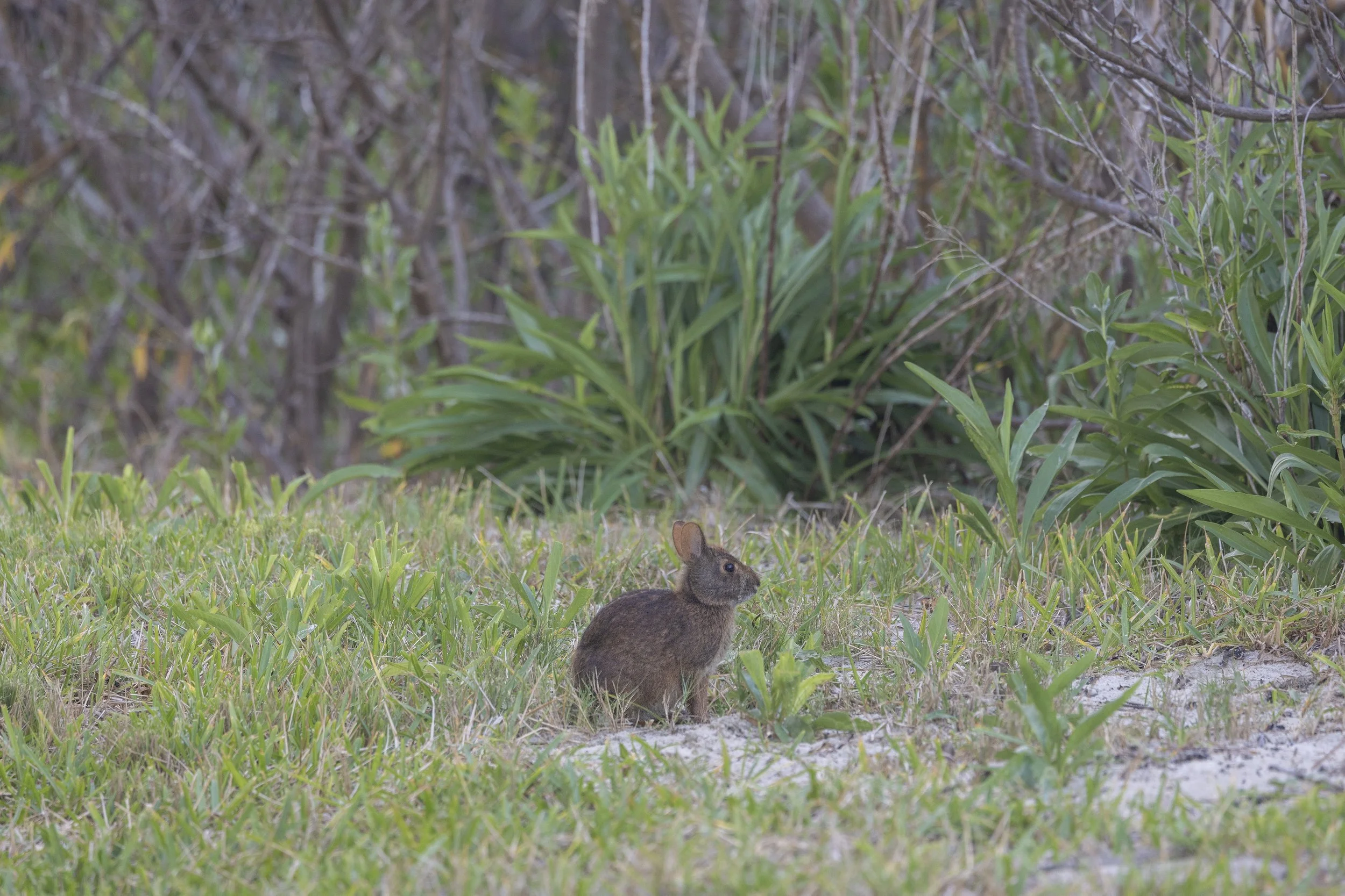 As the sun rose, it filled an opening in the clouds with a deep orange glow. Waves rolled toward shore, soaking up all the colors. After sunrise, a bunny living in the mangroves came out for breakfast.