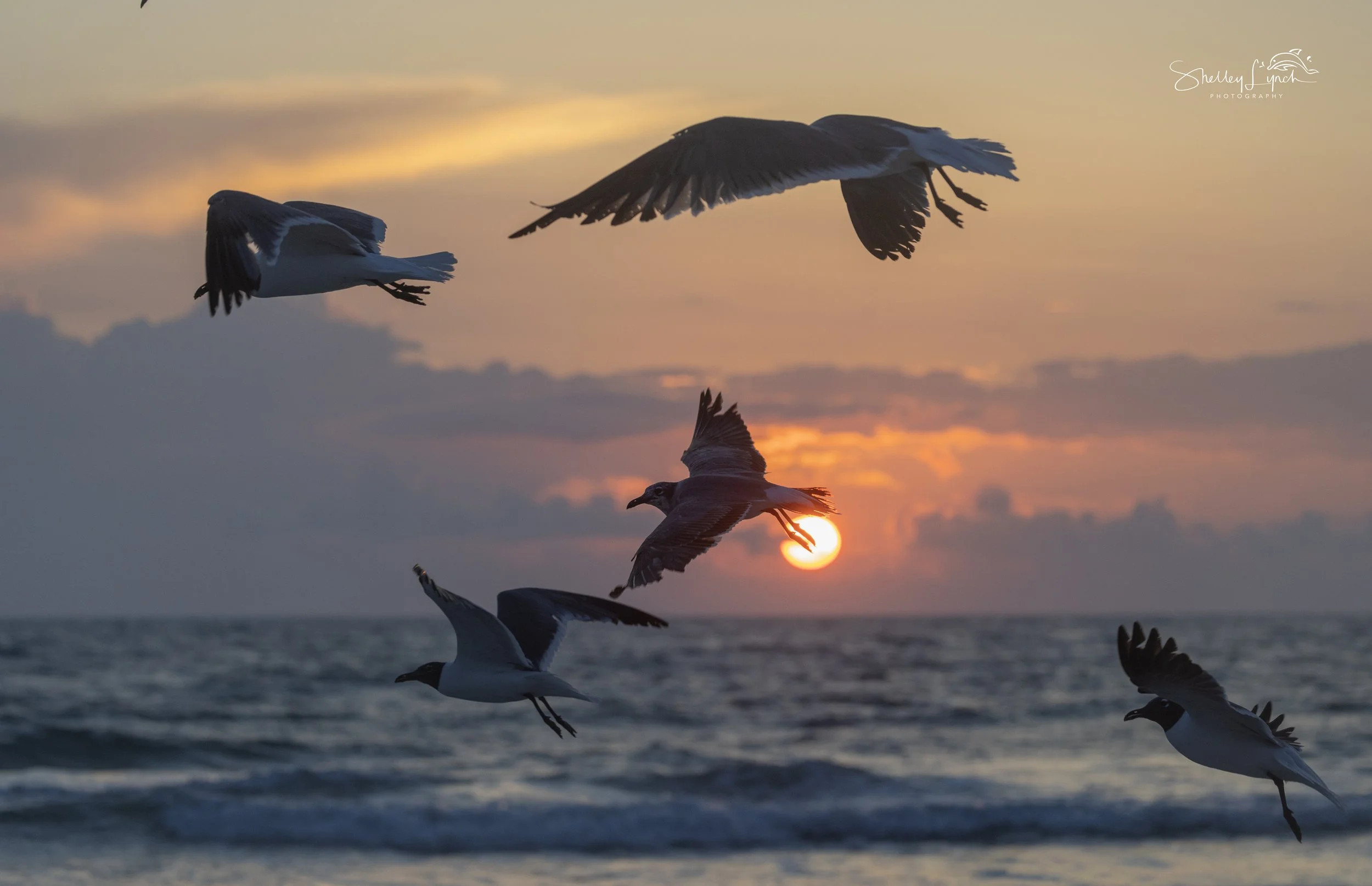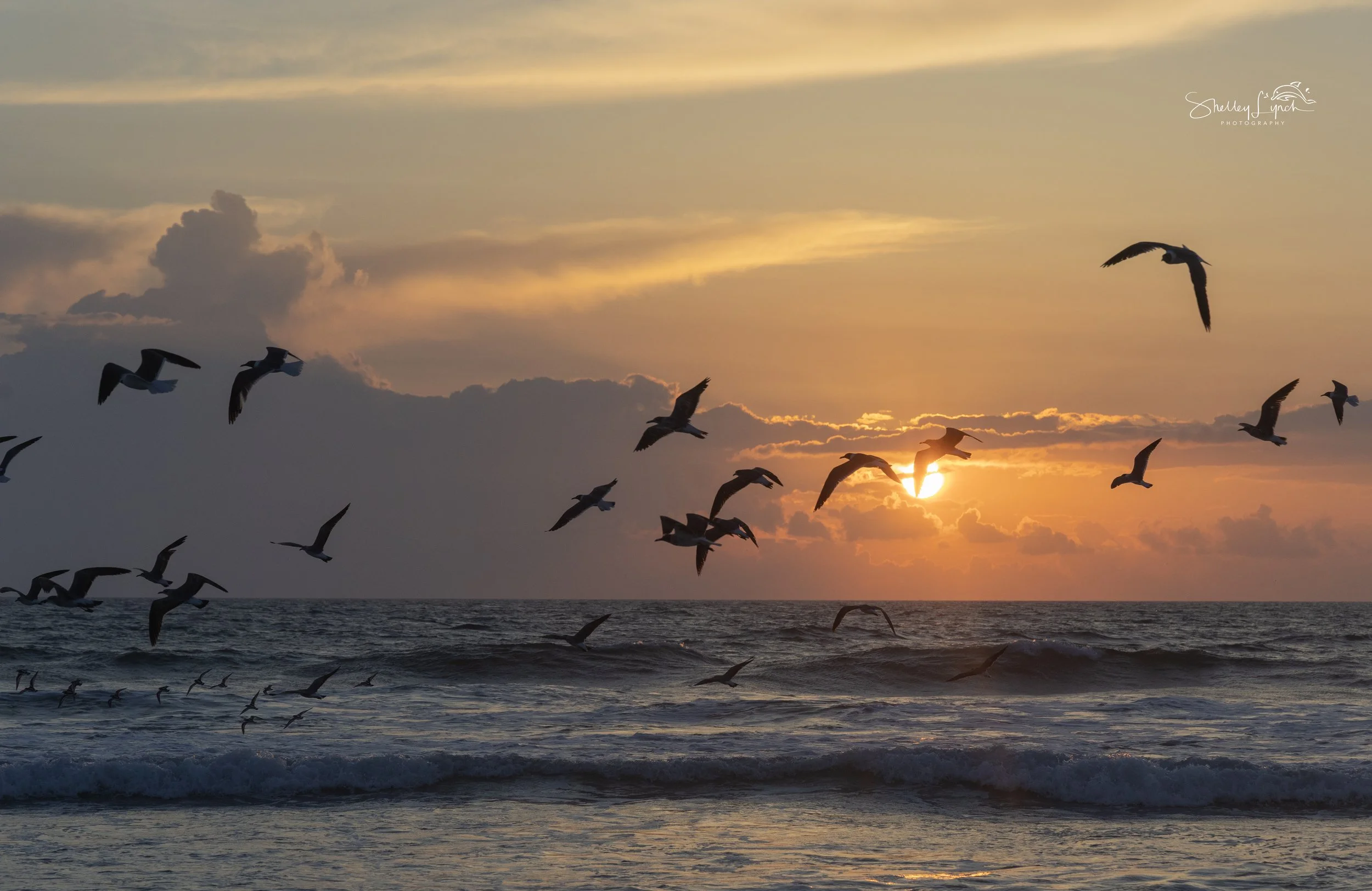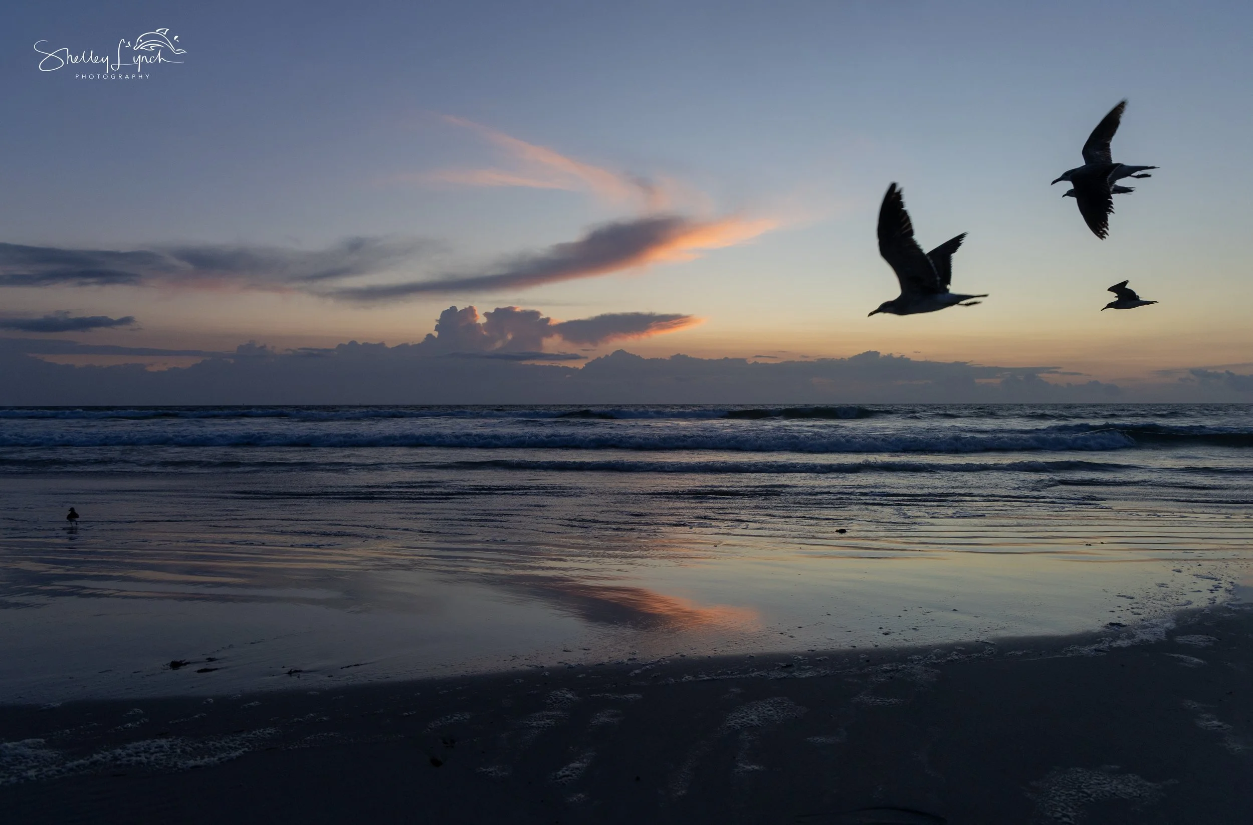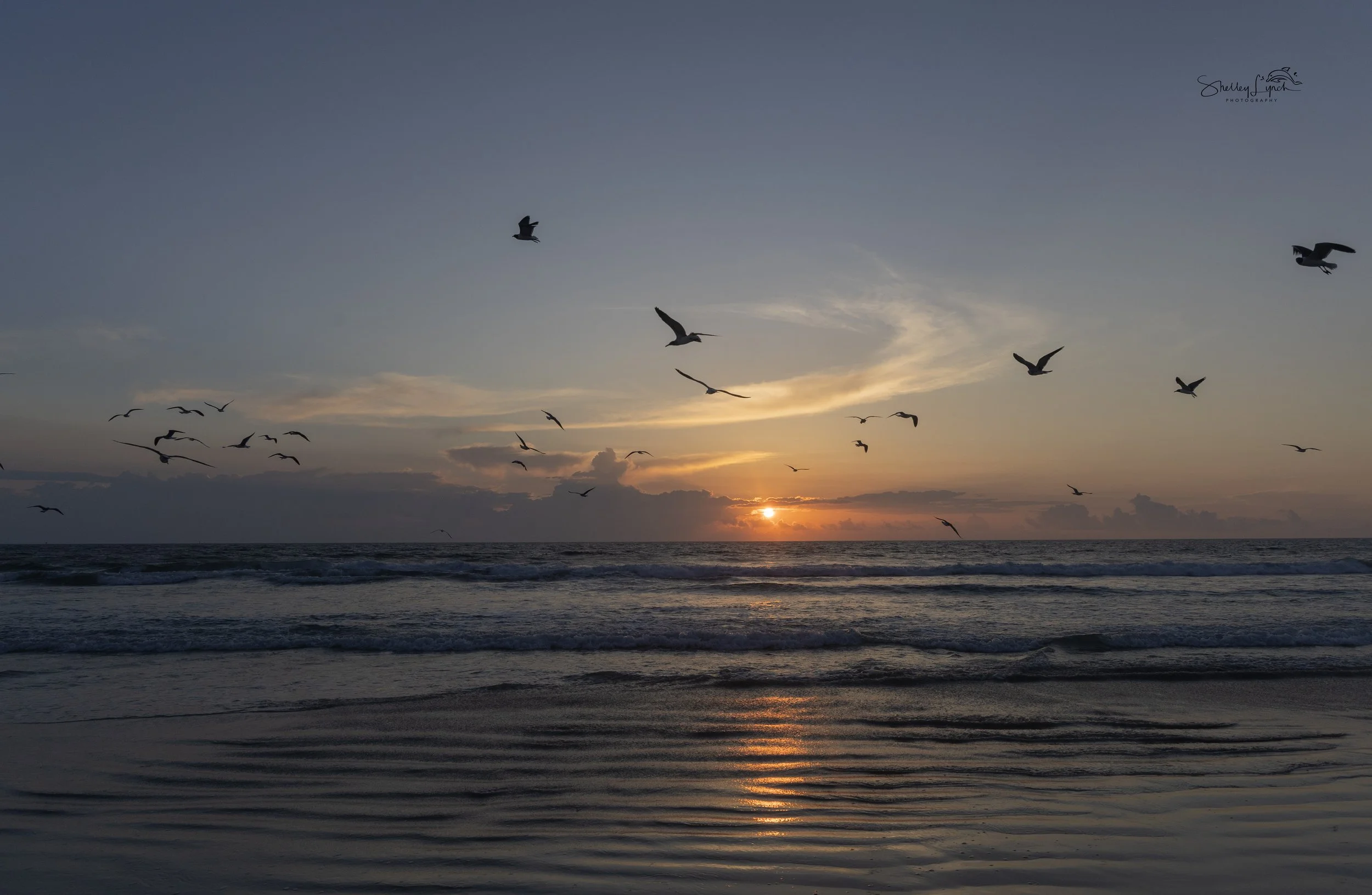 As the sun rose, it filled an opening in the clouds with a deep orange glow. Waves rolled toward shore, soaking up all the colors. After sunrise, a bunny living in the mangroves came out for breakfast.