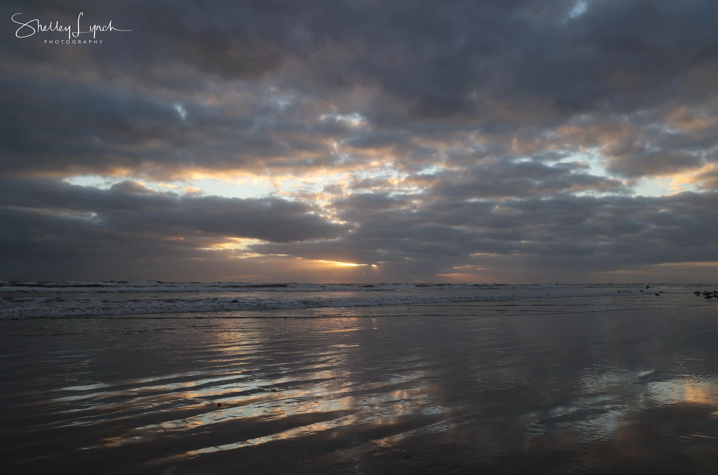 The reflection on the wet sand added to the beauty of the sunrise masterpiece. The flock of gulls flew in for bath time and seemed happy the wind was a bit less.
