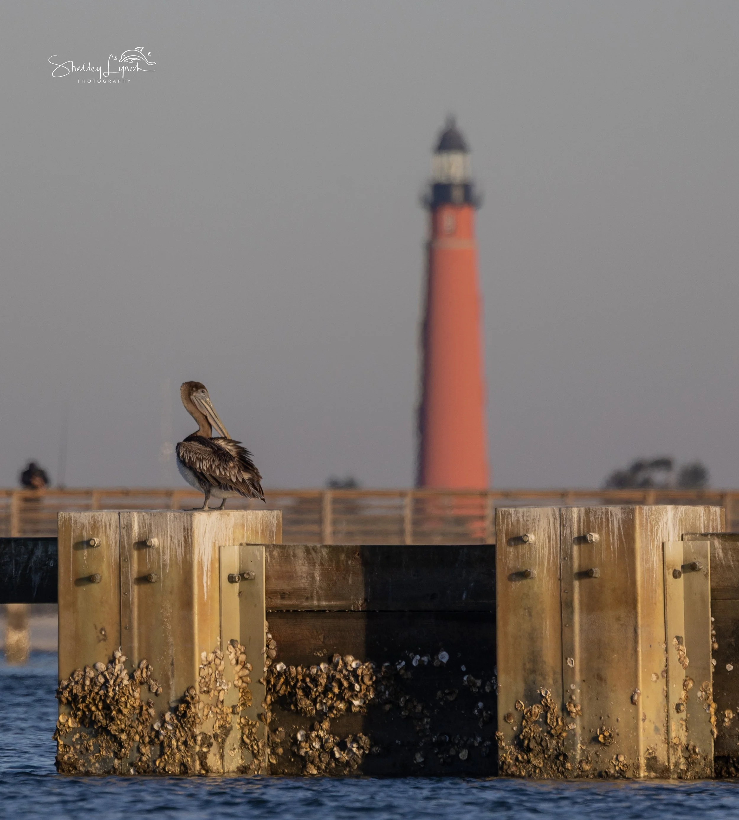 After sunrise, a couple of dolphins cruised through the lagoon, grabbing breakfast alongside a flock of pelicans. Nearby, a solo pelican paused to preen, the lighthouse standing tall in the background.