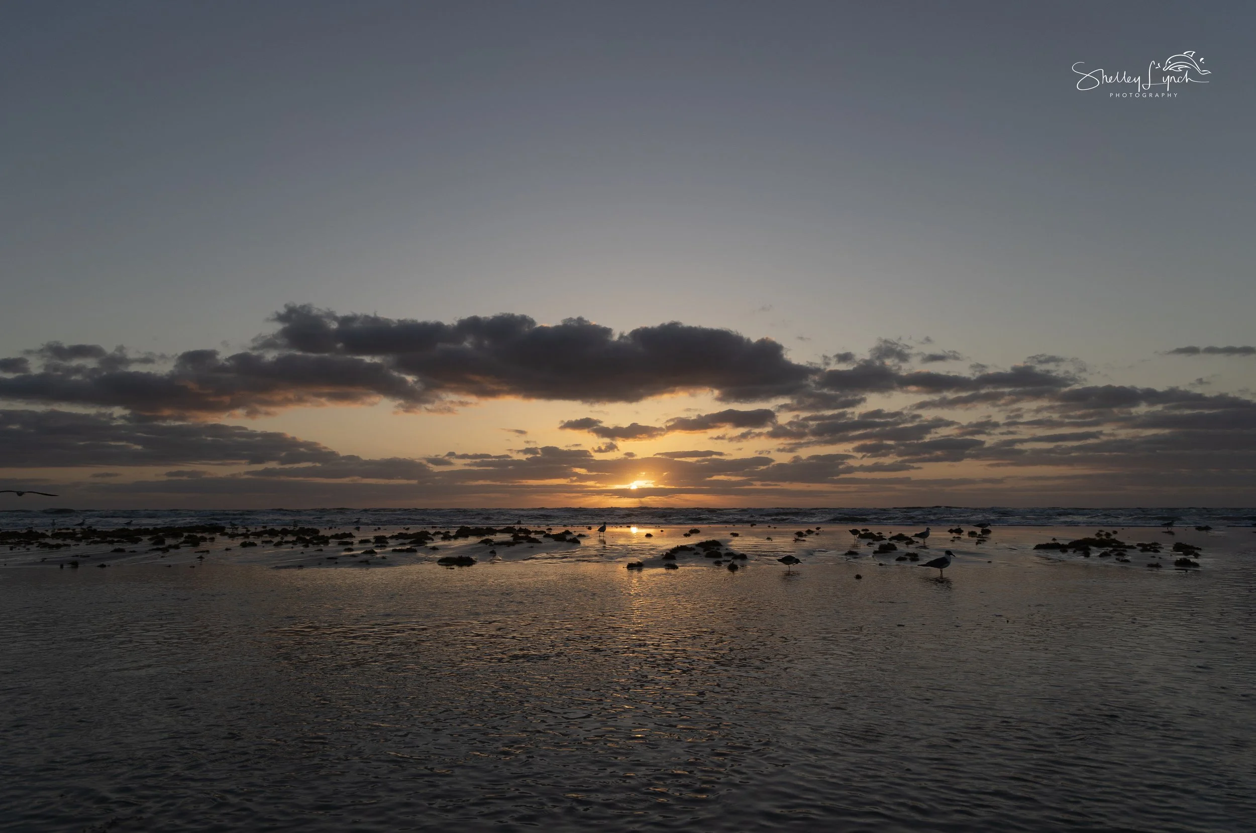 When the sun came up, the raining golden light was absolutely breathtaking. While the flock was looking for food in the seaweed a pigeon couple flew in to join in the morning ritual.