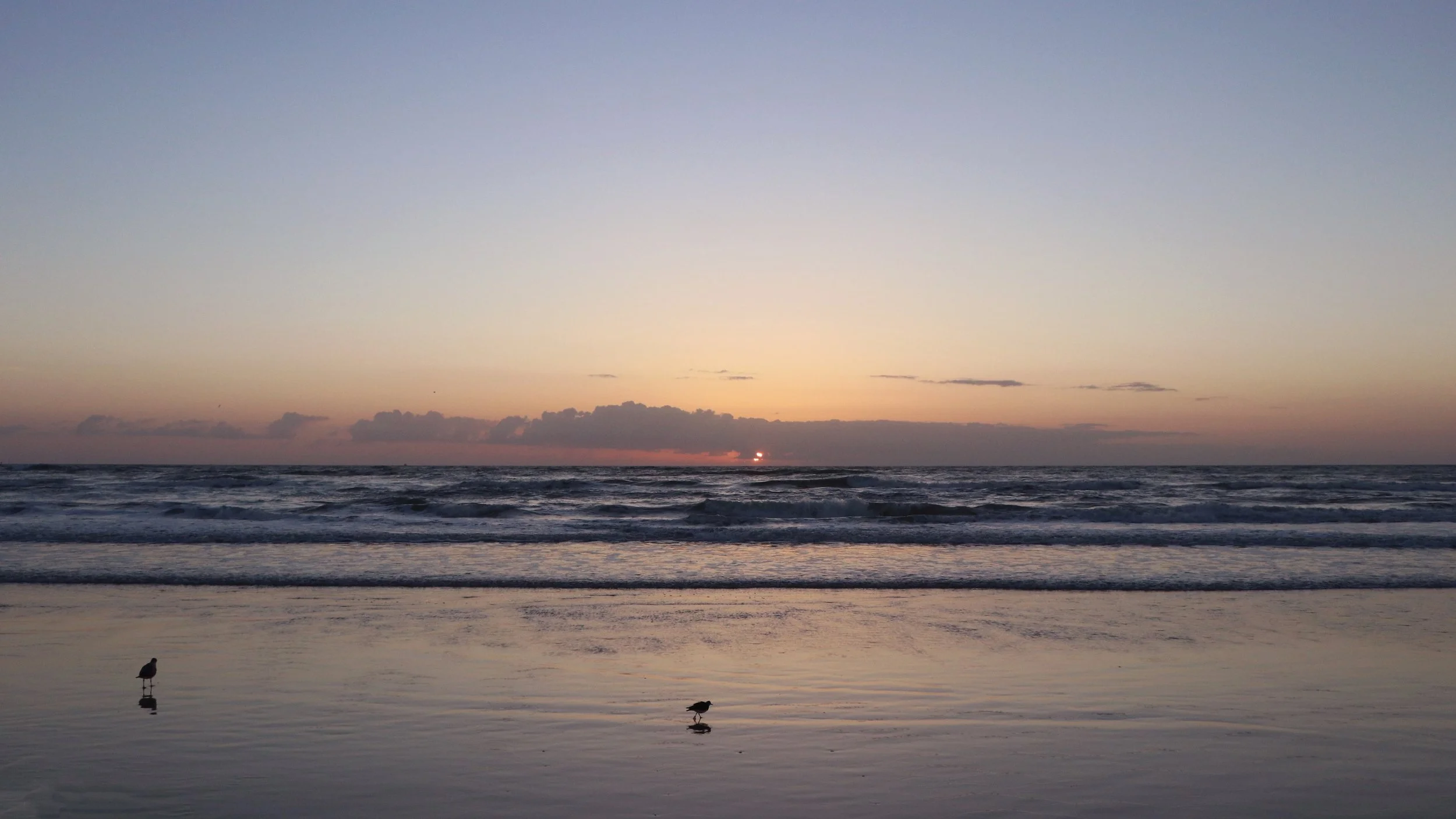 The wind is starting to ease up but the ocean was still churning like a walking machine. The sun came up from behind the clouds with a golden glow. A small flock of young seagulls flew in to chat.