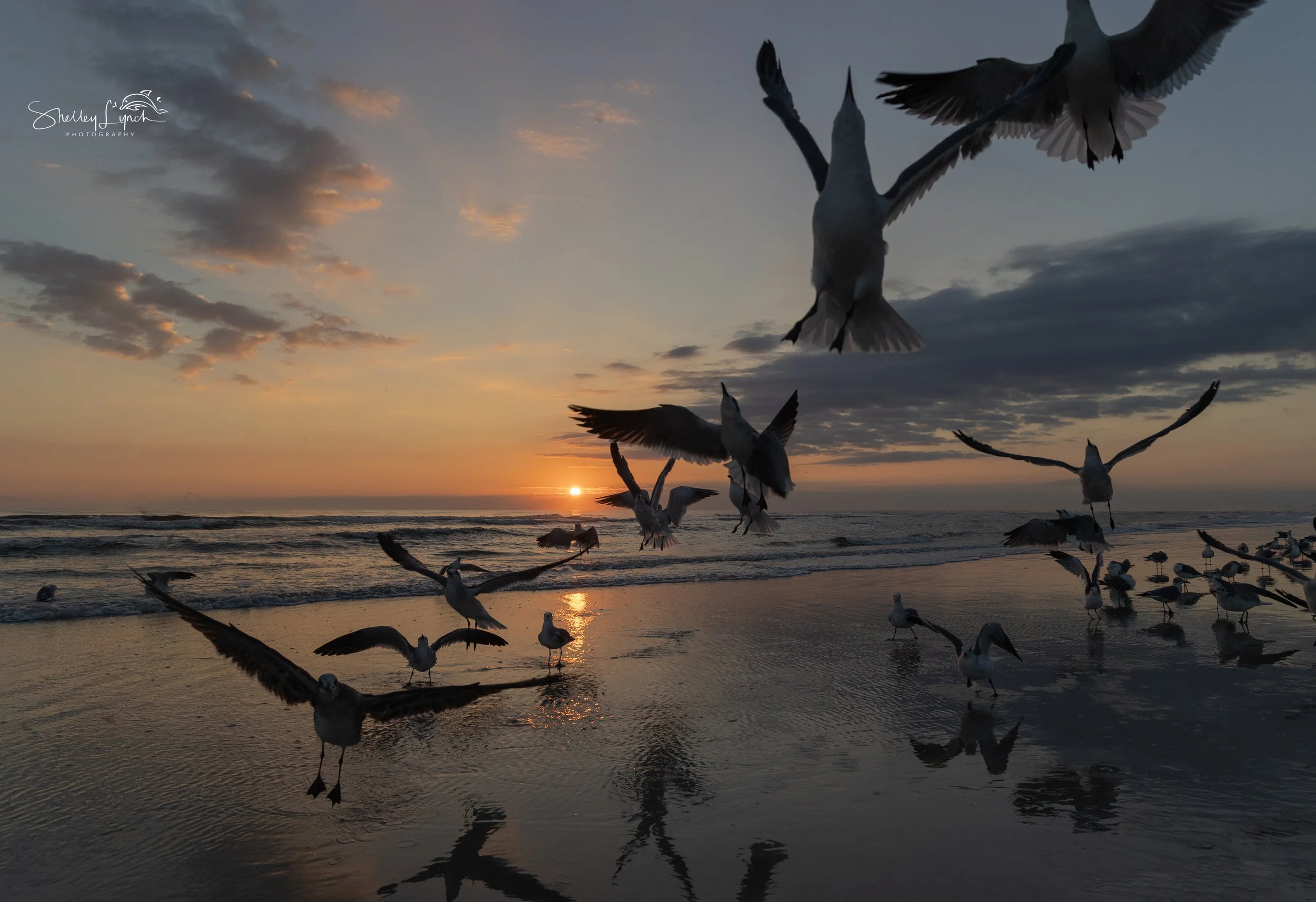 Ahhhhh… Mother Nature brought a gentle, uplifting start to the day.Soft sunrise colors stretched across the sky, painting gold on the calm ocean. Long before the sun broke the horizon, the flock gathered early along the shoreline, chattering and splashing as though warming up for the day ahead.