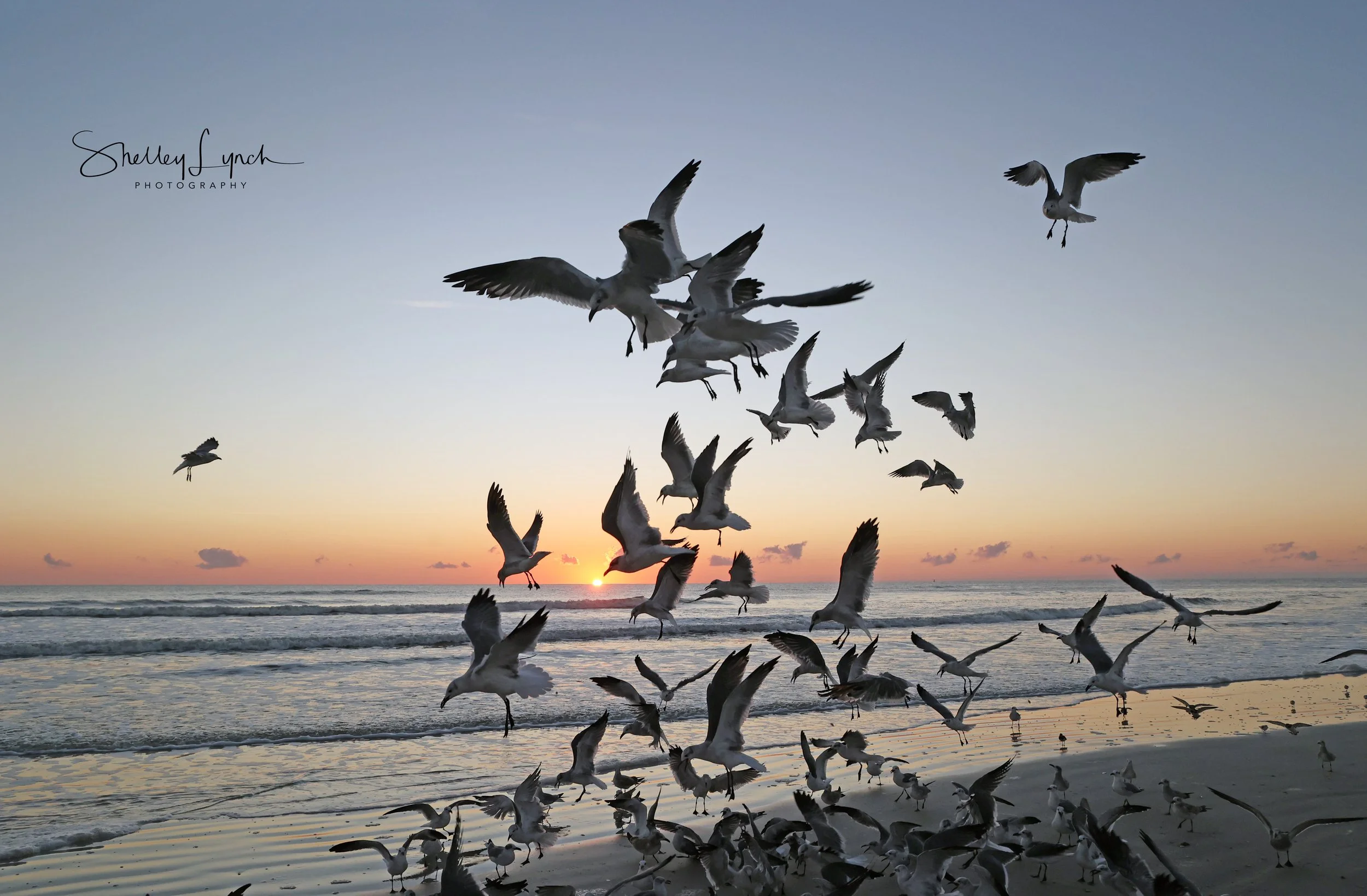 For a long while the morning was very quiet, but as the sun came up the flock of gulls flew in fast and chatty! They hovered around the sun pointing their beaks at the big ball of light.