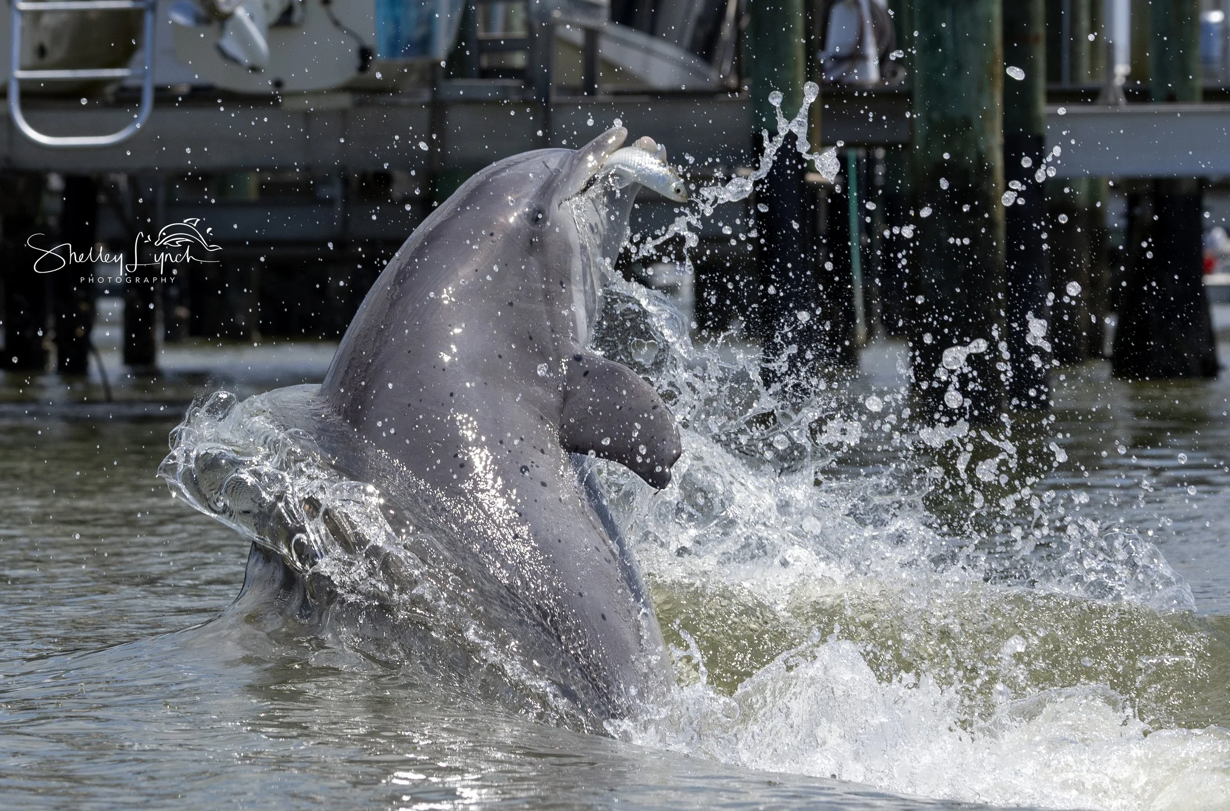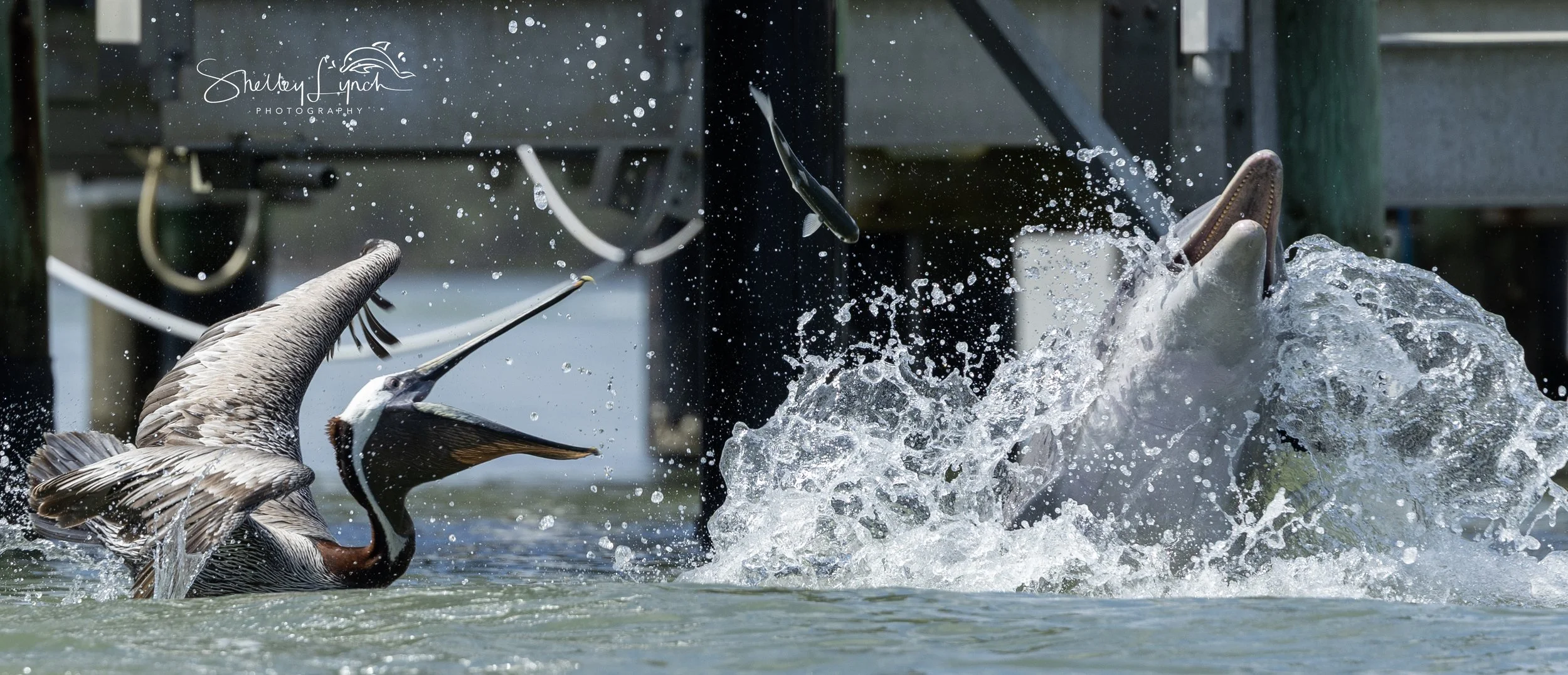 They grabbed some snacks and hung out with the flock of pelicans, all gathered in the mosh pit hoping to snag a fleeing mullet. The three dolphins didn’t interact much with each other, but they shared the space and enjoyed a peaceful, cooperative lunch.
