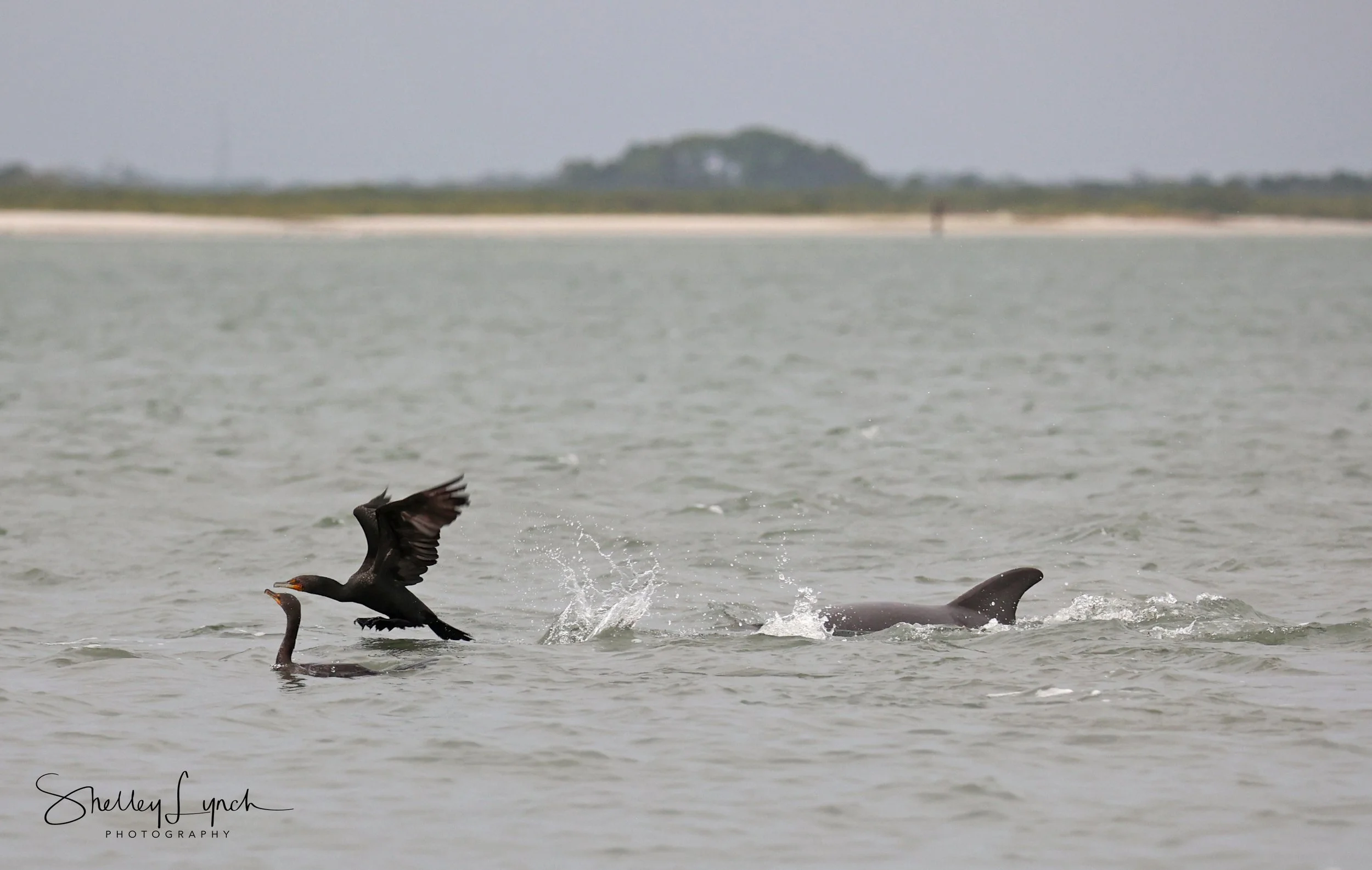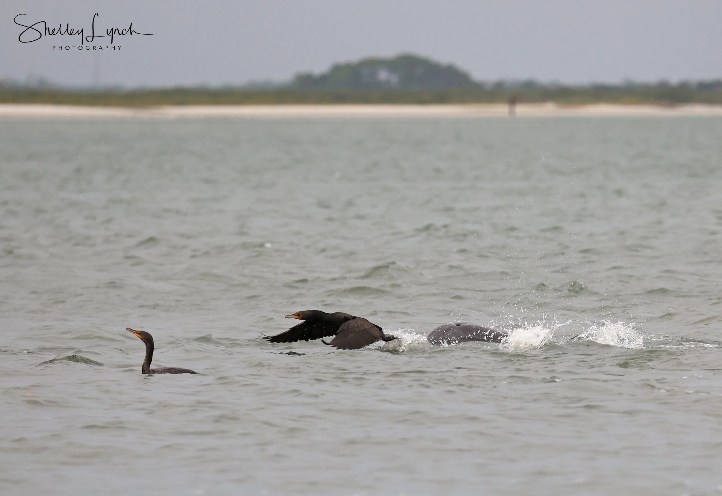 Dolphins love to play with the birds and today was one of those days where they were having blast teasing the cormorants. The cormorants would come flying out from under the water with a dolphin giving it a boop.