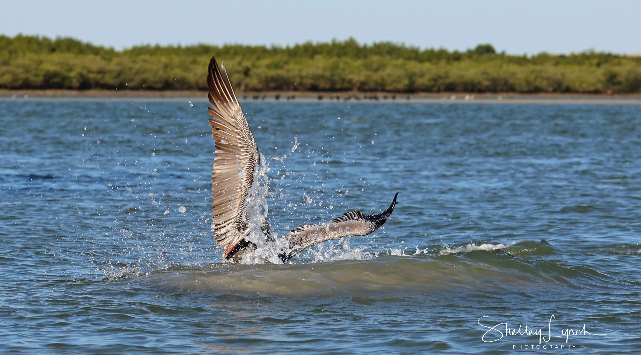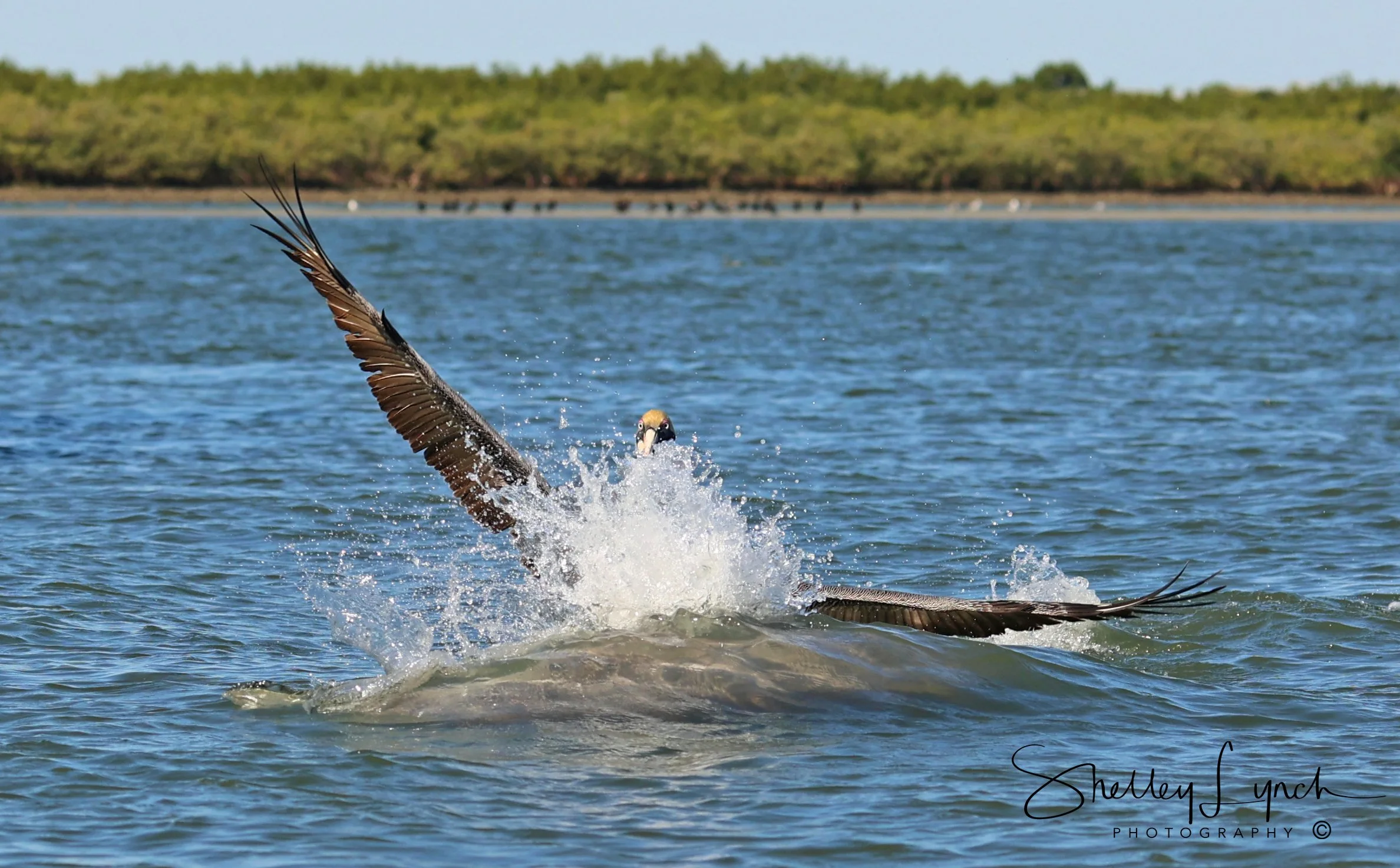 This couple spent a lot of time hanging out close in between high speed chases for fish. The dolphin was making a huge wake which seemed to be soaking the pelicans but he stayed in mix grabbing snacks. More photos showing the wall of water coming in the next post.