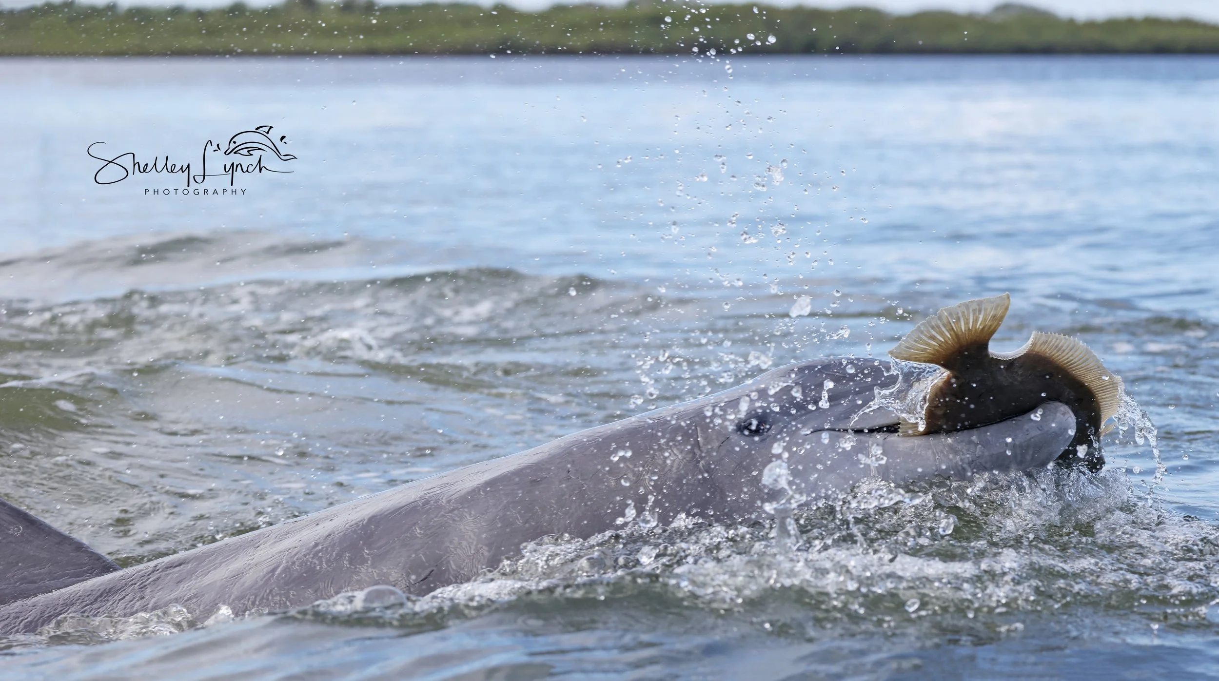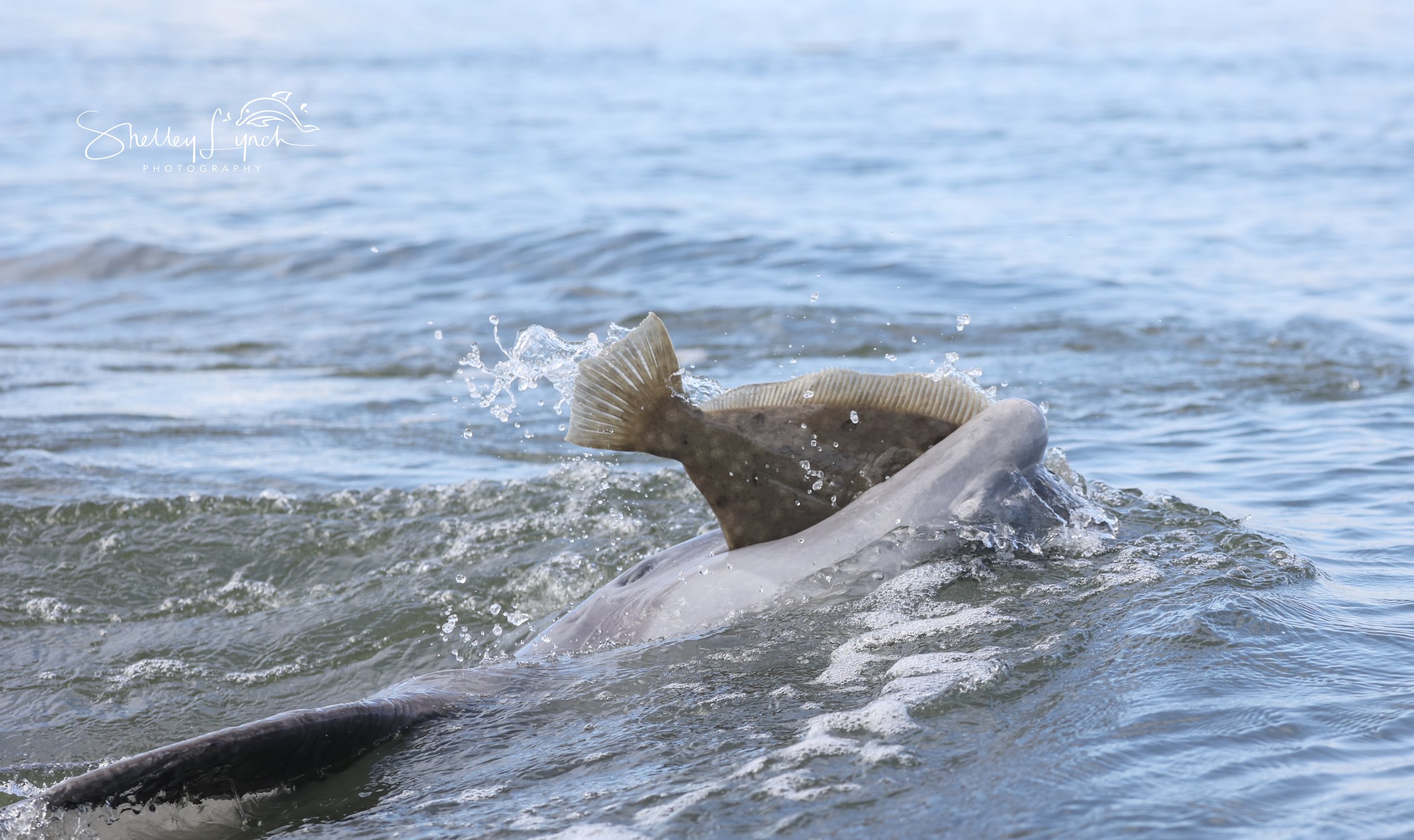 Daniko, a male dolphin, caught a flounder and swam by nice and slow to show it off. He kept glancing over as if to make sure his prize was properly photographed.