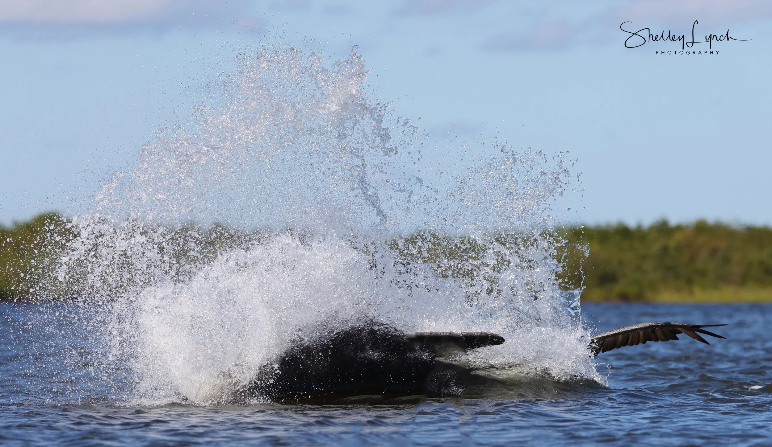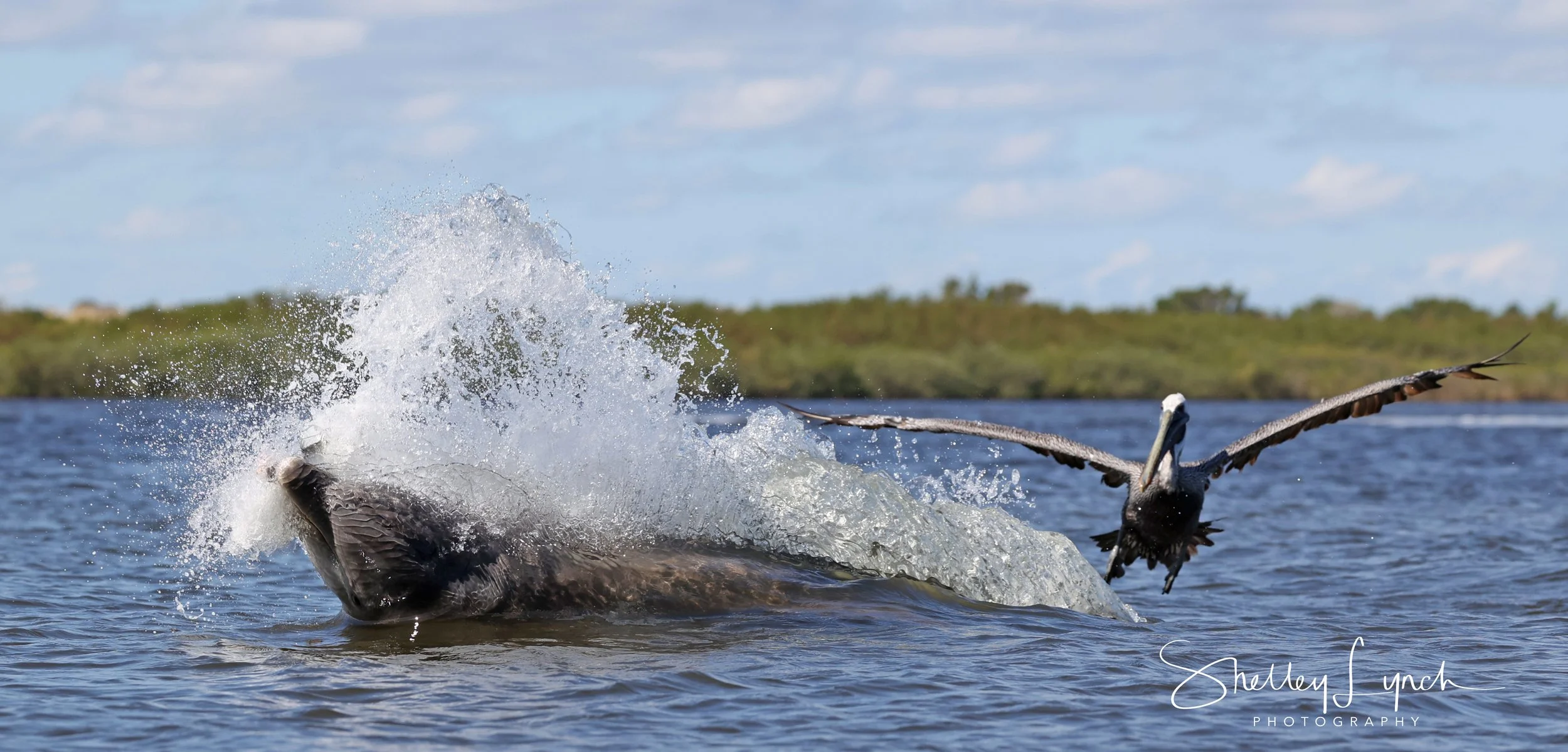 The pelicans got drenched in the huge wall of water but that didn’t stop them from trying to catch a fish escaping the dolphin.