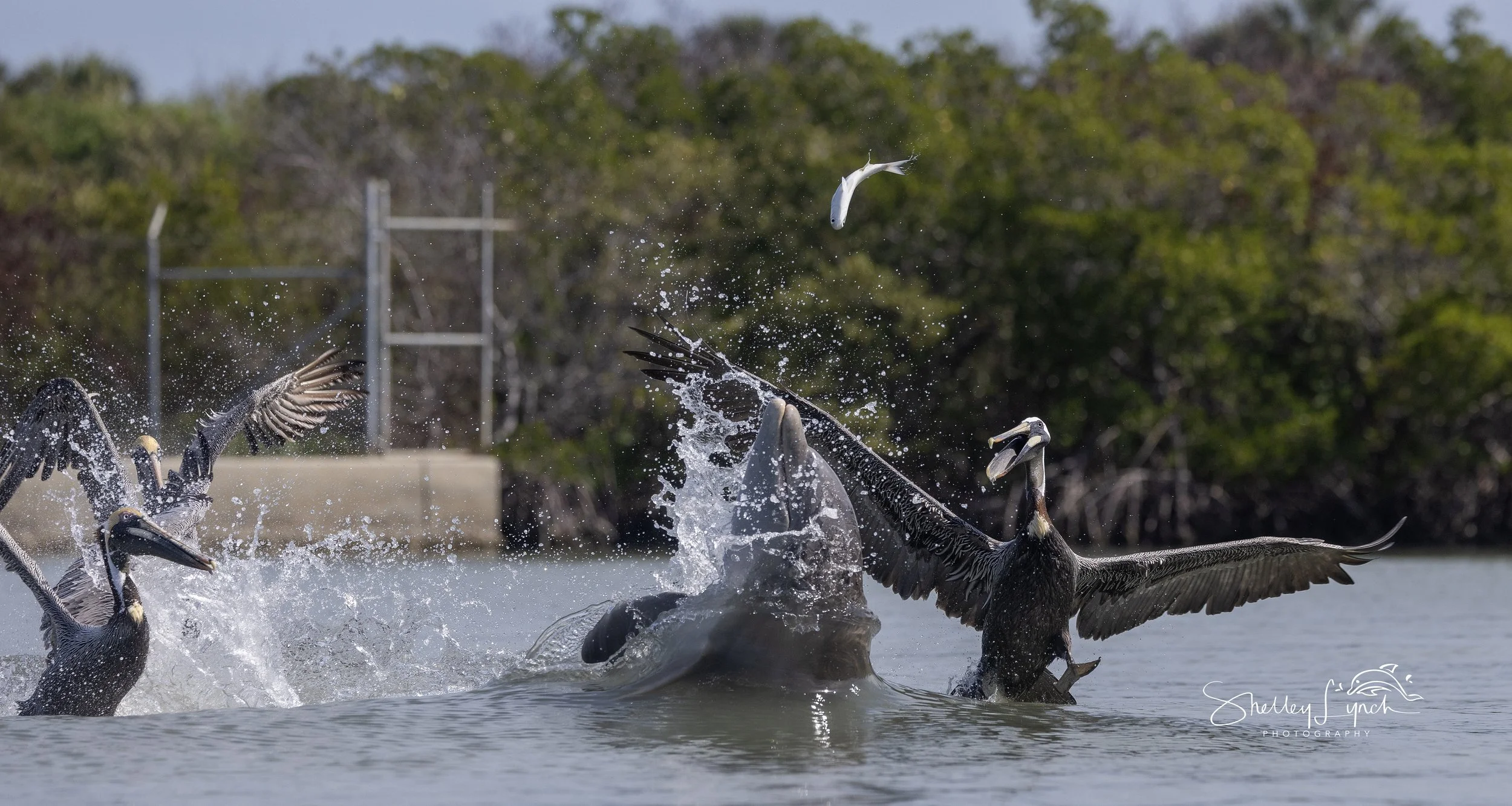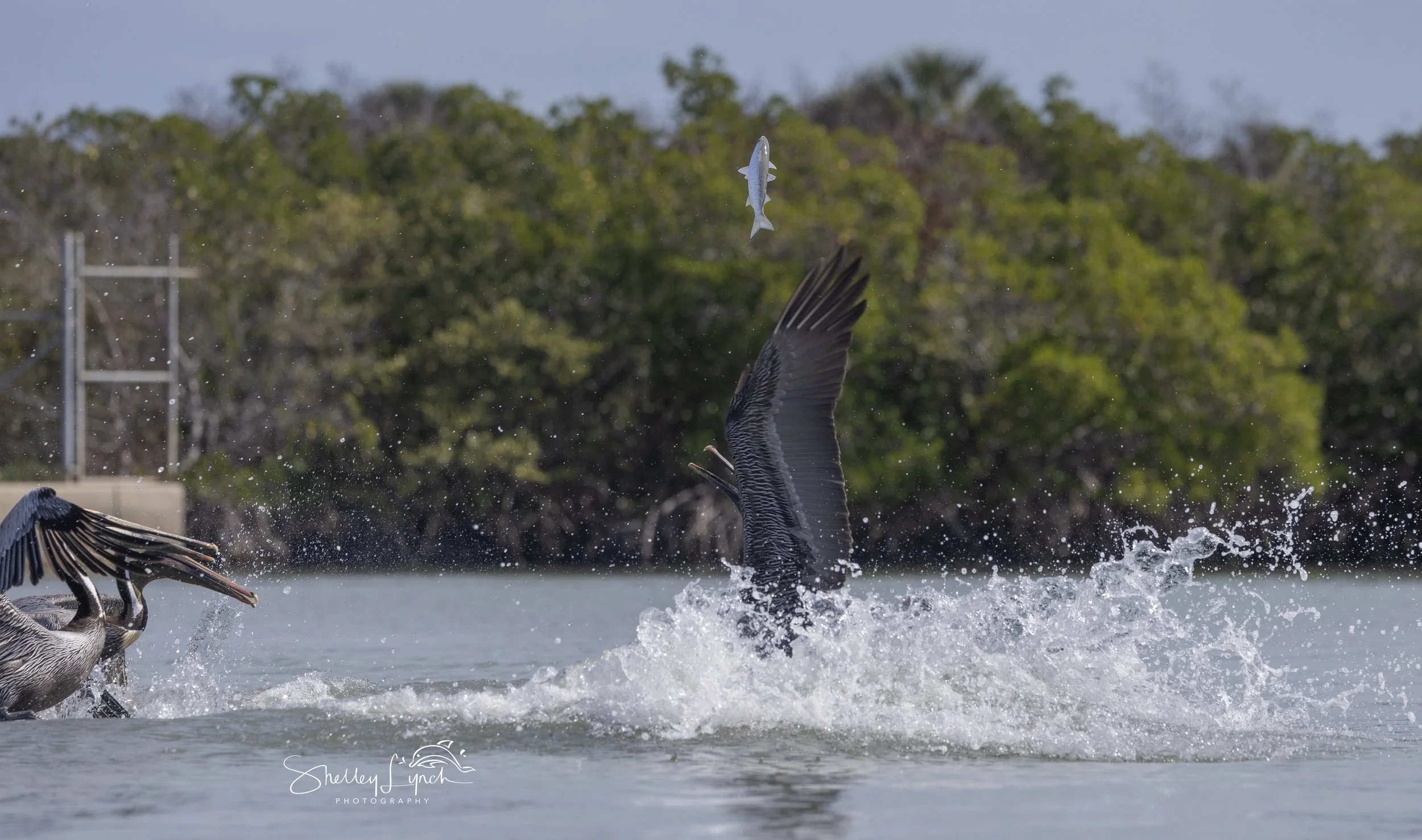 The first 2 photos you’ll see a mullet high in the air. Momma Sarabi tossed a mullet up super high and watched the pelicans duke it out for the fish.